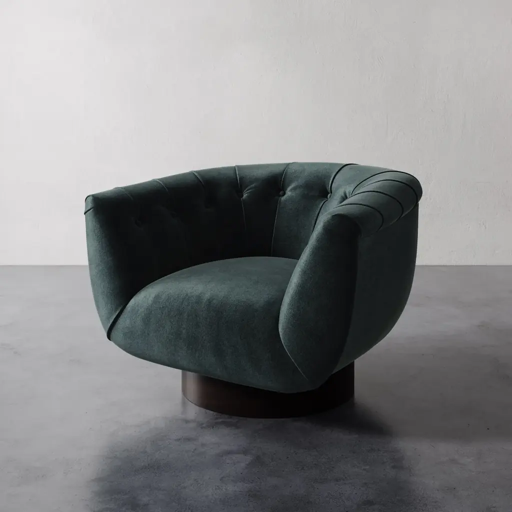 The Lune Swivel Chair from Lemieux et Cie is a masterful expression of sculptural comfort, its perfectly rounded form embracing the body with the same enveloping ease as the great Danish Modern chairs of the 1940s and ’50s. With its meticulously tailored, tufted back rests atop a discreet swivel base, this piece moves effortlessly within a space, offering both versatility and an undeniable sense of design pedigree.The Lune Swivel Chair is handmade by skilled artisans in North Carolina