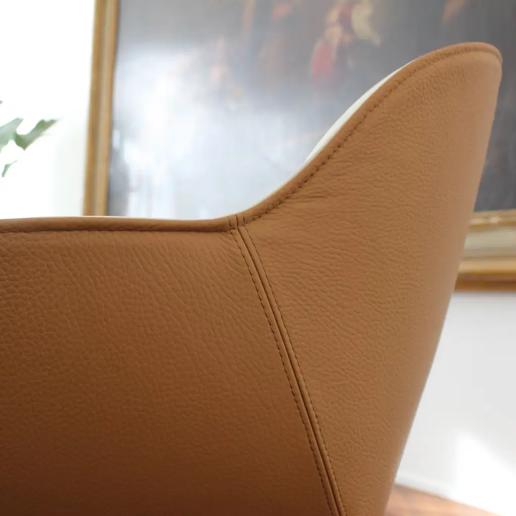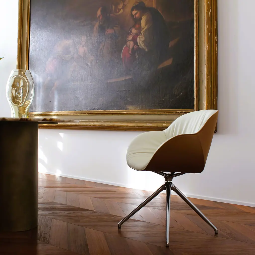 An enveloping padded shell reminiscent of a cocoon and luxuriously covered by hand in pinched leather marks this exclusive armchair. Equally stunning in either residential or professional contexts, it boasts a combination of Classic Real Piel RP® and Dollaro Real Piel RP® leathers for a superb sartorial statement counterbalanced by the industrial-style four-spike base in polished die-cast aluminum.