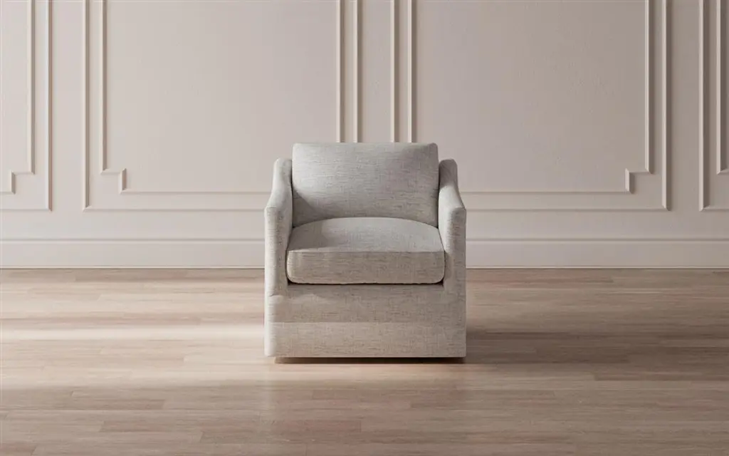 Classically inspired with modern appeal, the Madeline swivel chair brings a stylish touch to any modern or traditional home. Tailored upholstery extends to the floor on this timeless, versatile piece. Soft yet supportive, the seat cushion is designed for supreme comfort, with a foam core surrounded by a blend of fiber, down, and feather fill. Choose from a variety of upholstery options, including linen, velvet, and performance fabrics.