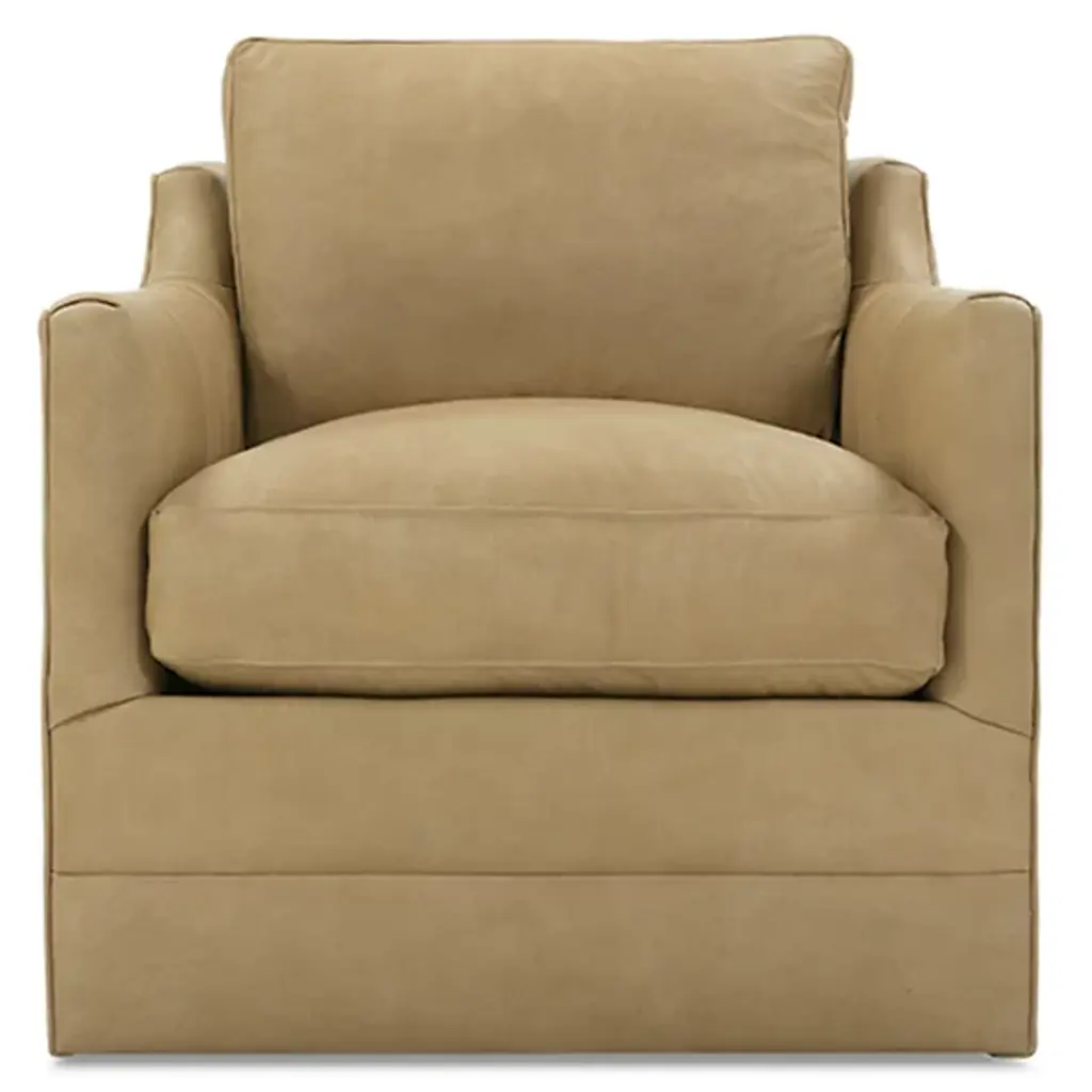 The Madeline Leather Swivel Chair from Rowe Furniture provides convenience, style, and comfort to any space it adorns. The cloud cushion, which is made to enhance both comfort and support, is flippable to increase this effect, and the whole thing is upholstered in leather with a zipper on the back. The swiveling base lets you change your position to look at different parts of whatever room you're in or the people in it.