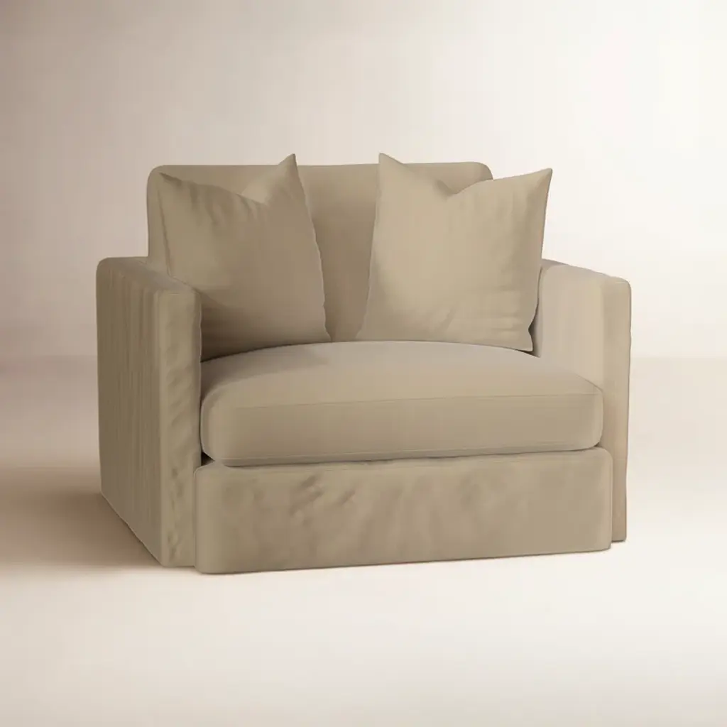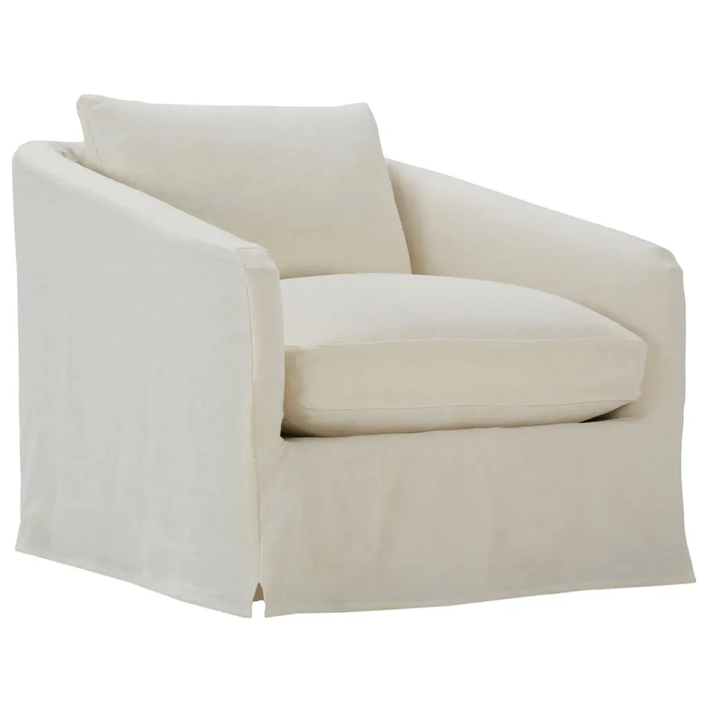 The Madeline Slipcovered Swivel Chair from Rowe Furniture brings effortless style and versatile comfort to any space. Its relaxed slipcover drapes loosely over the structured base, lending a laid-back yet sophisticated look. Crafted with a durable FSC-certified hardwood frame and Greenguard-certified for low emissions, this chair is as sustainable as it is inviting. A reversible Cloud Cushion enhances longevity, while the gently angled back and enveloping arms offer cozy support. With smooth swiveling motion, it easily pivots for adaptable, everyday comfort.