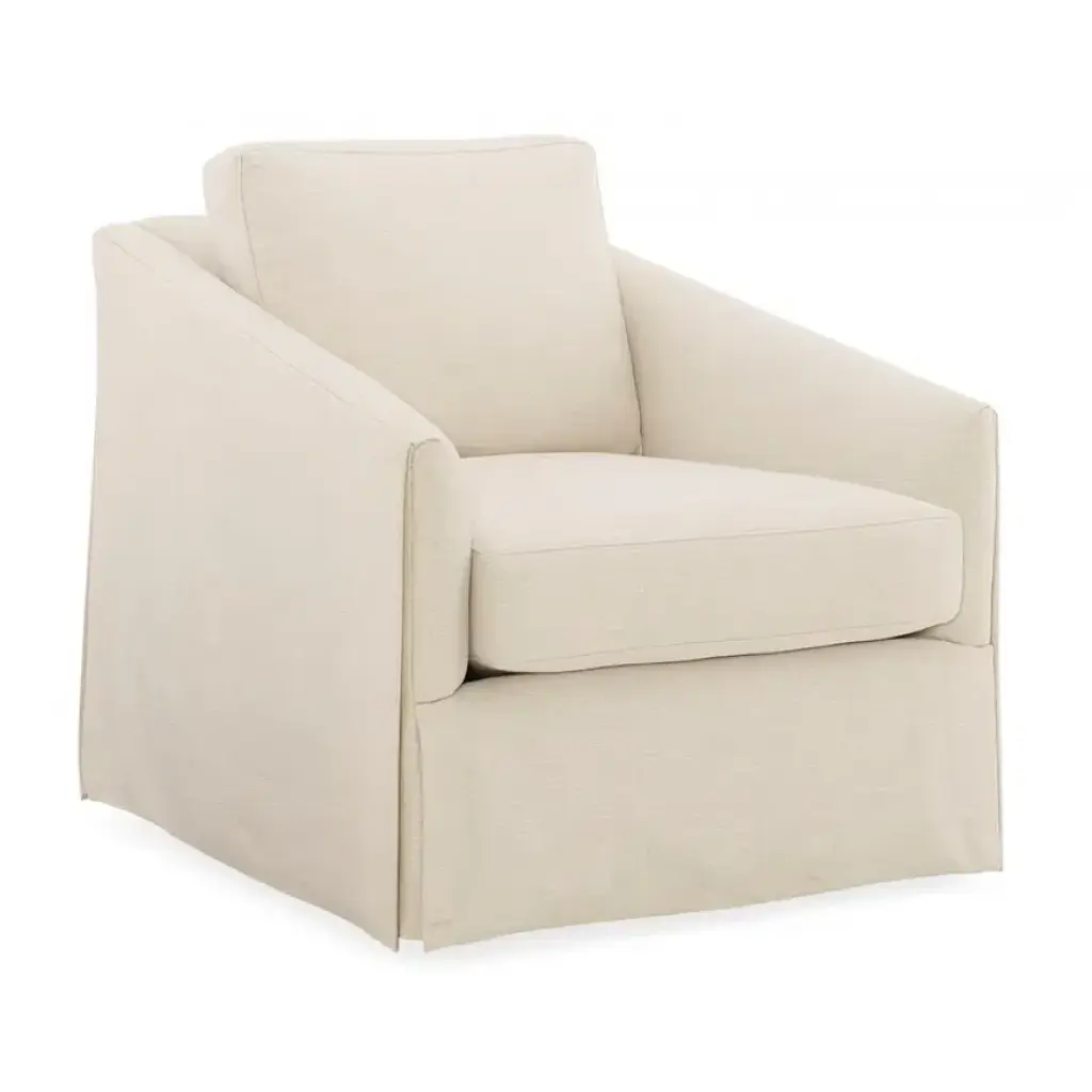 The Madeline Slipcovered Swivel Chair from Rowe Furniture brings effortless style and versatile comfort to any space. Its relaxed slipcover drapes loosely over the structured base, lending a laid-back yet sophisticated look. Crafted with a durable FSC-certified hardwood frame and Greenguard-certified for low emissions, this chair is as sustainable as it is inviting. A reversible Cloud Cushion enhances longevity, while the gently angled back and enveloping arms offer cozy support. With smooth swiveling motion, it easily pivots for adaptable, everyday comfort.