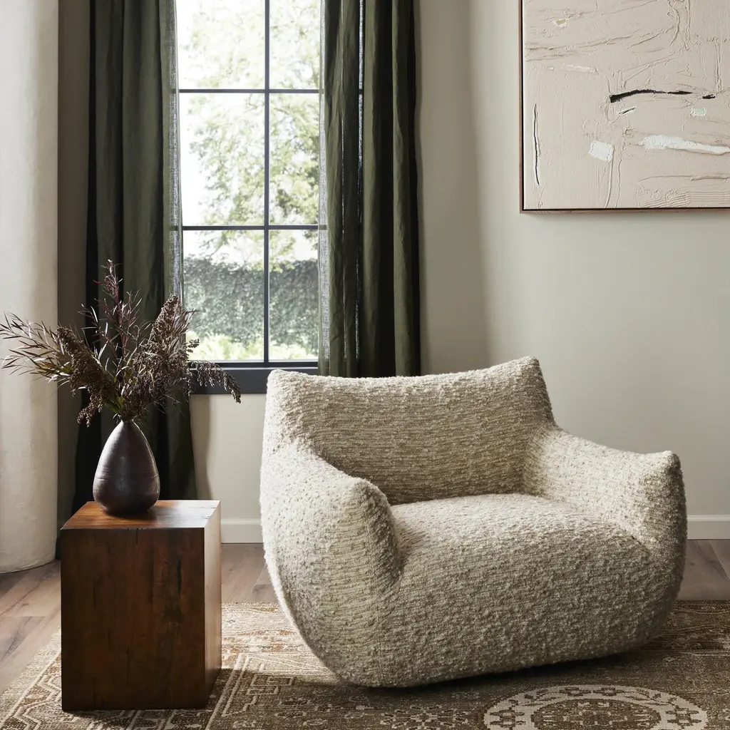 The Margot Swivel Chair by Four Hands captures the essence of effortless sophistication. Its sculptural silhouette, enveloping form, and smooth 360-degree swivel create a chair that feels as elegant as it is inviting. Designed to complement both modern and transitional interiors, Margot blends plush comfort with refined craftsmanship, transforming any corner into a destination for conversation, reading, or quiet reflection. The subtly curved back and deep seat provide generous support, while the concealed swivel base allows for seamless movement and interaction within the room. Its proportions feel tailored yet relaxed, making it a perfect addition to a living room, bedroom, or lounge setting. Every detail of the Margot Swivel Chair speaks to Four Hands’ dedication to quality and timeless design. The gently rounded profile softens the lines of contemporary spaces, while the plush cushioning ensures hours of comfort. Available in a selection of neutral hues, Margot layers easily into any palette, whether surrounded by warm woods, metallic accents, or organic textures. Perfectly suited for city apartments, coastal homes, or modern retreats, the Margot Swivel Chair by Four Hands is more than a seat — it is an experience in comfort and style. With its enveloping shape and fluid motion, it turns the simple act of sitting into a statement of ease and grace. Crafted for those who value both beauty and function, Margot brings warmth, balance, and serenity to every space. A timeless piece that feels as good as it looks, it embodies the very spirit of abc carpet & home — modern design with soul.