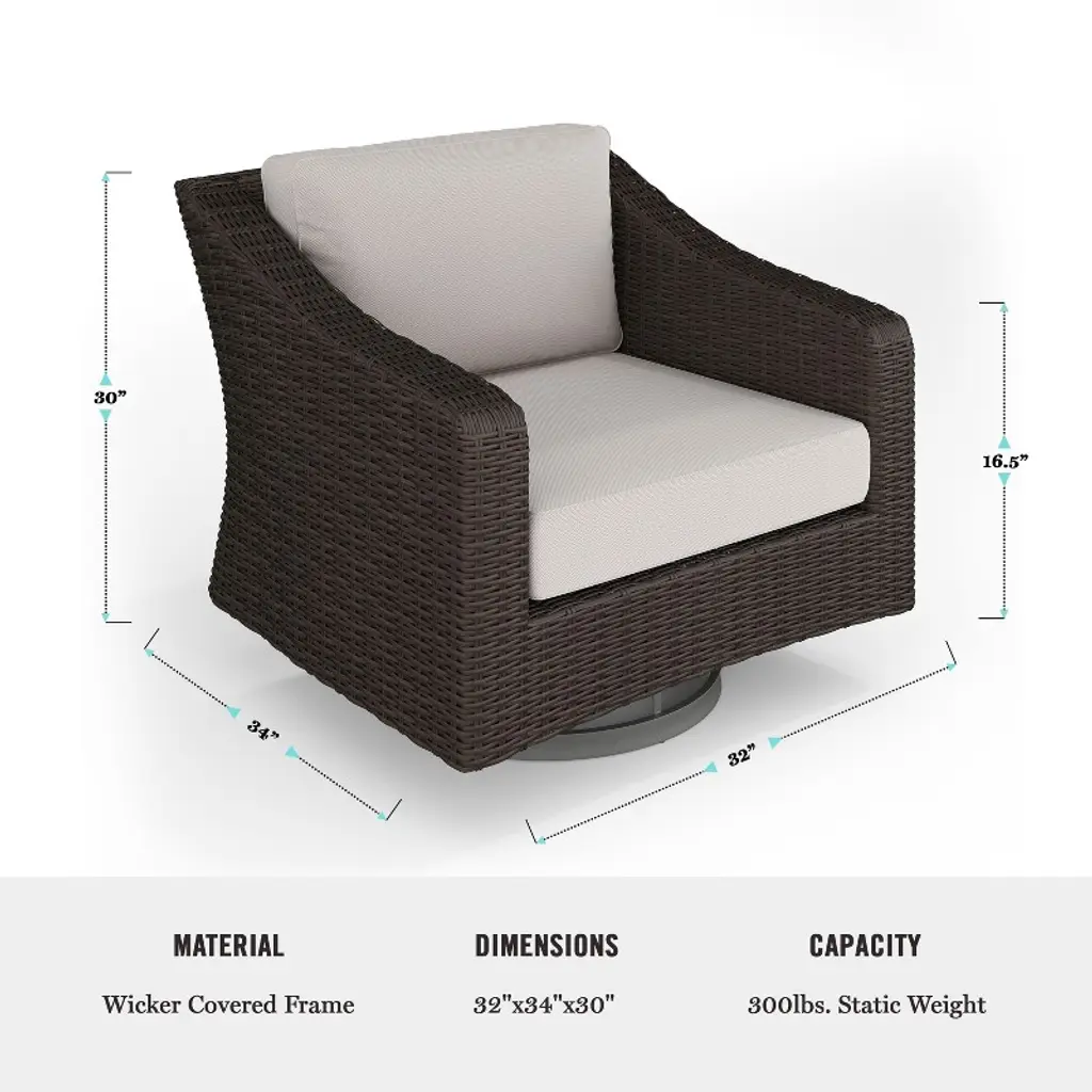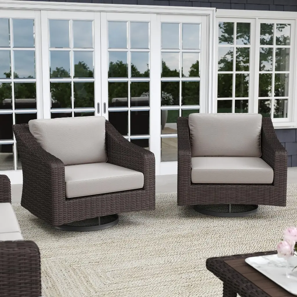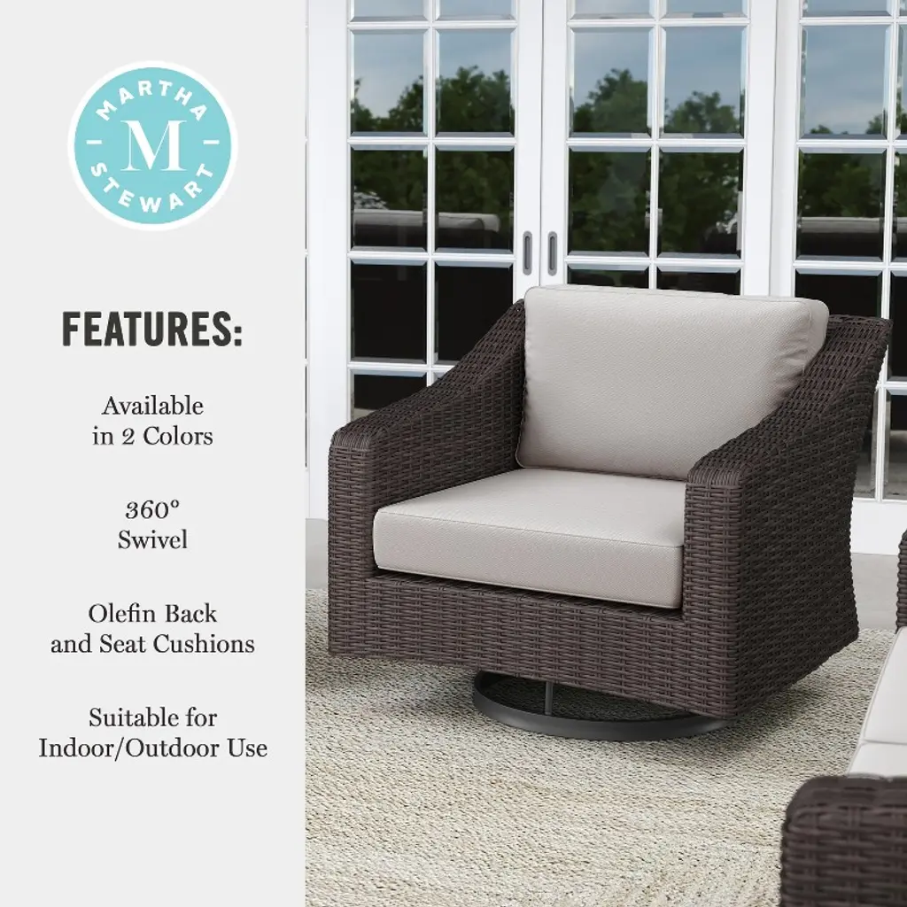 Refresh your patio space with the chic style and cozy comfort of this set of two Martha Stewart Bedford Patio Swivel Chairs. Generously padded and sturdily built, these versatile swivel patio chairs are ideal for reading al fresco, enjoying cocktails with friends, or simply relaxing. Featuring a 4.5” thick all-weather seat cushion, luxurious back cushion, and integrated armrests, these hand-woven wicker chairs will cradle you in comfort while you make the most of those gorgeous, sunny days or starlit evenings. These chairs are ideal for casual conversations or admiring every picturesque angle of your indoor-outdoor space with the integrated 360° swivel functionality. Part of our Bedford collection, these chairs pair wonderfully with the coordinating pieces allowing you to craft a custom collection that fits your entertaining needs. Setup consists of simply adding the swivel bases, with tools included and instructions, and placing the cushions while upkeep is equally hassle-free