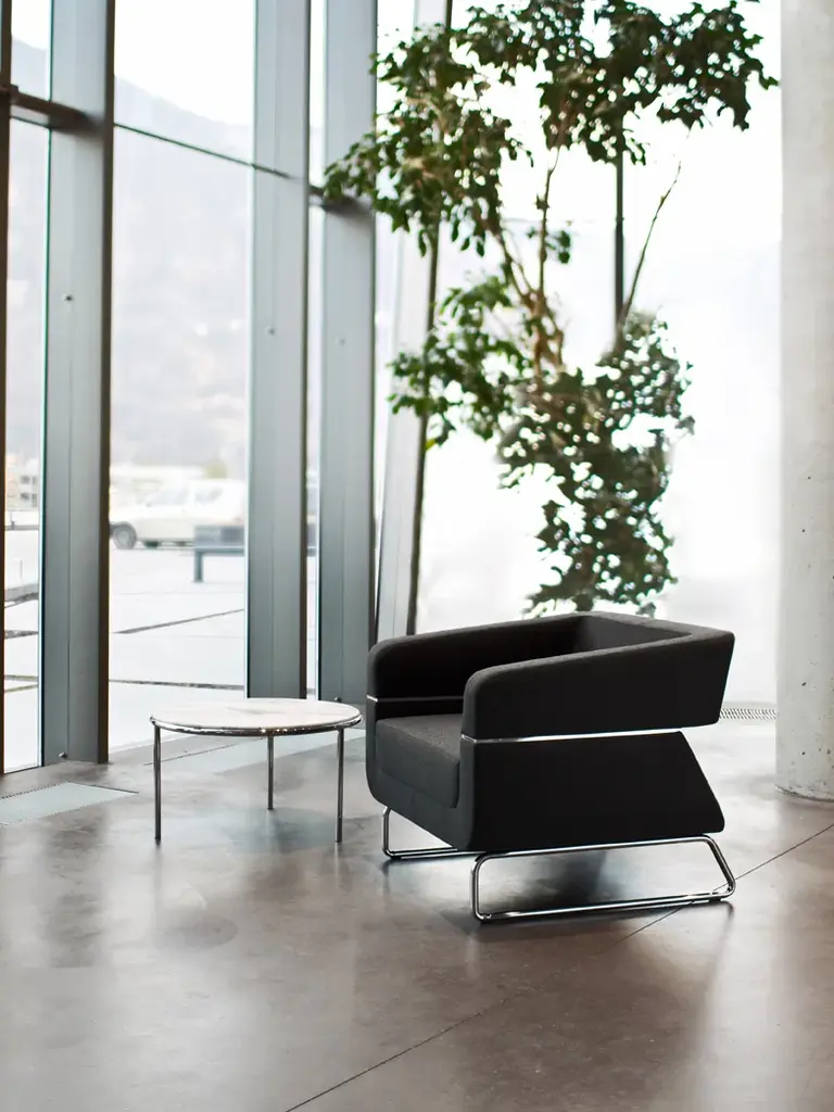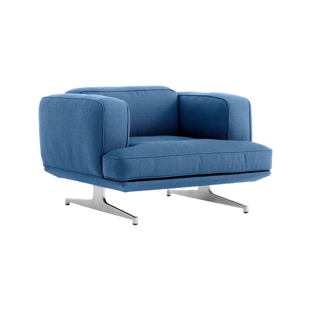 Dimensions: H: 29 9 ⁄ 16” L: 33 1 ⁄ 4” D: 31 1 ⁄ 4” H: seat 15 3 ⁄ 4”A sofa and armchair with dynamic lines, with a strong and instantly recognisable personality. The structure consists of a wooden frame covered with non-deforming, expanded polyurethane padding of different thicknesses and polyester fibres, with the seat on a plywood panel. The sled base is made of chrome-plated metal; the small armchair is also available with a swivel base and metal spokes. They come with non-removable fabric or leather upholstery.