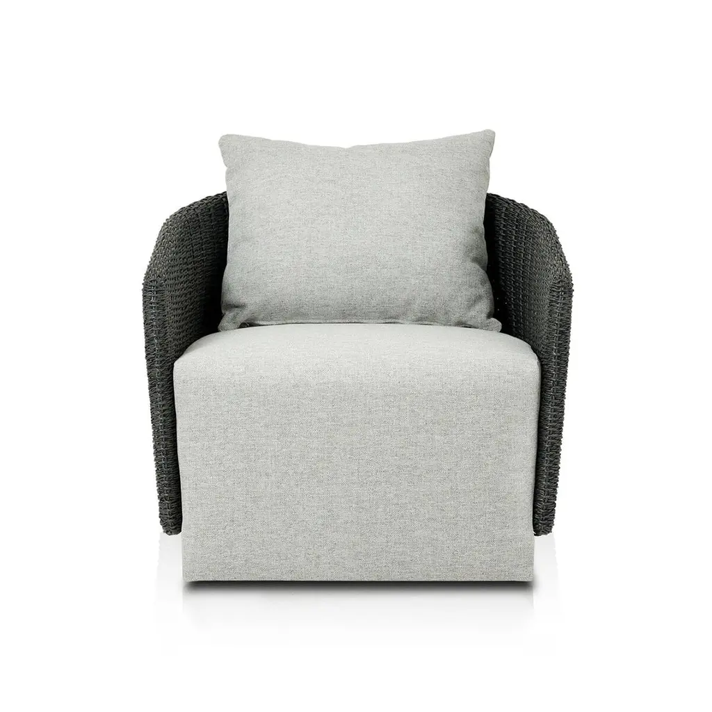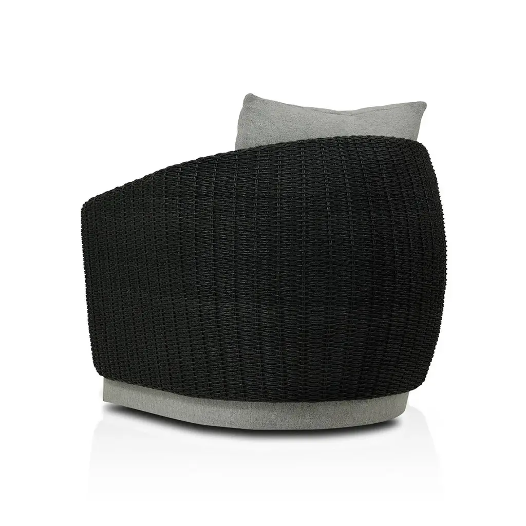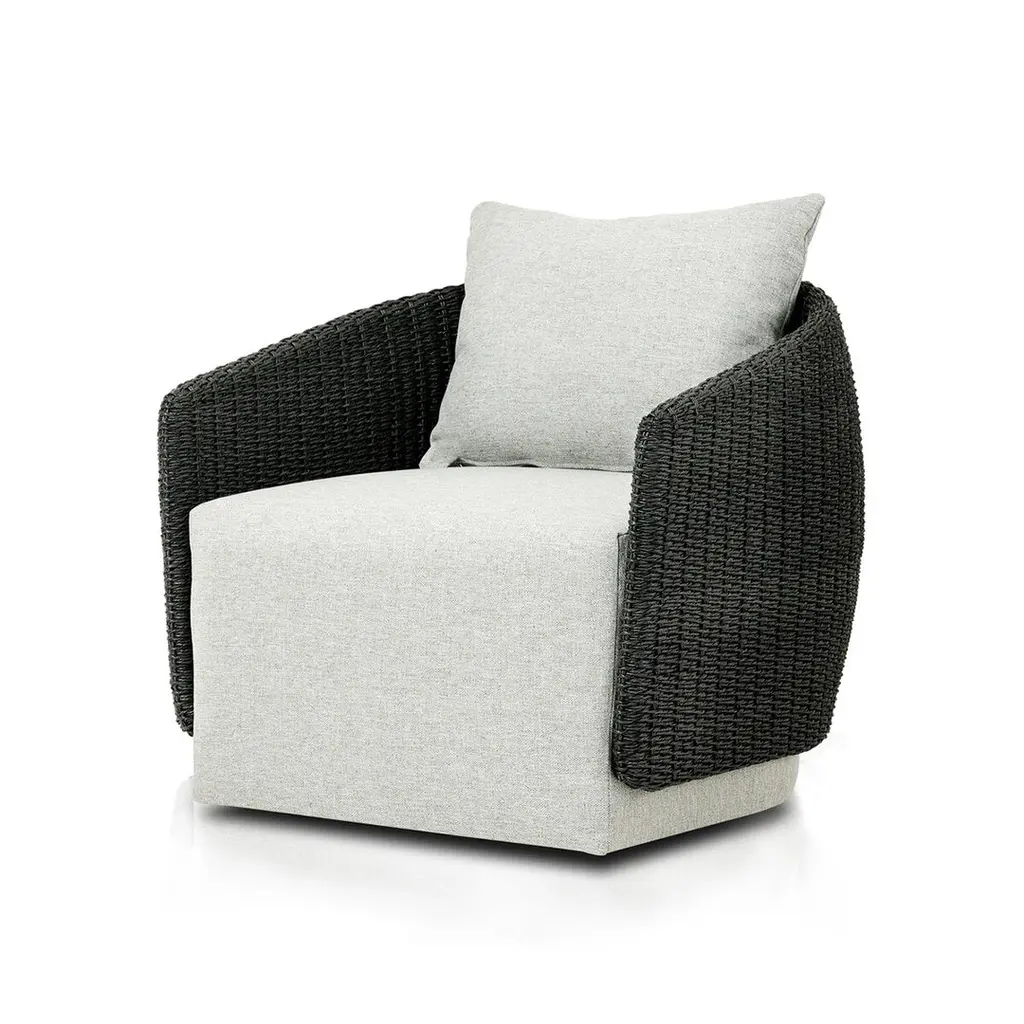 Sustainably made with zero waste, luxurious Italian upholstery places a new and unique spin on indoor/outdoor seating, offering soft, durable fabric that's highly resistant to sun, stains, mold and abrasion. Shell framing of faux hyacinth weaves for extra texture atop a 360-degree swivel. Cover or store indoors during inclement weather and when not in use. Ships In 10-14 Business Days Ships In 10-14 Business Days All-weather cushion Woven back and sides This image is for illustrative purposes only. The colors shown are accurate within the constraints of lighting, photography, and the color accuracy of your screen.