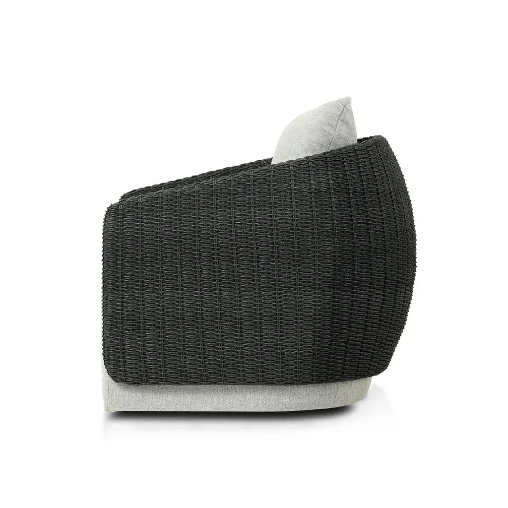 Sustainably made with zero waste, luxurious Italian upholstery places a new and unique spin on indoor/outdoor seating, offering soft, durable fabric that's highly resistant to sun, stains, mold and abrasion. Shell framing of faux hyacinth weaves for extra texture atop a 360-degree swivel. Cover or store indoors during inclement weather and when not in use. Ships In 10-14 Business Days Ships In 10-14 Business Days All-weather cushion Woven back and sides This image is for illustrative purposes only. The colors shown are accurate within the constraints of lighting, photography, and the color accuracy of your screen.
