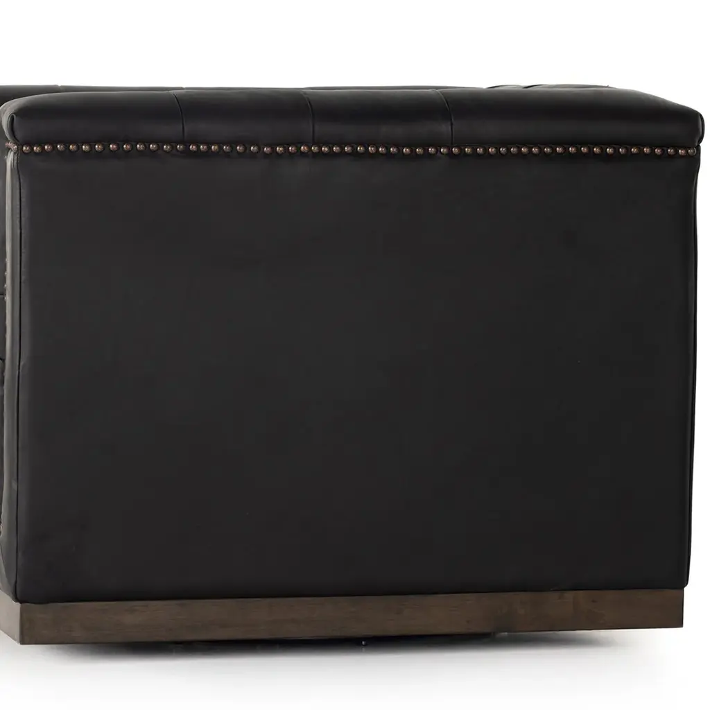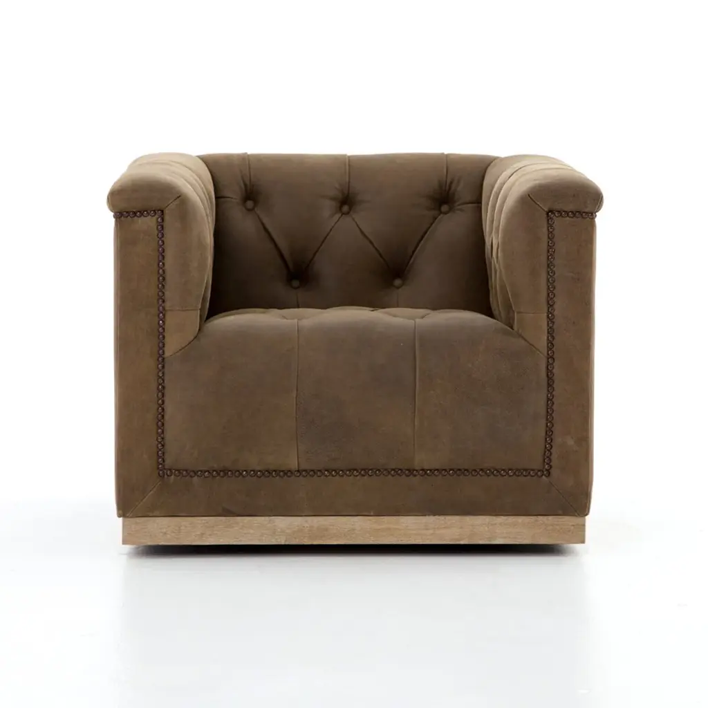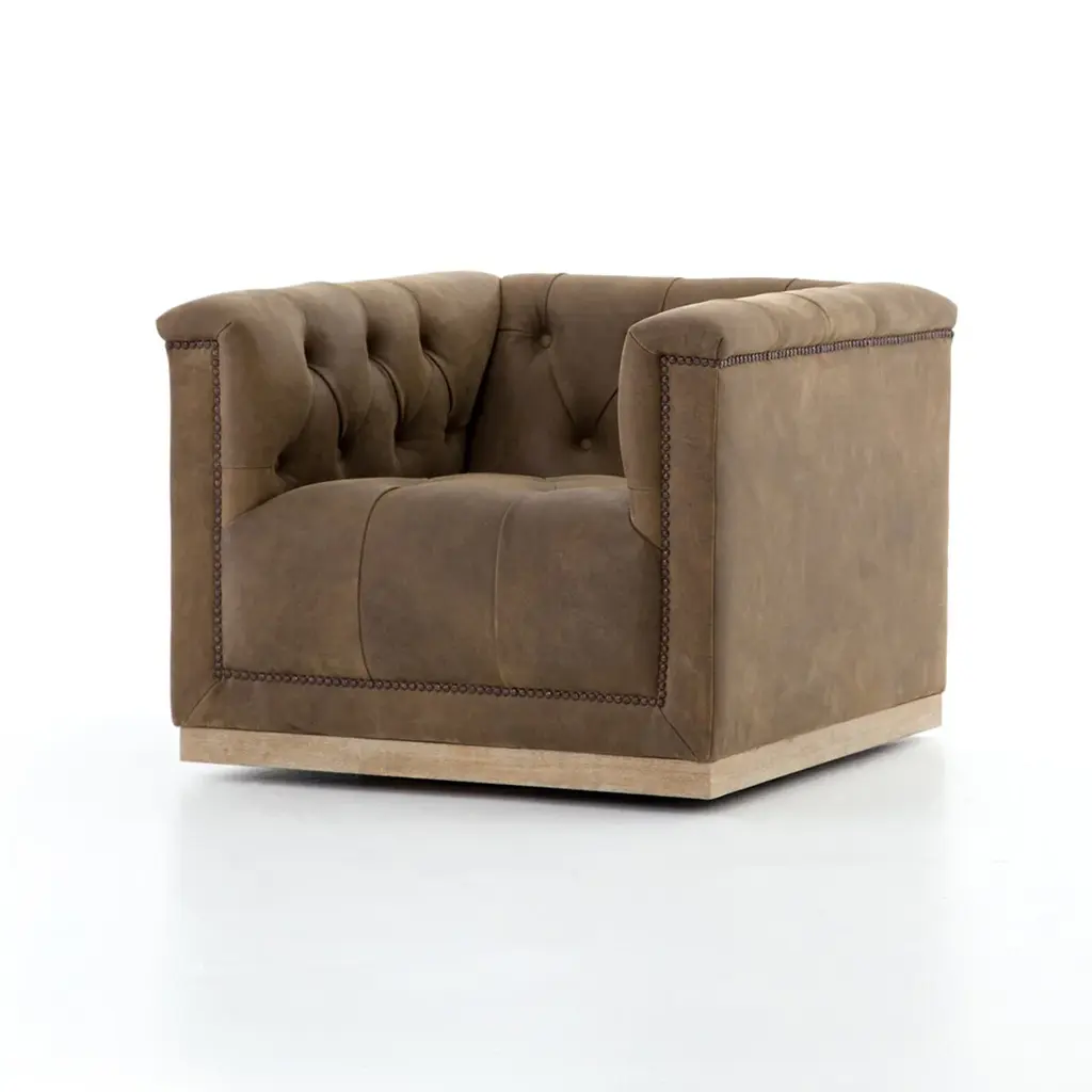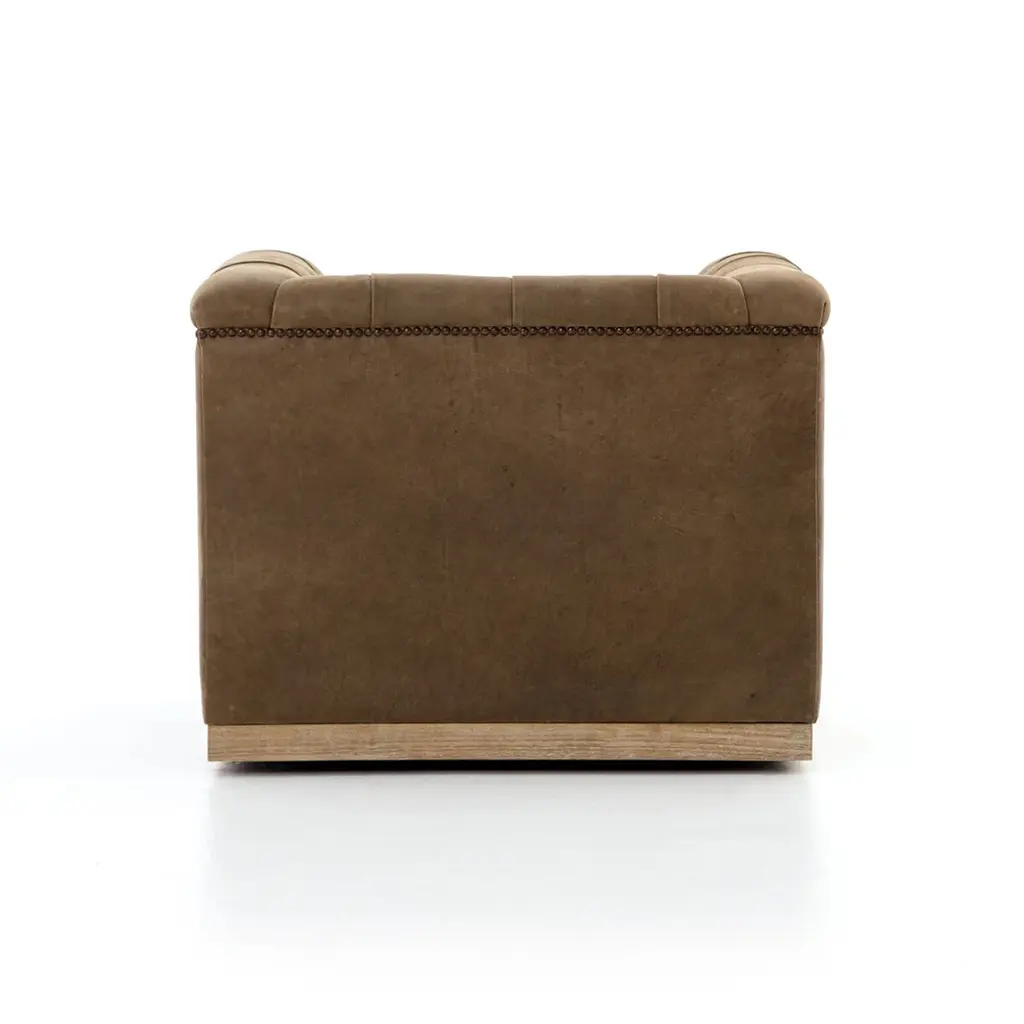 This modern take on the classic library chair is covered in distressed brown-grey leather and mounted on a 360-degree swivel base of whitewashed parawood. In Stock Mid January 2026 In Stock Early December Aged bronze nailhead trim Top grain leather This image is for illustrative purposes only. The colors shown are accurate within the constraints of lighting, photography, and the color accuracy of your screen.