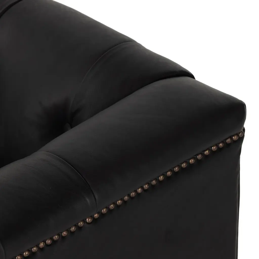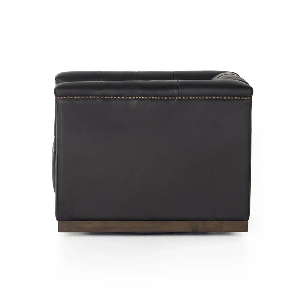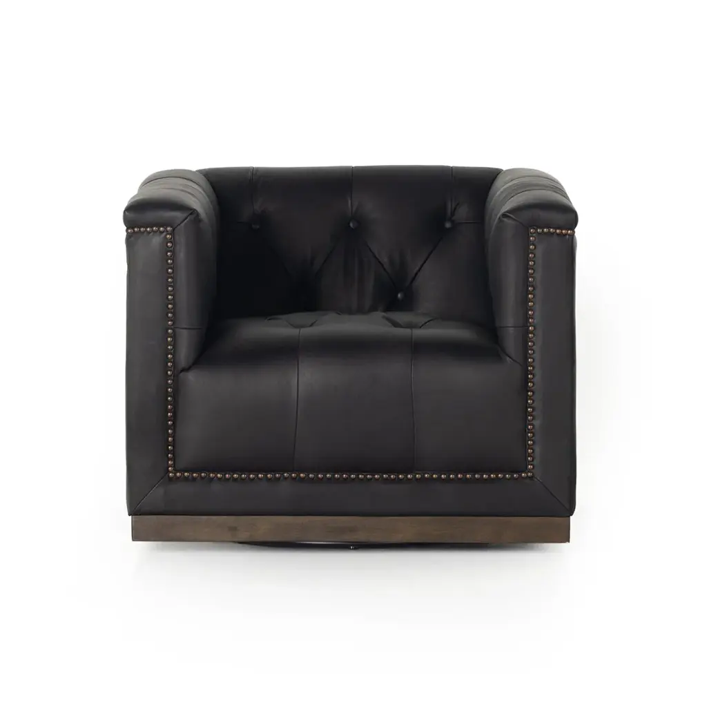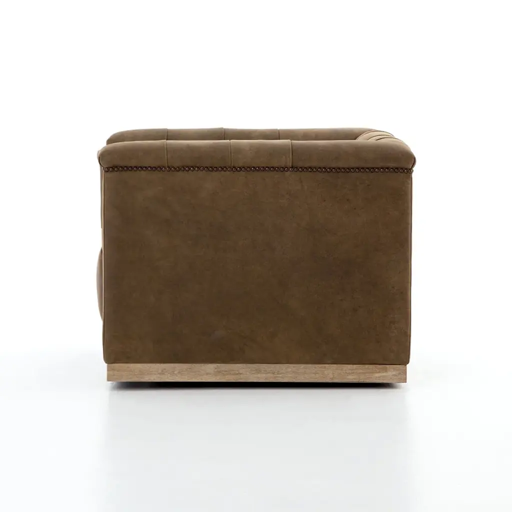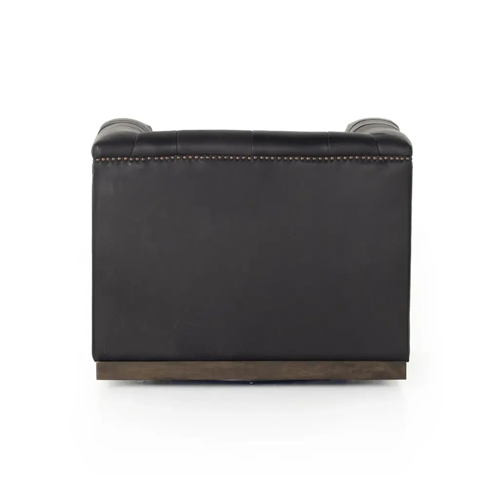 This modern take on the classic library chair is covered in distressed brown-grey leather and mounted on a 360-degree swivel base of whitewashed parawood. In Stock Mid January 2026 In Stock Early December Aged bronze nailhead trim Top grain leather This image is for illustrative purposes only. The colors shown are accurate within the constraints of lighting, photography, and the color accuracy of your screen.