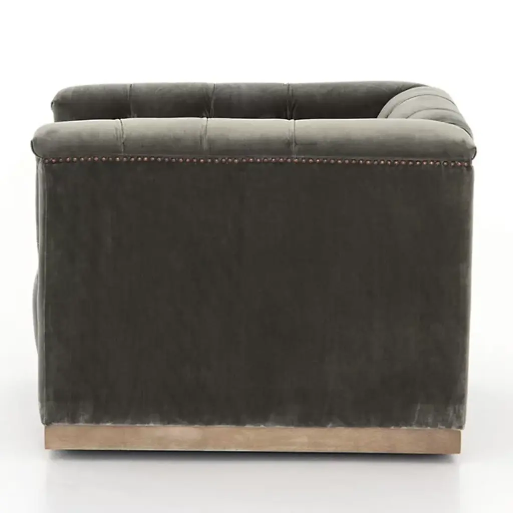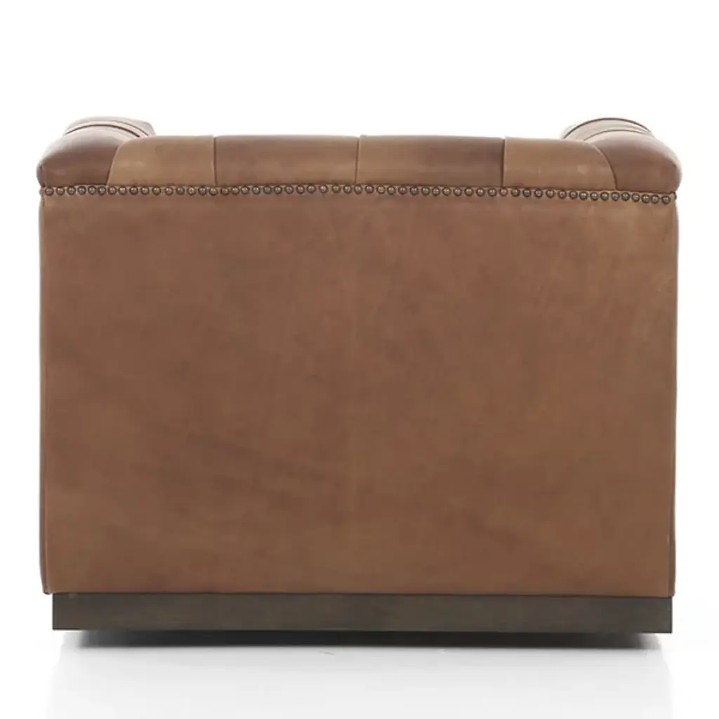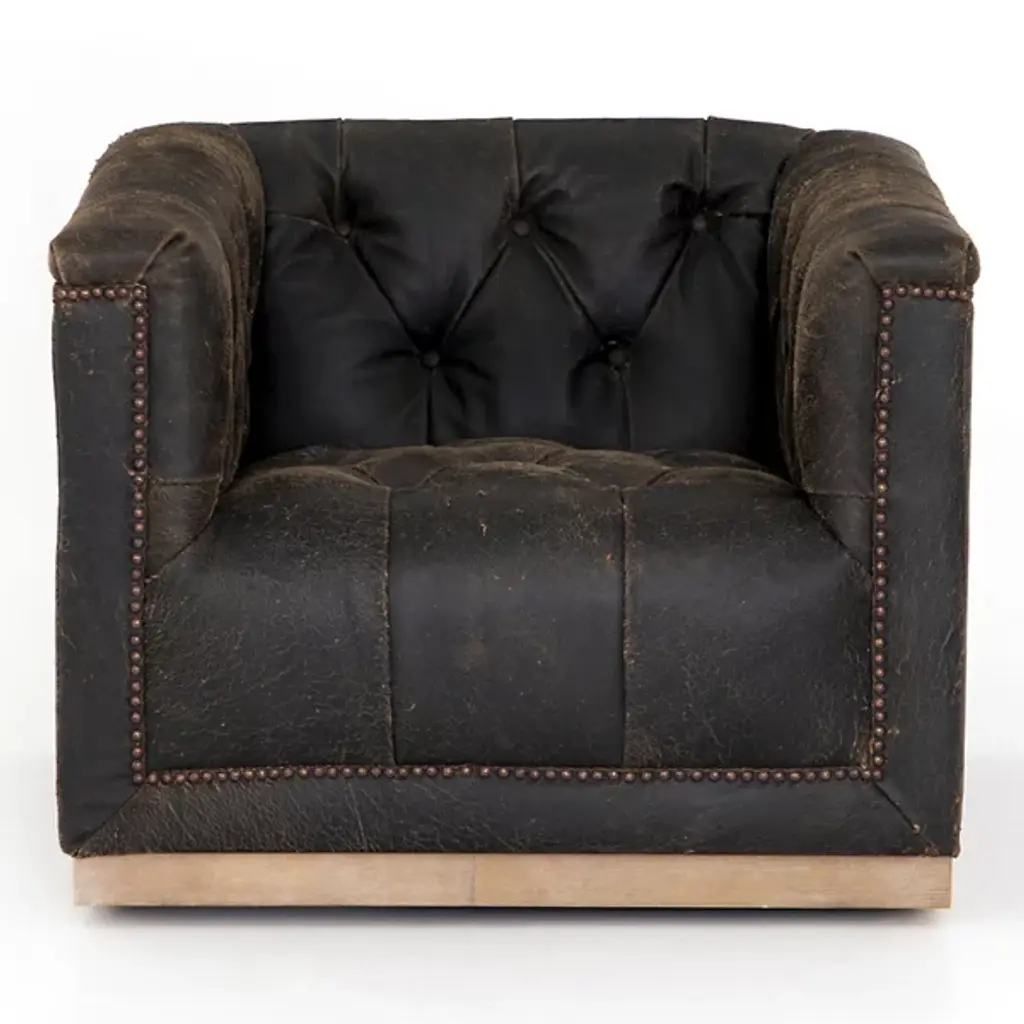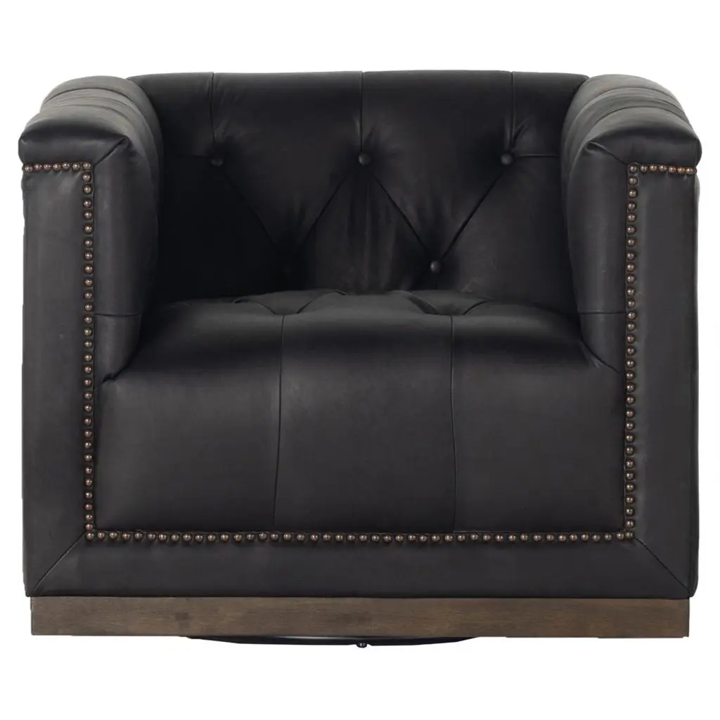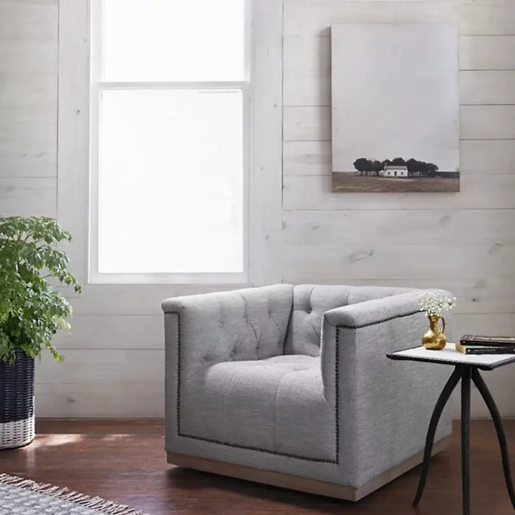 Take a seat with the intricately designed Maxx Swivel Chair by Four Hands. This chair brings a contemporary sense of style to your living space. Your chair is composed of fine fabrics for your comfort. The eye is drawn to the buttons that neatly line the Maxx Swivel Chair’s seatback. This chair has the ability to swivel so that you can change positions as you see fit. Ornamental embellishments are situated just above your furnishment’s sturdy base, ascending neatly upward.