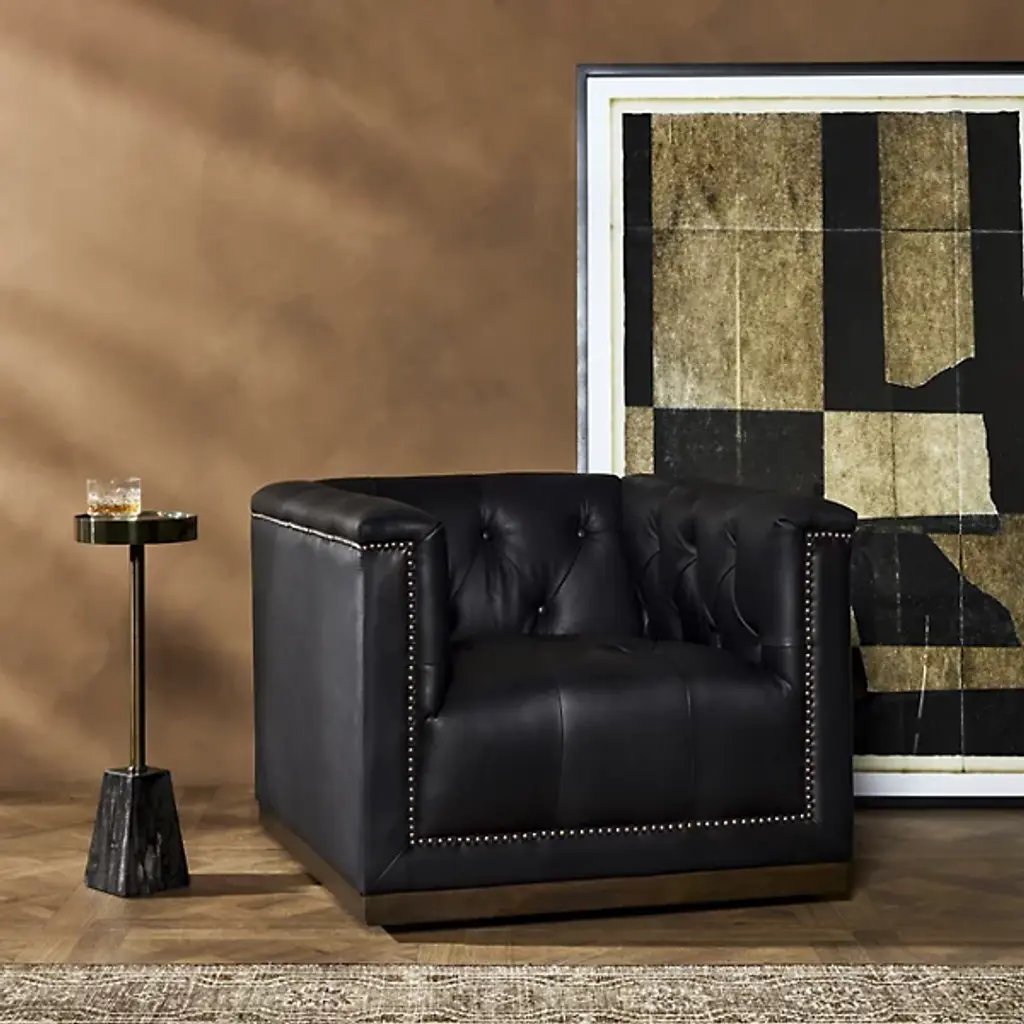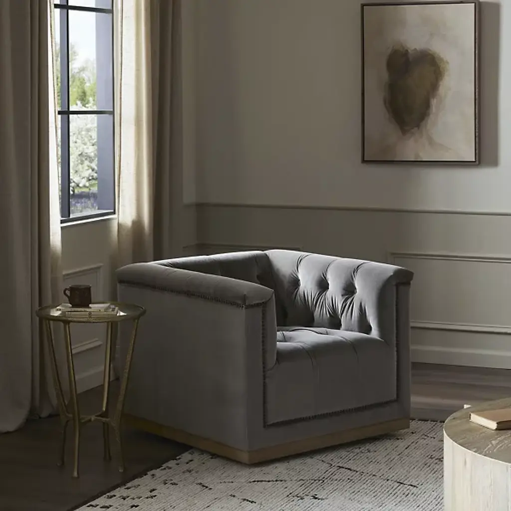 Take a seat with the intricately designed Maxx Swivel Chair by Four Hands. This chair brings a contemporary sense of style to your living space. Your chair is composed of fine fabrics for your comfort. The eye is drawn to the buttons that neatly line the Maxx Swivel Chair’s seatback. This chair has the ability to swivel so that you can change positions as you see fit. Ornamental embellishments are situated just above your furnishment’s sturdy base, ascending neatly upward.