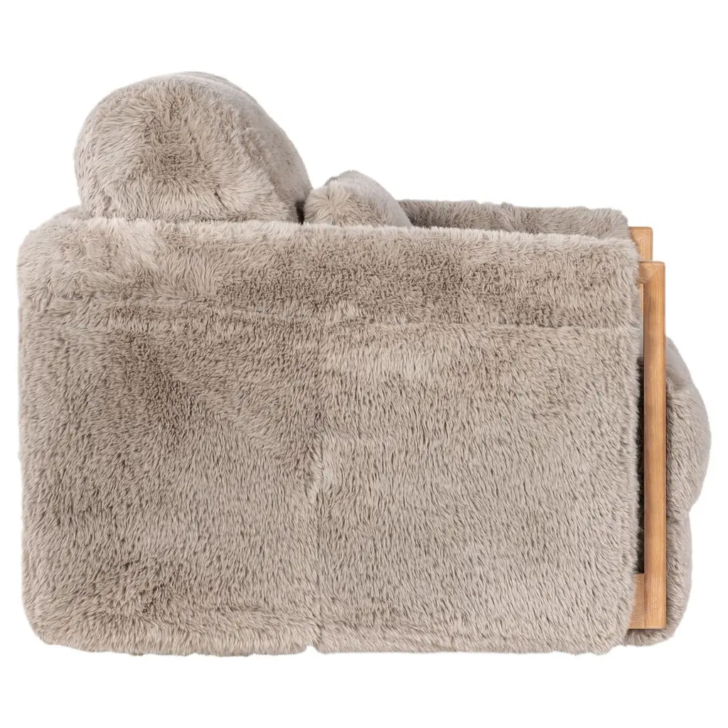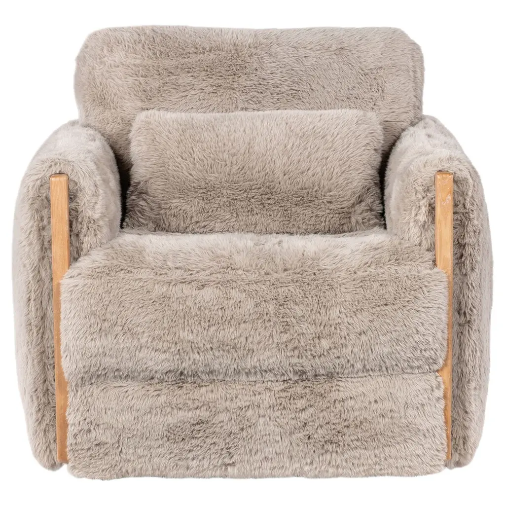 Introduce cozy sophistication to your home with the Meridian Swivel Chair. Designed for modern living spaces, this chair features a plush, furry fabric that adds warmth and texture. It boasts exposed wood trim on the arm fronts, a kidney pillow for enhanced comfort, and a smooth swivel motion for versatility. Enhance your decor with this chic yet practical addition that promises both style and comfort.