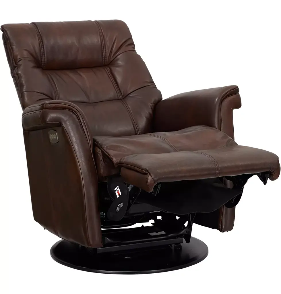 Our Metro recliner is a handsome swivel glider from our Ergo Comfort collection. This piece features 100% top-grain leather and high-density cushioning for maximum style and support. Recline with an infinite power or two-position manual option and enjoy the adjustable headrest tilt feature for a tailored relaxation experience. Sleek and comfy, this chair is available in standard or large widths to meet your needs. The Tri-Power option has power lumbar, power recline and power headrest capabilities, plus it glides and swivels on both sides. Choose the Multi-Function Power Recliner for power lumbar, power recline and power headrest functions, along with power lift!
