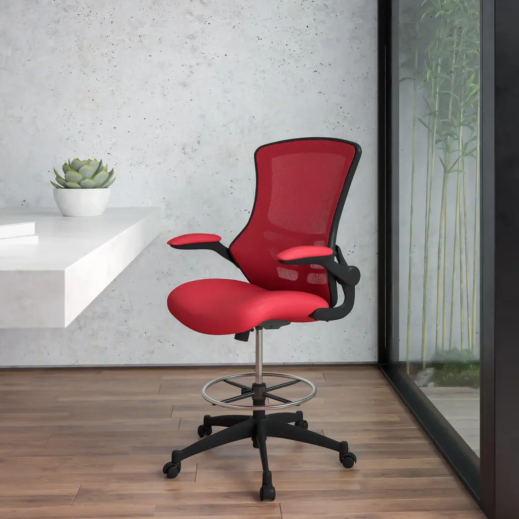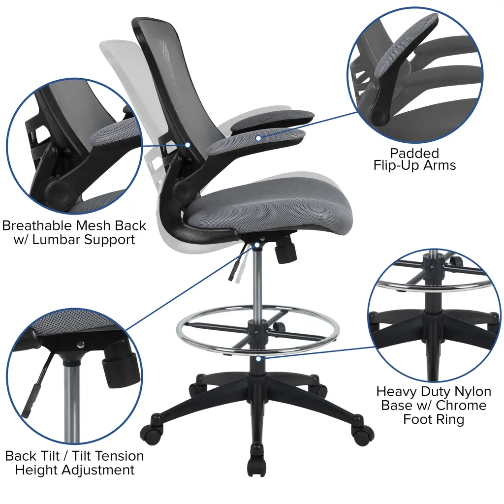 Whether you work from home or go into the office you will be comfortable with the Mid-Back Mesh Ergonomic Drafting Chair with Adjustable Foot Ring and Flip-Up Arms. This tall task chair is the perfect height for sit-to-stand desks, standing desks, bar height tables and drafting tables. Enjoy the comforts of an ergonomic chair in a taller frame to meet the needs of students and professionals working at above average desk heights. No more miserable summer days at work when you have a mesh back office chair that will keep airflow circulating. The curved back cradles you while offering built-in lumbar support. Designed with your comfort in mind, this drafting stool has invaluable features: 360 degree swivel seat ~ pressure relieving waterfall edge ~ flip-up arms when you want an armless design ~ tilt lock mechanism with variable tension control ~ height adjustable foot ring and dual wheel casters to roll across all flooring with ease. Draft chairs are essential for any profession where work surfaces are above standard height, such as lab technicians, architects, graphic artists, or any other creative assignment. They can also make a great chair for any job requiring employees to be at eye contact level with customers, such as receptionists or cashiers. Complete all tasks on this stylish draft chair that'll keep you cool and comfortable throughout your workday.