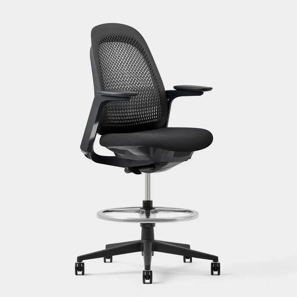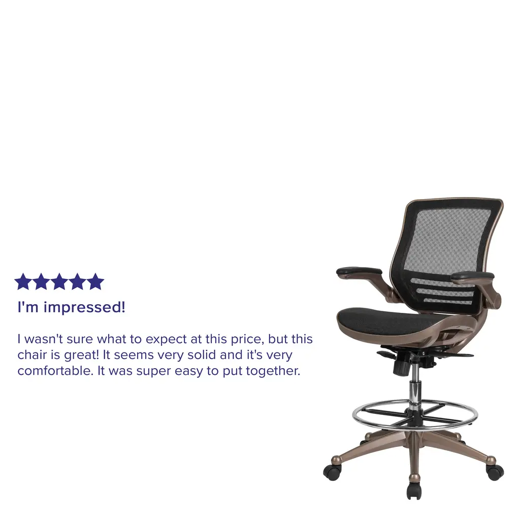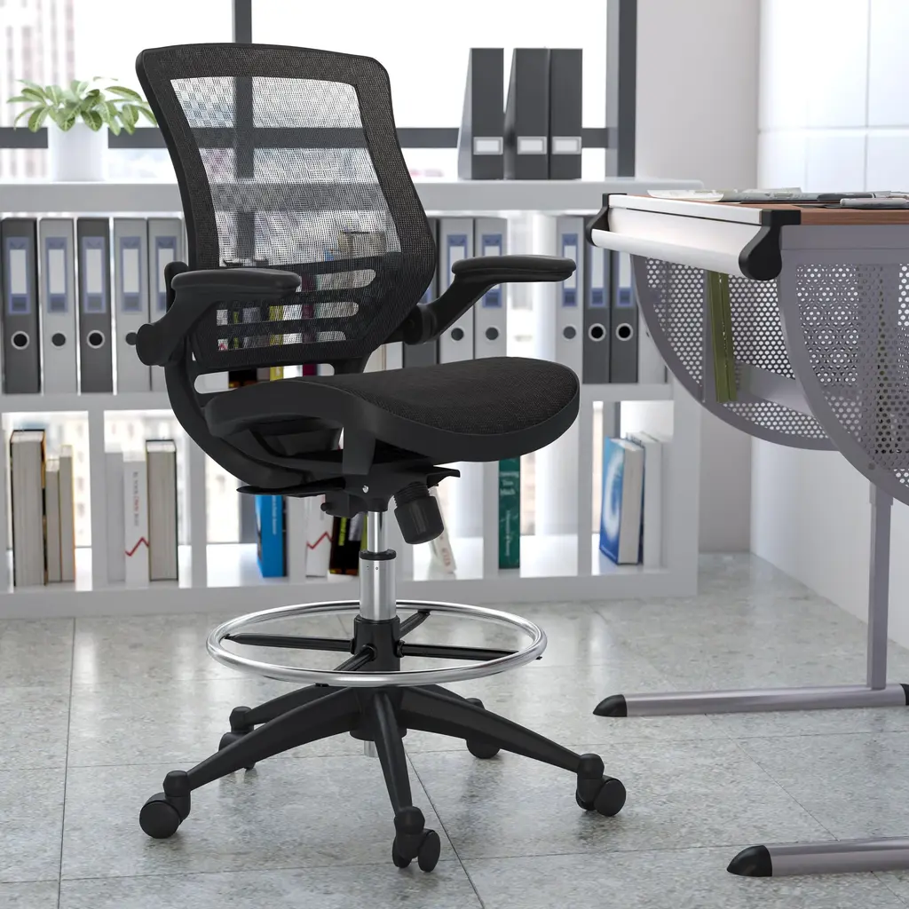 When you spend more time at your desk than anywhere else it's time to invest in a top-notch chair. This high quality drafting chair is constructed with a higher seat range to reach work surfaces that are above the average desk height, like counters and bars. Designed for artists, engineers, lab technicians and other creative work professionals, this tall drafting chair provides enhanced back support to maximize productivity. Featuring breathable mesh material and extra padding throughout, this drafting stool will help keep you cool and comfortable during extended work sessions. Our adjustable-height drafting chair effortlessly raises and lowers to your desired height via an easy-to-operate pneumatic adjustment lever while the integrated chrome foot ring around the base provides a comfortable place for your feet to rest. The waterfall front seat edge helps reduce pressure on the lower legs while increasing circulation. Padded armrests flip up and out of the way as needed, allowing you to quickly switch between tasks with greater flexibility. If you work at a non-traditional surface height, a comfortable chair is a must have so the multiple adjustment features in this office drafting chair will be a welcome addition. Synchro-tilt control lets the chair's seat and back recline at different rates, increasing the angle between your torso and thighs for an ideal sitting position and the contoured back with lumbar support may help to alleviate strain on your spine and back muscles. 360 degree swivel paired with dual-wheel, easy-rolling casters allows you effortless mobility to maximize your workspace. Spills clean up easily with a solvent based cleaner, no water required. Whether you go to the office or work from home, this mid-back mesh chair offers a practical and attractive seating solution to get you comfortably through your workday.