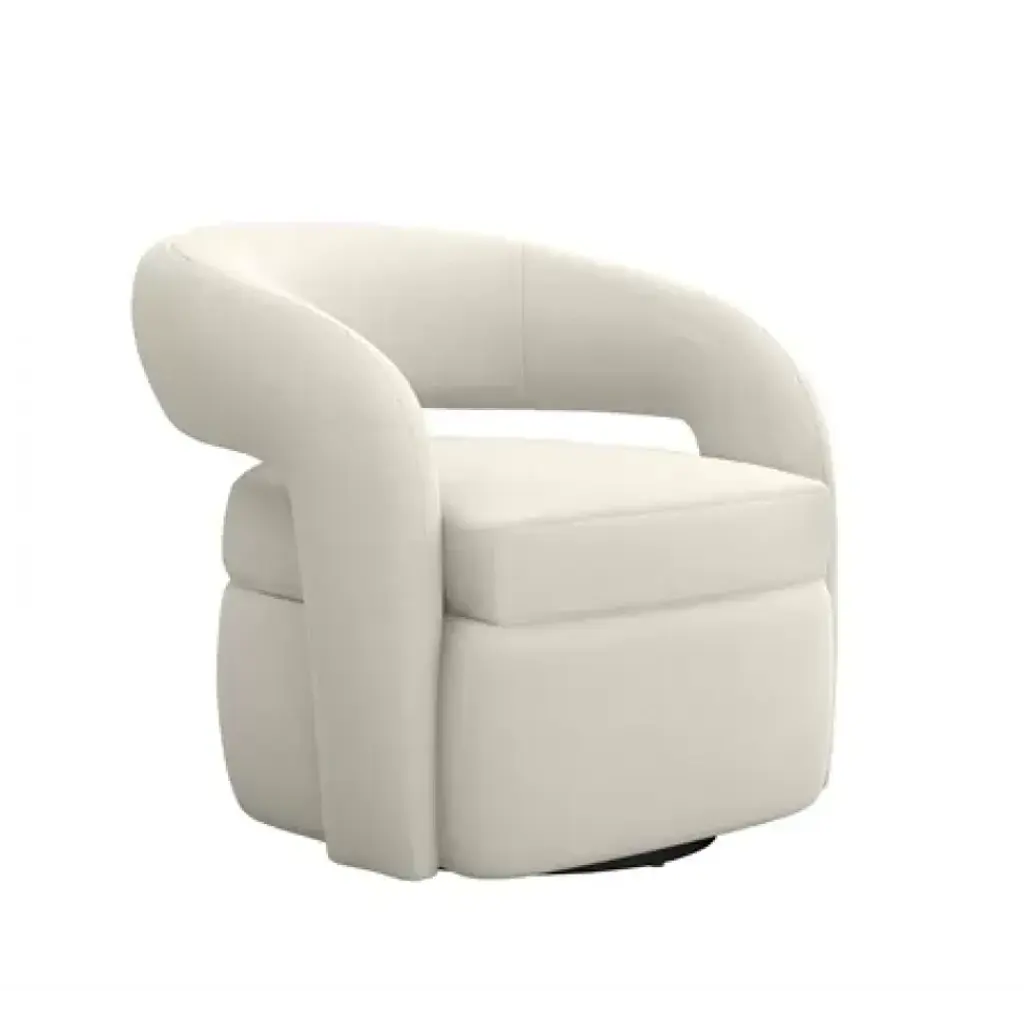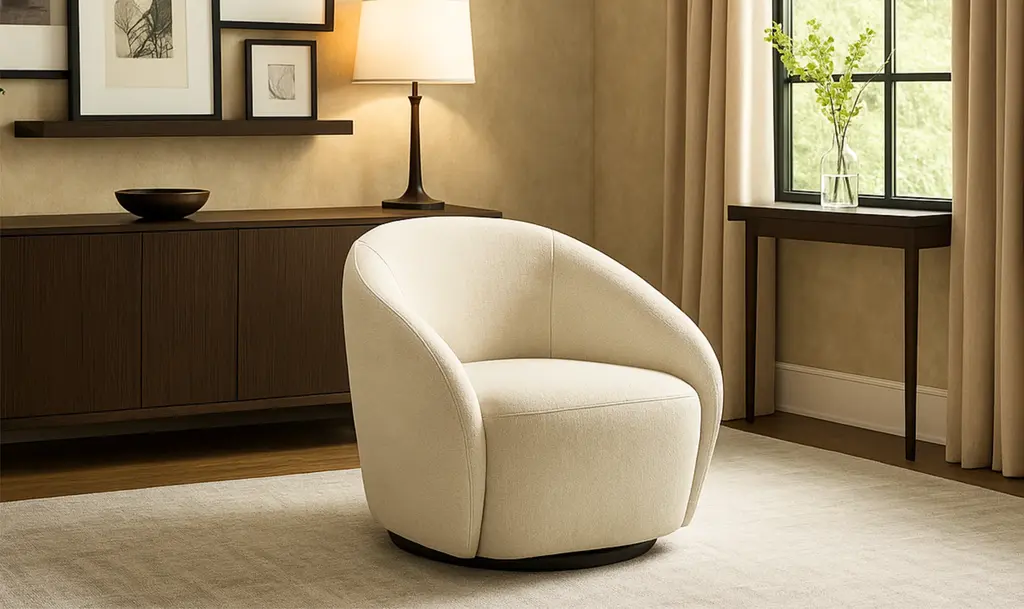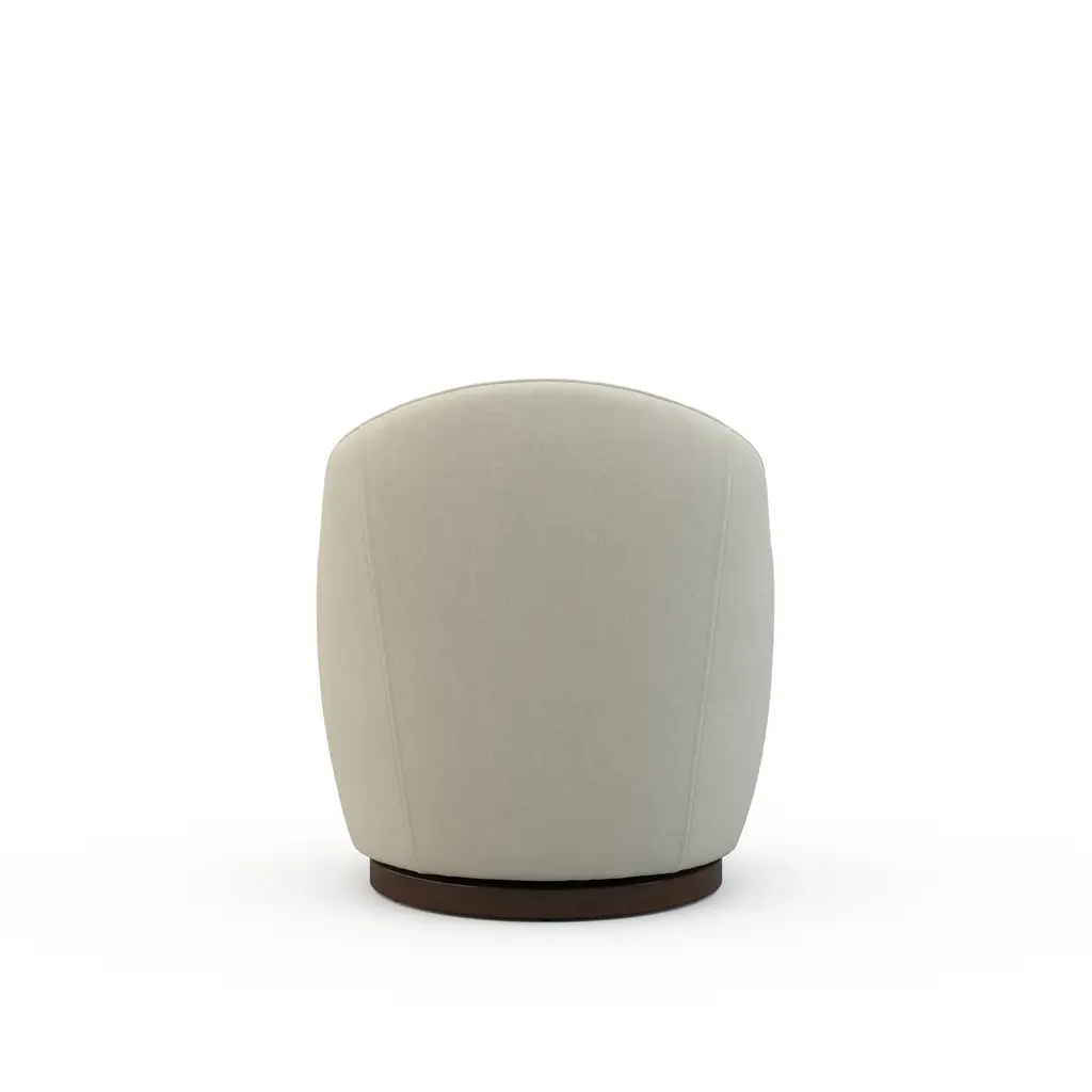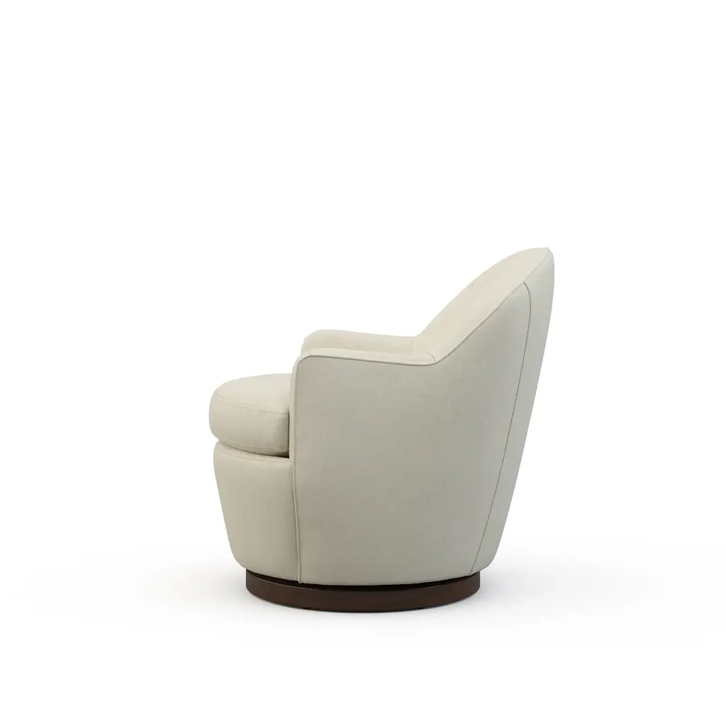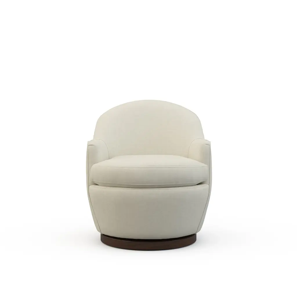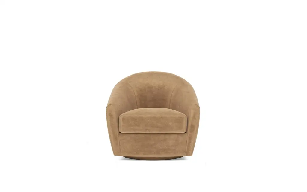 With a striking oval silhouette, the Millie Swivel Chair features a fully upholstered frame and removable cushion with a warm wooden swivel base. The slim profile of this chair pairs with the swivel base to make it a convenient addition to any small space. Ships In 8-10 Weeks One loose seat cushion Swivel wood base As Shown Fabric: Rayburn Oatmeal As Shown Finish: Modern Elm If you choose to purchase COM, once you have placed your order a customer service rep will contact you regarding where to send your fabric. Please note that current lead time is 8-10 weeks once your fabric arrives at the factory, and if unused fabric is under 1.5 yards, it cannot be sent back to you.This product can be special ordered in additional fabrics, leathers, finishes, and cushion fillings. Click here to email us for for additional information about special ordering.This image is for illustrative purposes only. The colors shown are accurate within the constraints of lighting, photography, and the color accuracy of your screen.