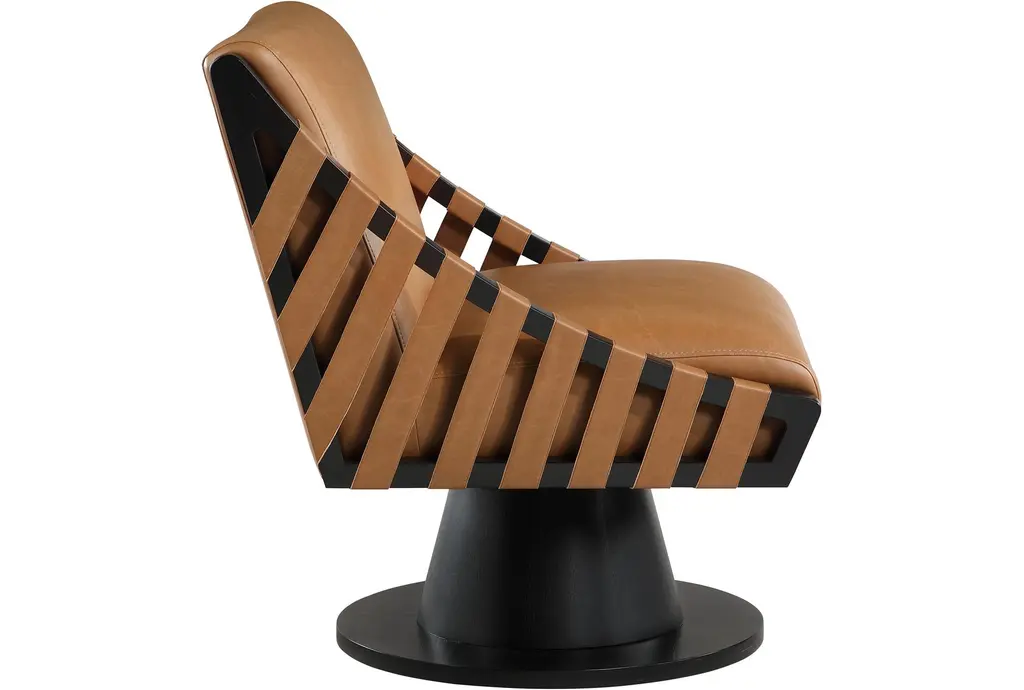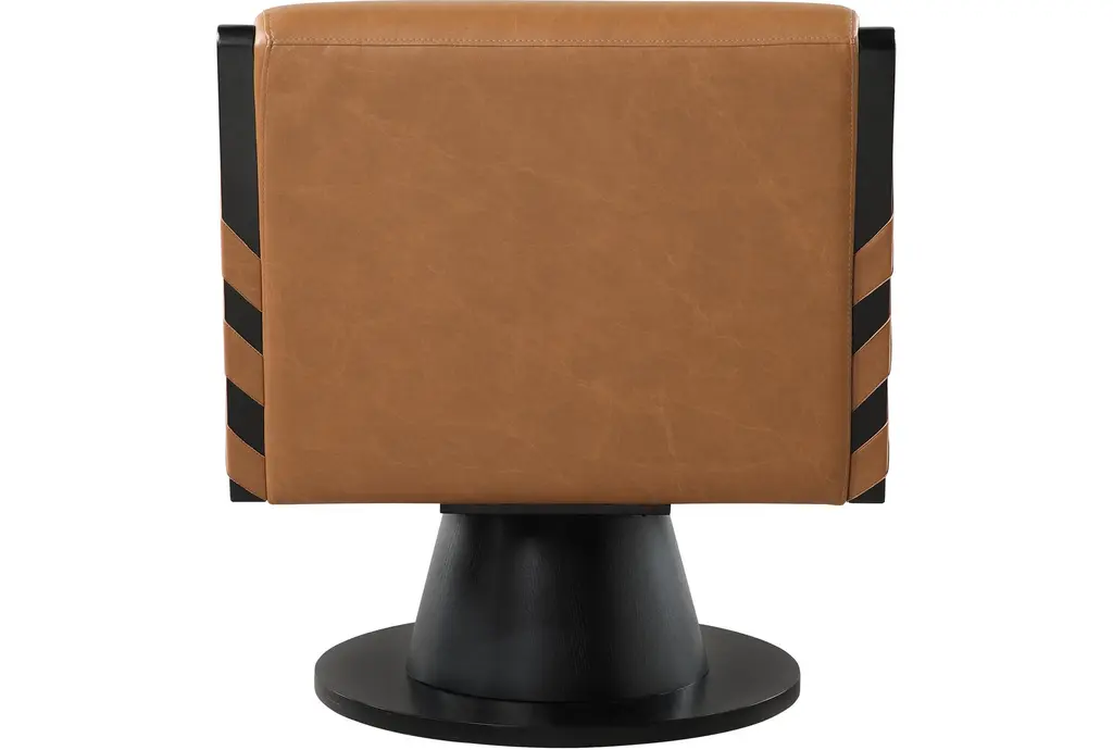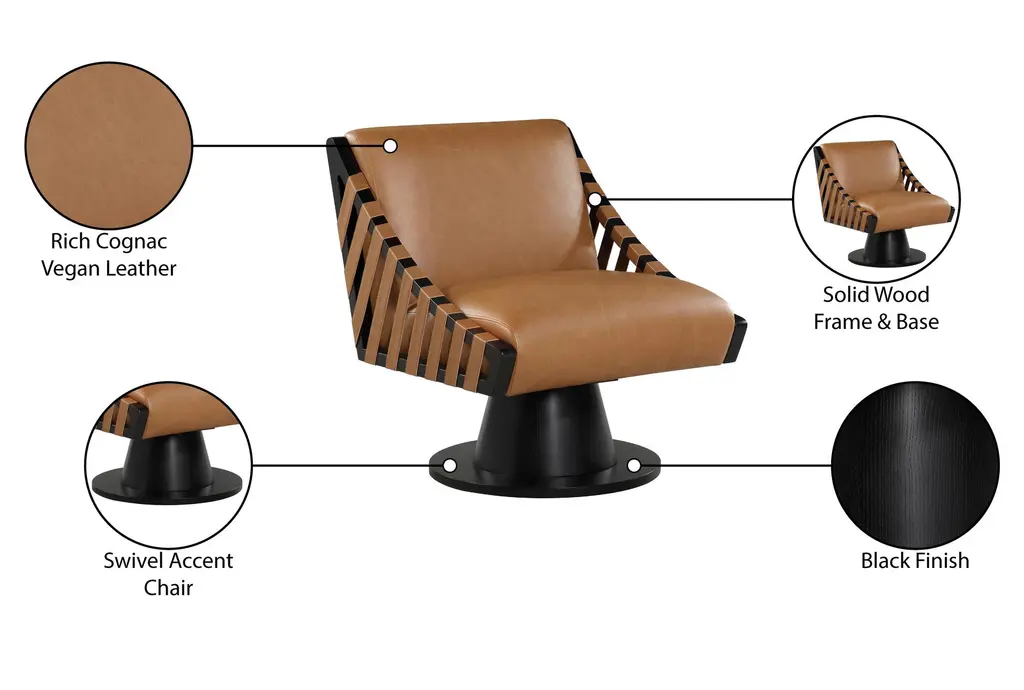 The Millwin Cognac Brown Vegan Leather Swivel Accent Chair with Black Finish is a stylish and modern addition to any living space. Its rich cognac vegan leather upholstery and sleek black finish create a sophisticated look. The solid wood frame and base ensure durability and stability, while the swivel feature adds functionality and convenience.