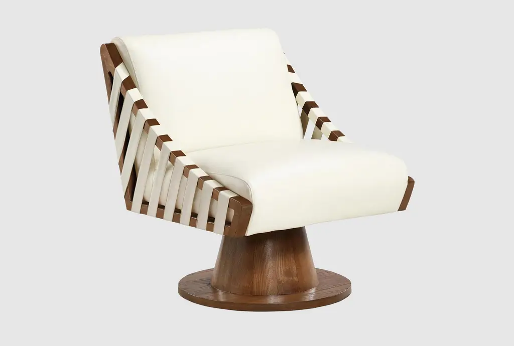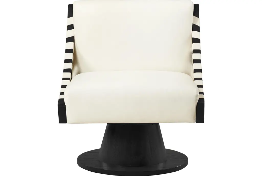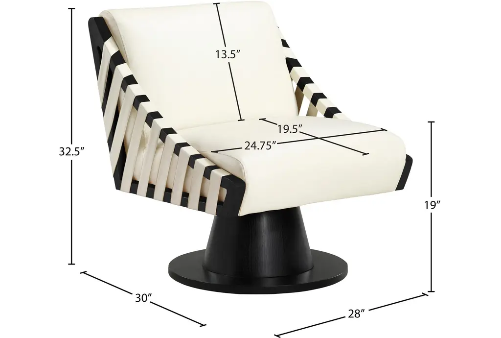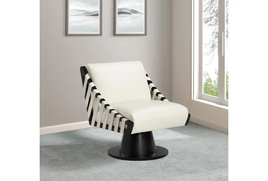 The Millwin Cream White Vegan Leather Swivel Accent Chair with Black Finish is a stunning addition to any modern or contemporary space. Its rich cream vegan leather upholstery and solid wood frame provide both style and durability. The swivel design adds a functional and dynamic element to this elegant piece.