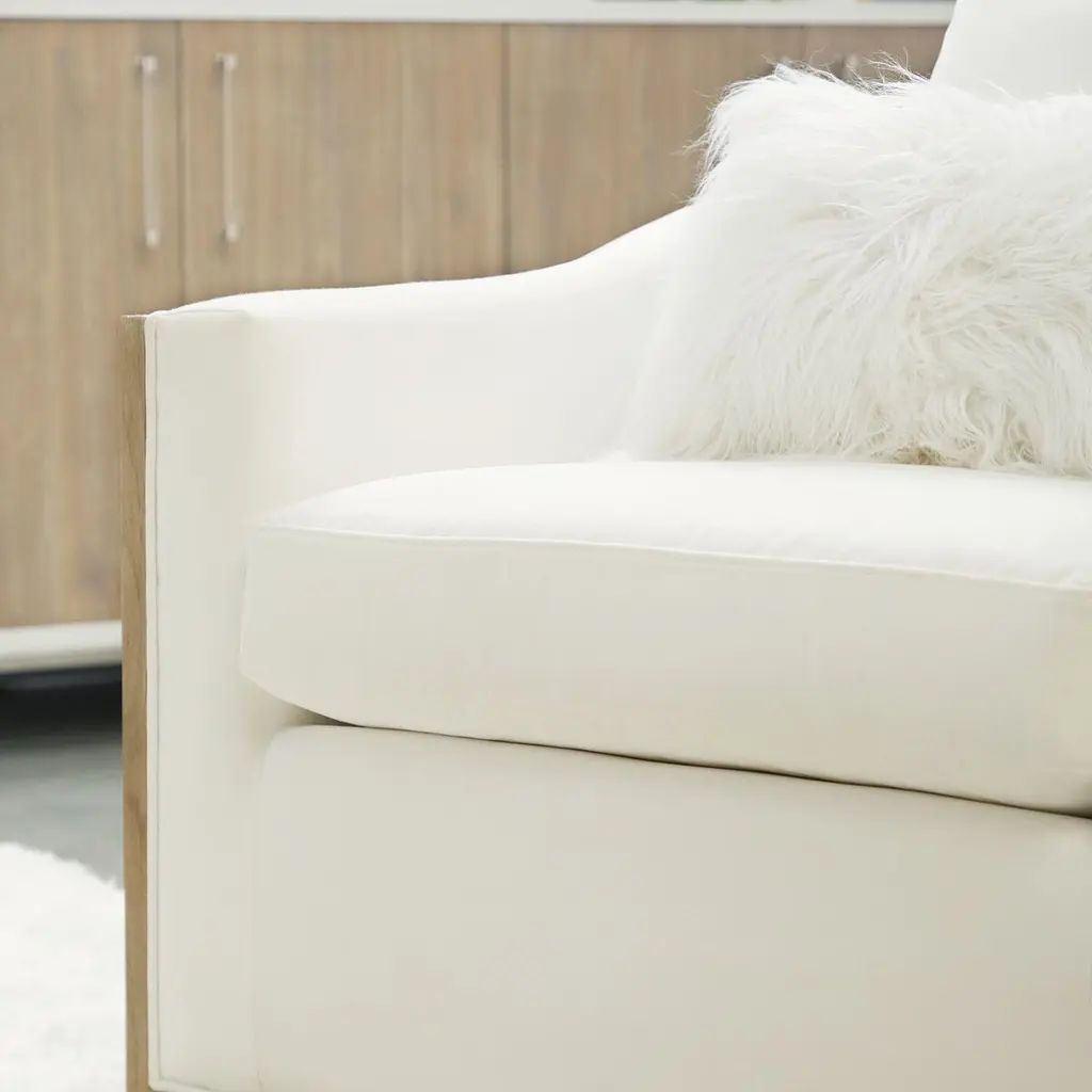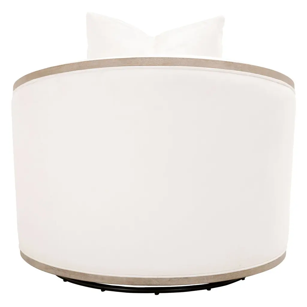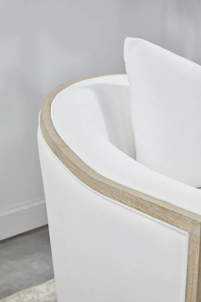 This 360-degree swivel chair is certain to become the favorite seat in your home, thanks in large part to its generous foam-and-down cushion fill and ample proportions. The exposed oak trim accentuates the chair's inviting curves. And because it's upholstered in heavy-duty stain-resistant fabric, it's ideal for households with kids or pets. In addition to the reversible seat cushion, the chair comes with a down-filled throw pillow.