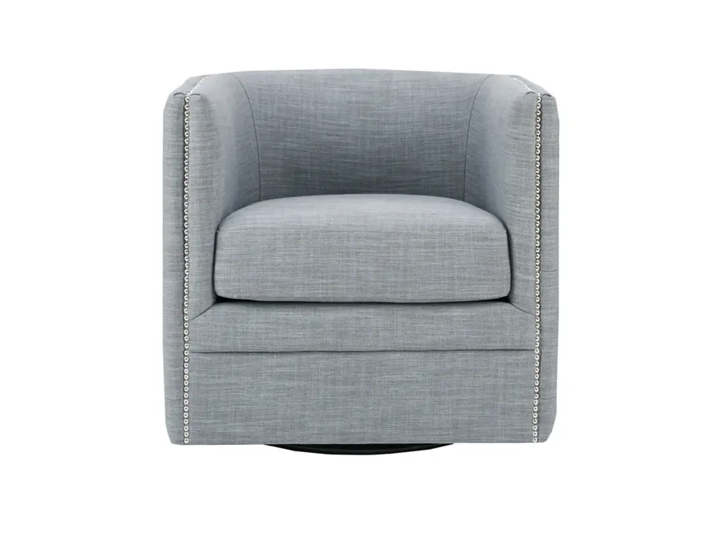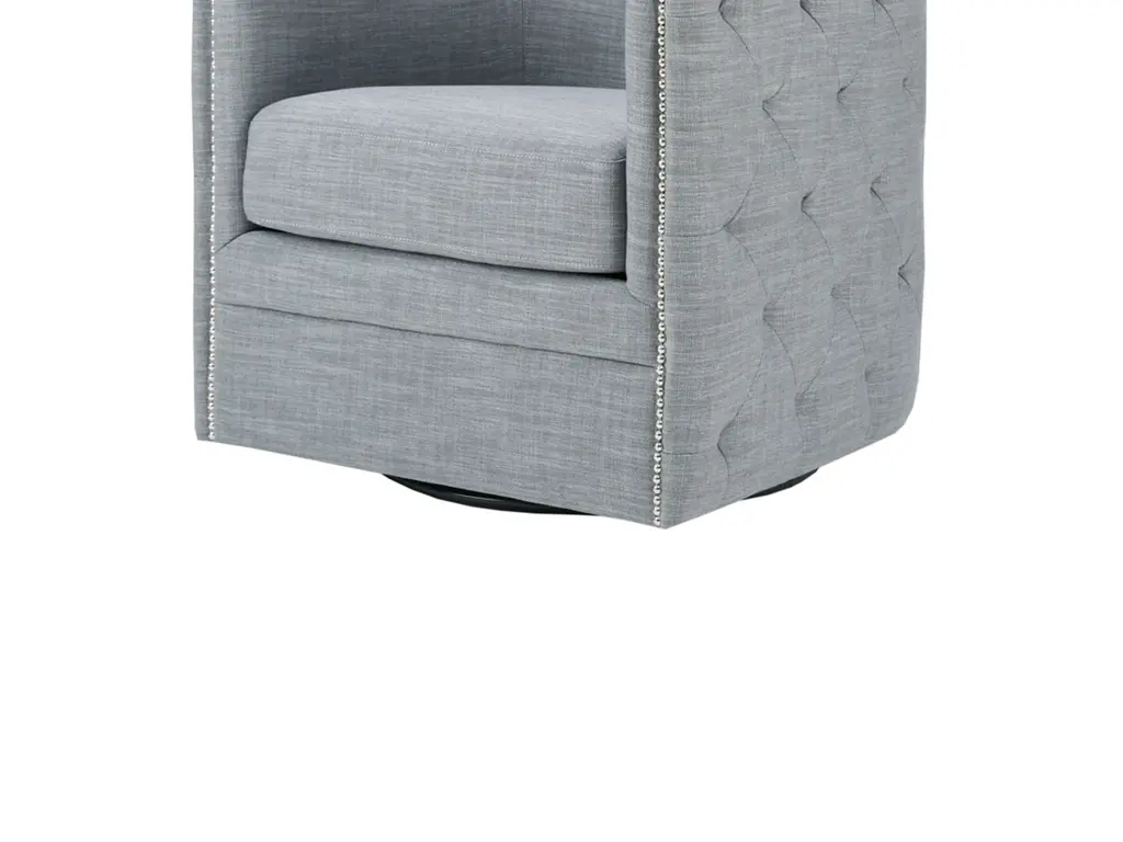 Update your living room with the rich style of the Madison Park Capstone Swivel Chair. The curved back and arms frame the wide seat, while silver nail heads add a classic touch. A high-density foam filling and solid wood frame provide exceptional comfort and support, while the swivel feature allows the lounge chair to rotate on its base. Upholstered in a slate polyester and linen fabric, this swivel chair will make an eye-catching piece in your home. No assembly required.