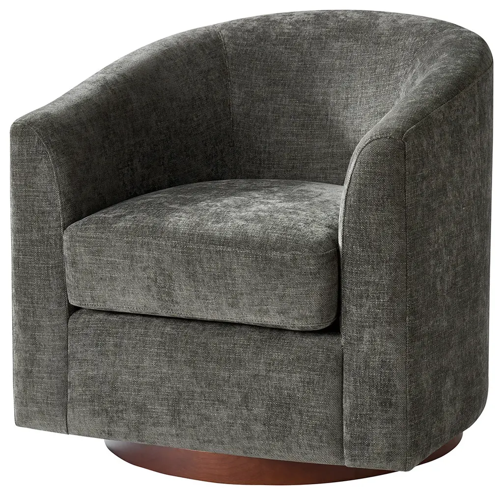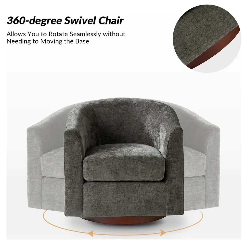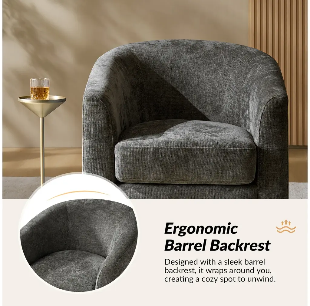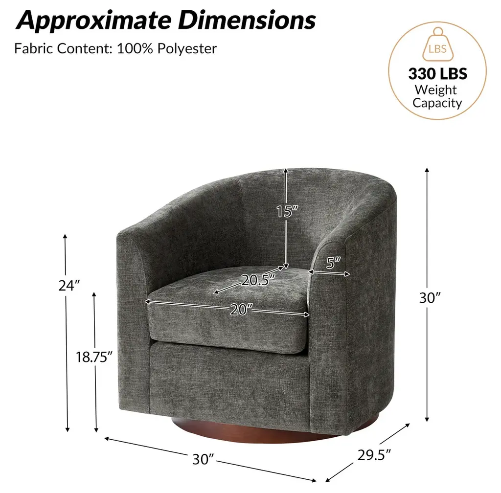 Experience the blend of comfort and style with this modern barrel chair. Upholstered in a faux linen fabric, it offers a sophisticated and inviting texture that complements any decor. The sturdy solid wood base provides exceptional stability and durability, making it a lasting addition to your home. Designed with a sleek barrel backrest, it wraps around you, creating a cozy spot to unwind. The chair also features a smooth swivel function, allowing you to turn effortlessly to any angle for added convenience. With its modern aesthetic, this chair is a versatile piece, ideal for both living rooms and bedrooms, blending functionality with timeless style.Product Highlights:Faux Linen Upholstery: The chair is covered in quality faux linen fabric that mimics the soft, textured feel of real linen. It adds a refined, natural look while being resistant to wear, fading, and stains, ensuring longevity and easy maintenance.Solid Wood Base for Stability: Built with a solid wood base, this chair offers reliable support and durability, holding up well under daily use. The wood base provides a warm, classic touch that complements the modern style.Smooth Swivel: Equipped with a smooth swivel function, this chair allows you to rotate seamlessly without needing to move its base. This feature makes it ideal for conversations, reading, or simply turning to view different parts of the room, adding functional versatility.Ergonomic Barrel Backrest: The unique barrel backrest is designed to gently curve around you, providing a snug and cozy seating experience.Modern Aesthetic with Clean Lines: With its modern design, clean lines, and subtle details, this chair suits a wide range of interior styles, from minimalist to contemporary.Product Including: One barrel chair, assembly is required.Product DetailsOverall Item weight: 51.5 LBSSeat Fill Material and details: 100% FoamWeights & DimensionsItem Size: 30"W*29"D*30"HSeat Size: 20"W*20"D*18.75"HBack height to seat: 15"Fabric Content: 100% PolyesterLeg Material: Solid Wood + Iron TurntableSpecifications Upholstered: YesArms Included: NoOttoman Included: NoPillows Included: NoInstructions:Because the size of the product is measured manually, there may be errors.Made in China.