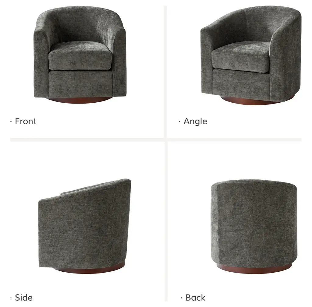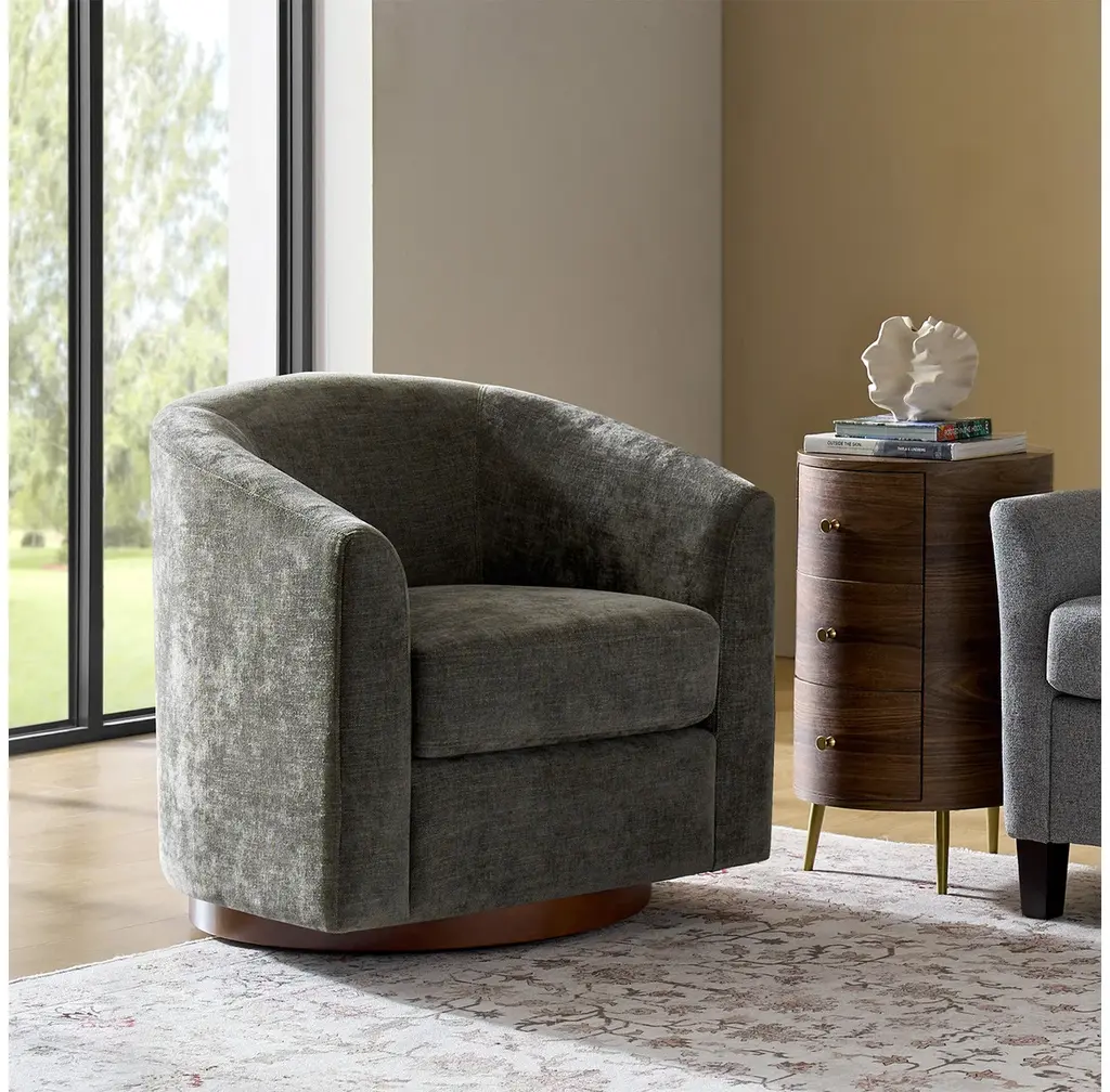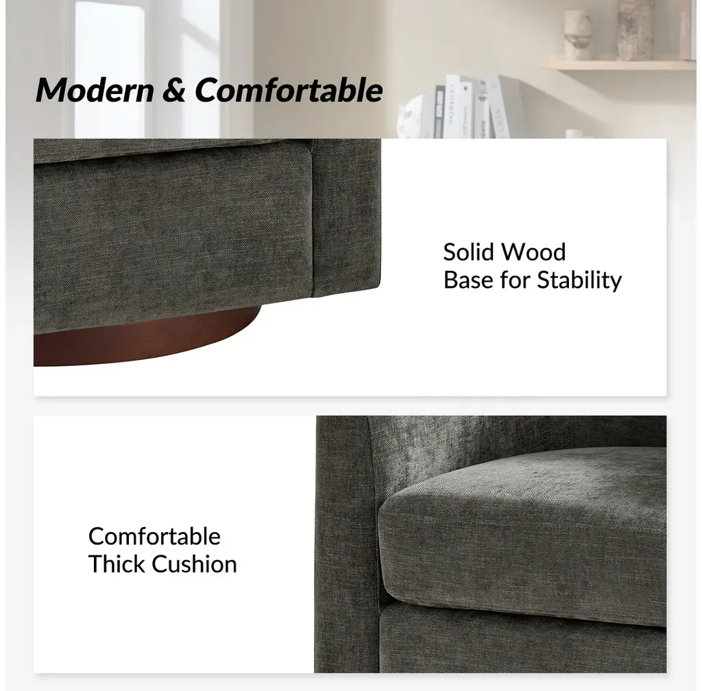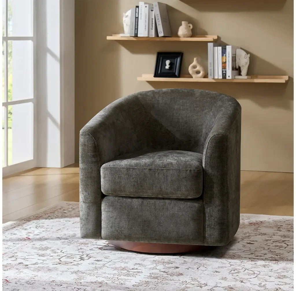 Experience the blend of comfort and style with this modern barrel chair. Upholstered in a faux linen fabric, it offers a sophisticated and inviting texture that complements any decor. The sturdy solid wood base provides exceptional stability and durability, making it a lasting addition to your home. Designed with a sleek barrel backrest, it wraps around you, creating a cozy spot to unwind. The chair also features a smooth swivel function, allowing you to turn effortlessly to any angle for added convenience. With its modern aesthetic, this chair is a versatile piece, ideal for both living rooms and bedrooms, blending functionality with timeless style.Product Highlights:Faux Linen Upholstery: The chair is covered in quality faux linen fabric that mimics the soft, textured feel of real linen. It adds a refined, natural look while being resistant to wear, fading, and stains, ensuring longevity and easy maintenance.Solid Wood Base for Stability: Built with a solid wood base, this chair offers reliable support and durability, holding up well under daily use. The wood base provides a warm, classic touch that complements the modern style.Smooth Swivel: Equipped with a smooth swivel function, this chair allows you to rotate seamlessly without needing to move its base. This feature makes it ideal for conversations, reading, or simply turning to view different parts of the room, adding functional versatility.Ergonomic Barrel Backrest: The unique barrel backrest is designed to gently curve around you, providing a snug and cozy seating experience.Modern Aesthetic with Clean Lines: With its modern design, clean lines, and subtle details, this chair suits a wide range of interior styles, from minimalist to contemporary.Product Including: One barrel chair, assembly is required.Product DetailsOverall Item weight: 51.5 LBSSeat Fill Material and details: 100% FoamWeights & DimensionsItem Size: 30"W*29"D*30"HSeat Size: 20"W*20"D*18.75"HBack height to seat: 15"Fabric Content: 100% PolyesterLeg Material: Solid Wood + Iron TurntableSpecifications Upholstered: YesArms Included: NoOttoman Included: NoPillows Included: NoInstructions:Because the size of the product is measured manually, there may be errors.Made in China.