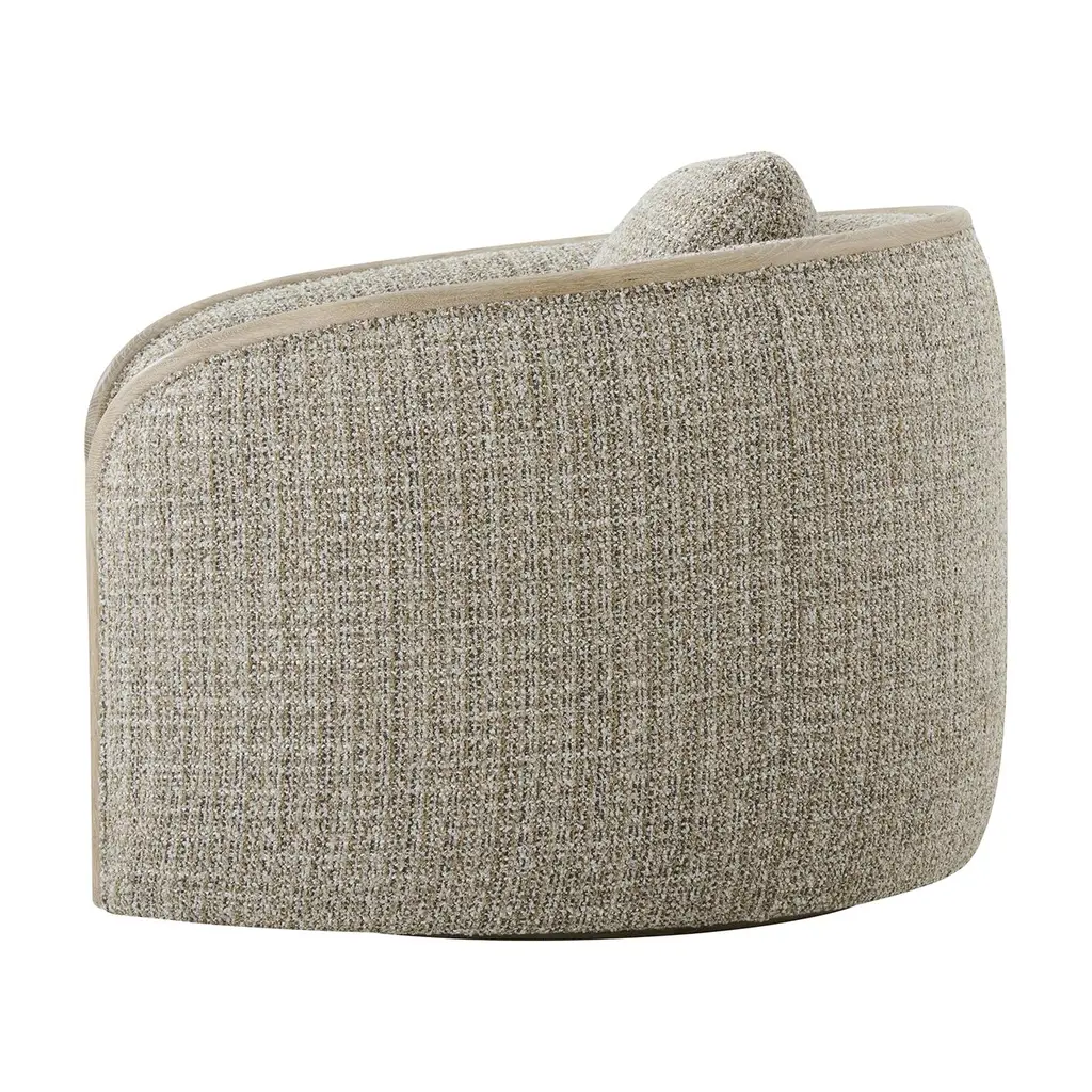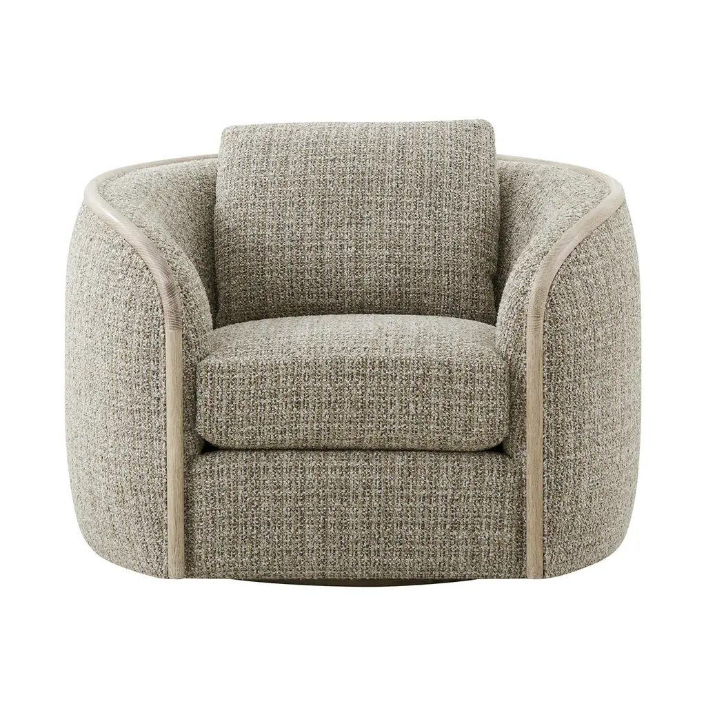 Crafted with a beautifully curved oak frame and upholstered in a luxurious textural chenille fabric that provides a soft, inviting touch while maintaining a sophisticated aesthetic. Designed for both style and function, the chair includes a smooth swivel base for effortless movement, making it a versatile addition to any seating arrangement. The elegant welting trim accentuates its tailored silhouette, adding a touch of craftsmanship to its modern appeal. Whether placed in a cozy reading nook or as a statement piece in a refined living room, the chair delivers comfort, style, and timeless charm. Dimensions: 42" W x 42" D x 31½" H Seat - 18.5" H