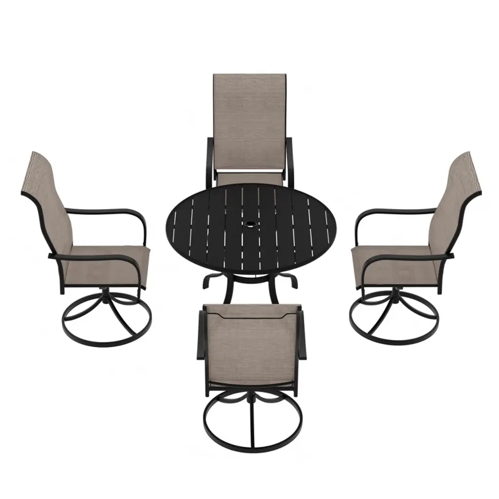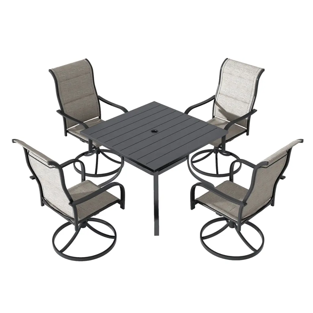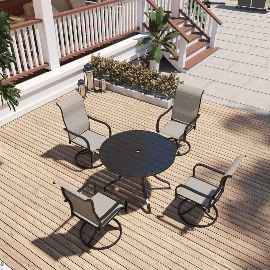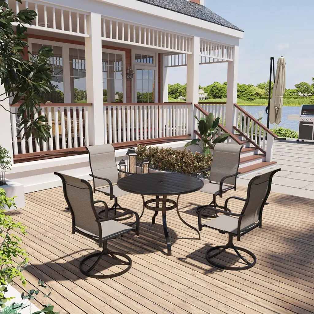 Decorating your patio in an approachable style is easily achieved with this 5-piece patio dining set, which includes a round dining table and four swivel armchairs. Crafted from a powder-coated steel frame, durability and stability are at the forefront of its design. Each piece in the set is weather-resistant, ensuring longevity and ease of maintenance, which is vital for outdoor furniture. The chairs and table are finished in a thick Textilene olefin, giving it a modern, easy-to-clean look that will complement any outdoor space.