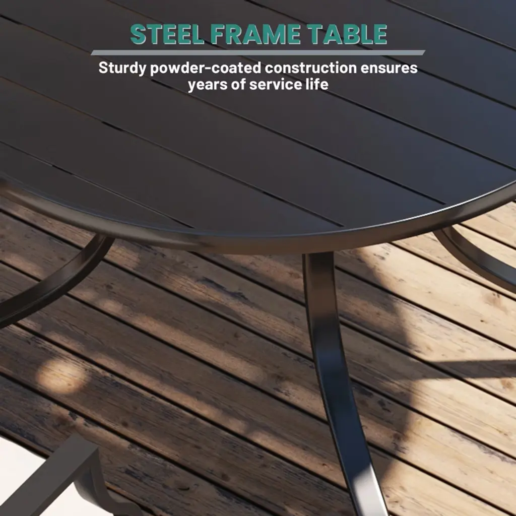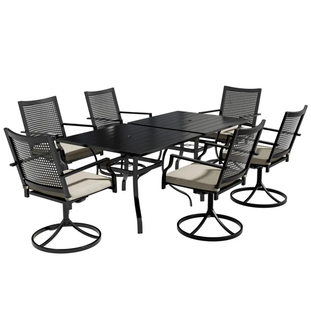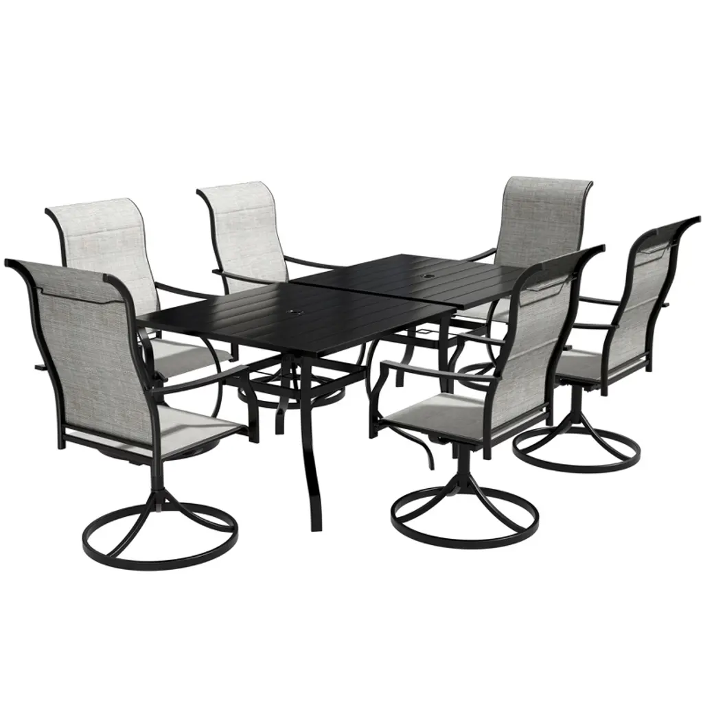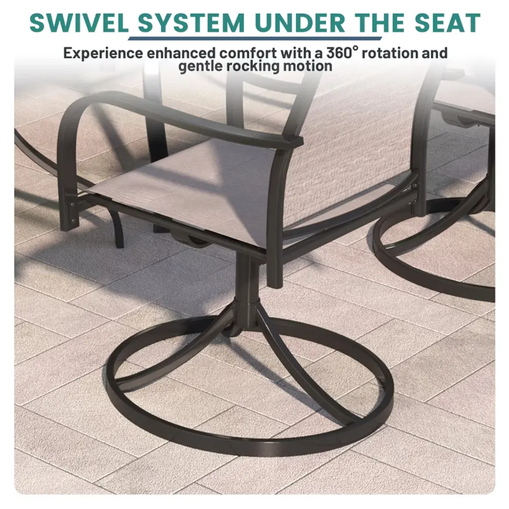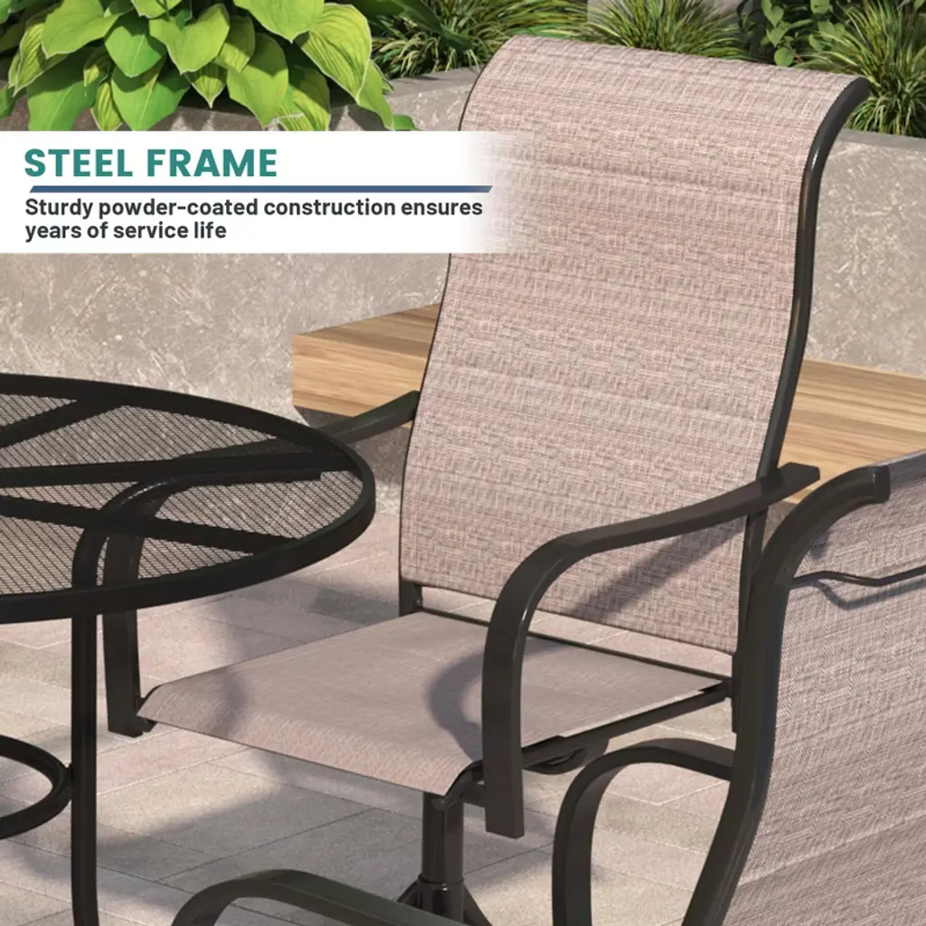 Decorating your patio in an approachable style is easily achieved with this 5-piece patio dining set, which includes a round dining table and four swivel armchairs. Crafted from a powder-coated steel frame, durability and stability are at the forefront of its design. Each piece in the set is weather-resistant, ensuring longevity and ease of maintenance, which is vital for outdoor furniture. The chairs and table are finished in a thick Textilene olefin, giving it a modern, easy-to-clean look that will complement any outdoor space.