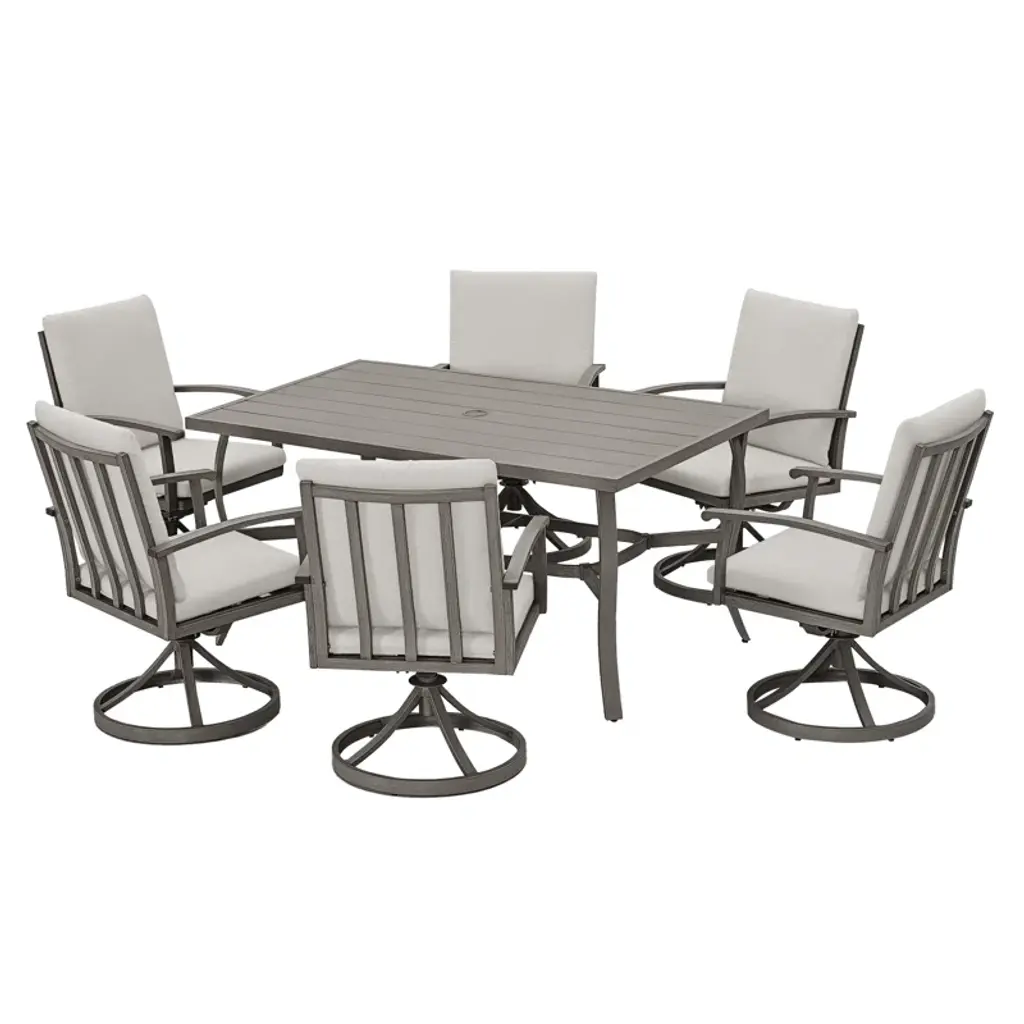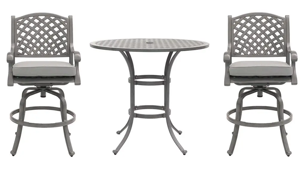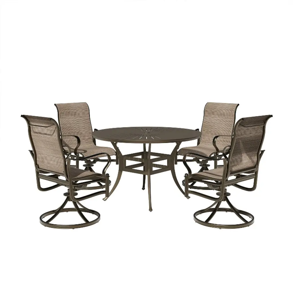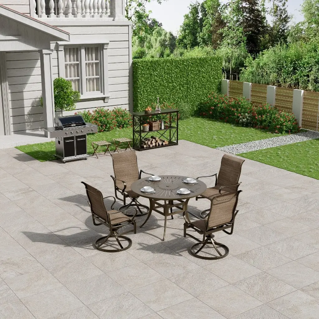 This 5 piece patio dining set includes 4 textilene swivel rocking chairs with cushions and a 53"W round dining table with an umbrella hole. Both the chairs and table have aluminum cast frames featuring heavy gauge and rust resistant aluminum-alloy extrusions with uniquely supported inner walls. Designed to last, this 3 piece outdoor dining set will surely provide you with a natural alternative to entertaining outdoors.