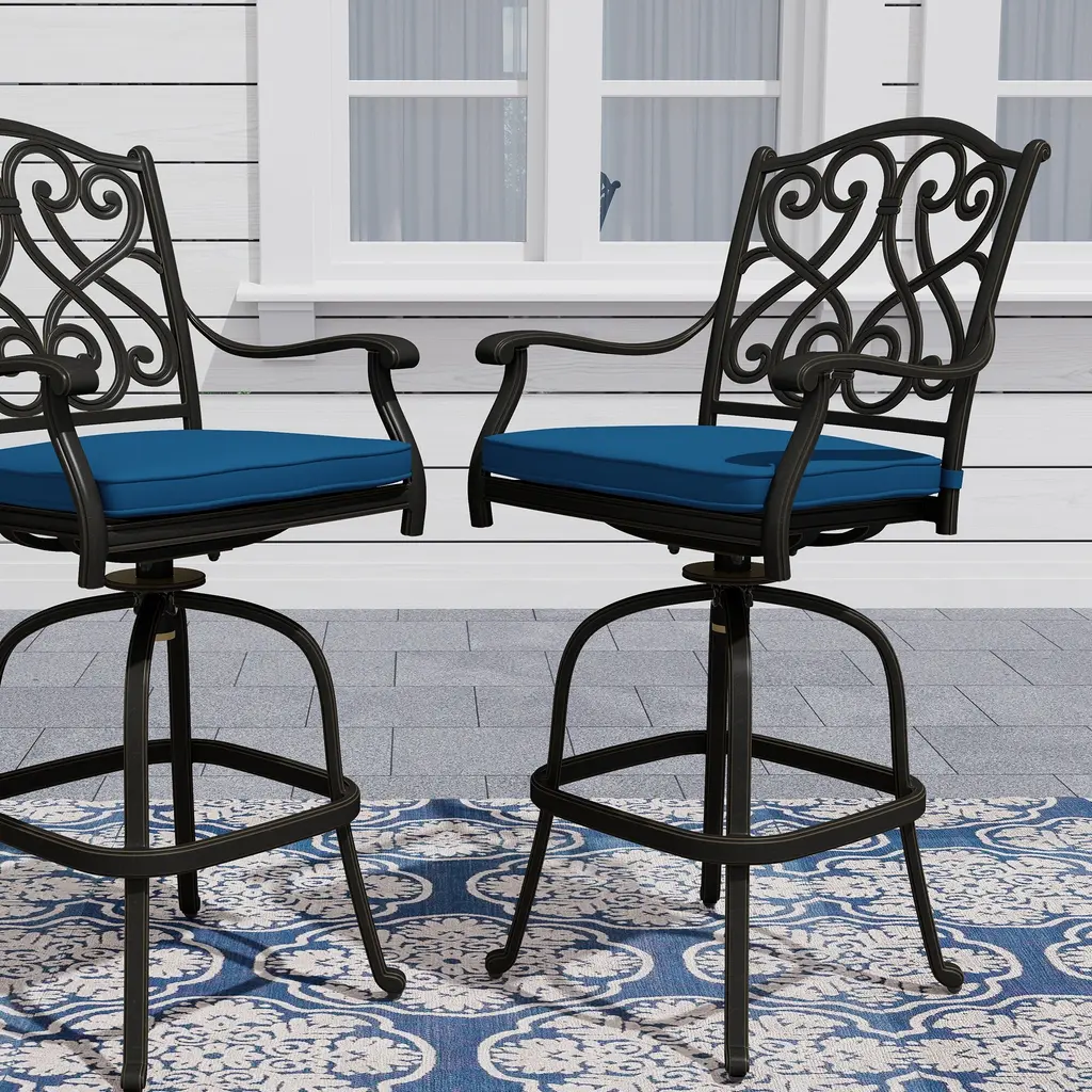 Our high-end bistro set is meticulously designed to be the centerpiece of your outdoor oasis, offering a blend of luxury and practicality that's perfect for those who appreciate the finer things. The table, a masterpiece of durability and style, features a cast aluminum build that promises longevity against the test of time and weather. Its surface, treated with a smooth powder coat, invites touch with its silky texture, while the black base with white edging adds a touch of elegance that's hard to ignore. The 1.9-inch umbrella hole is not just a functional feature but a statement of your commitment to enjoying life's moments under the sky. Our chairs are the epitome of comfort, with a 360° swivel function that allows for seamless movement and conversation.