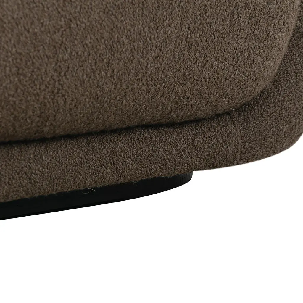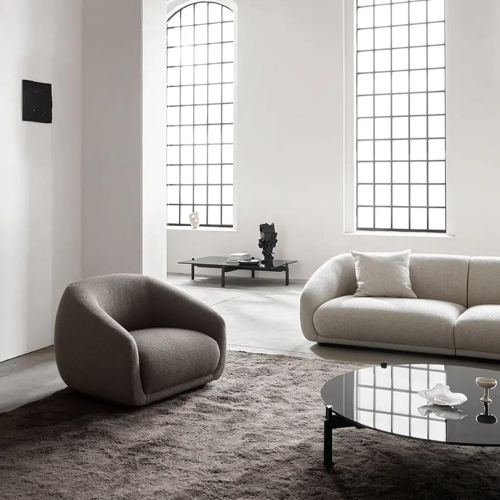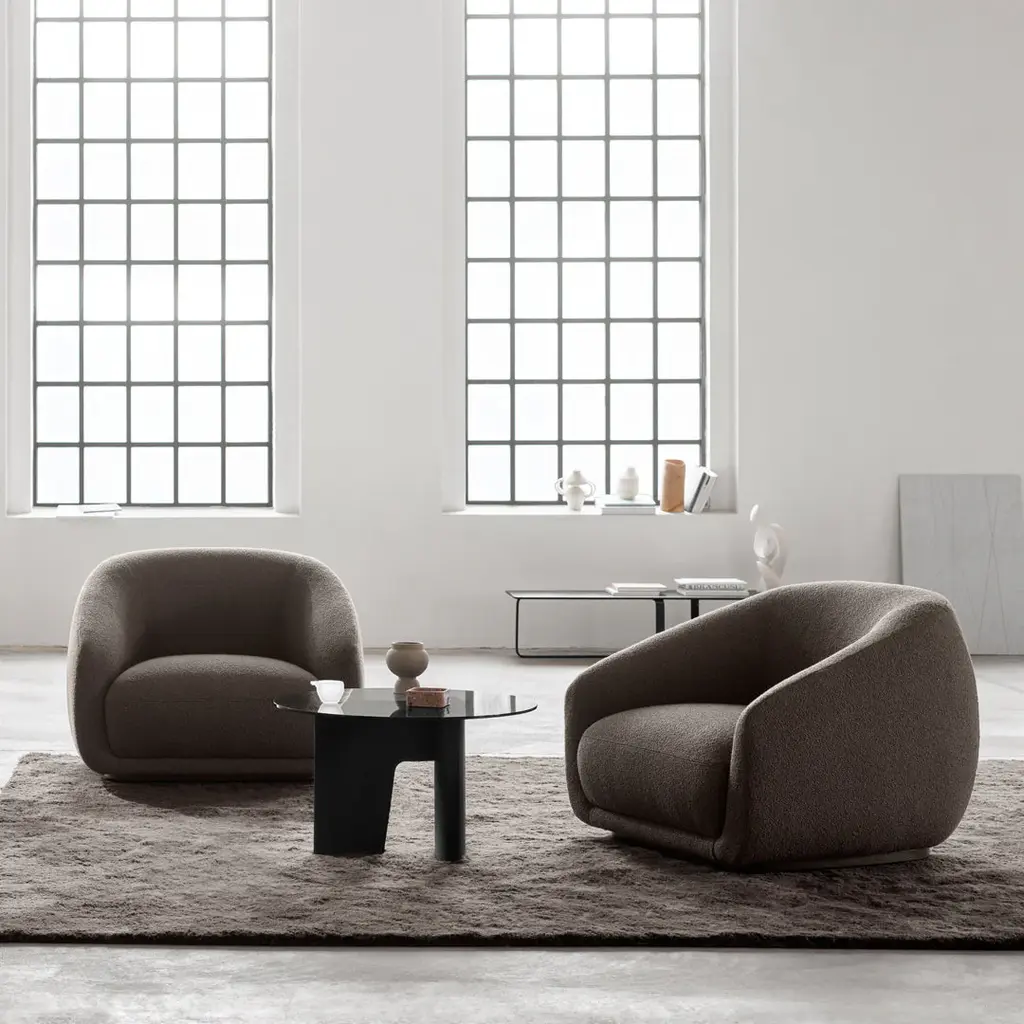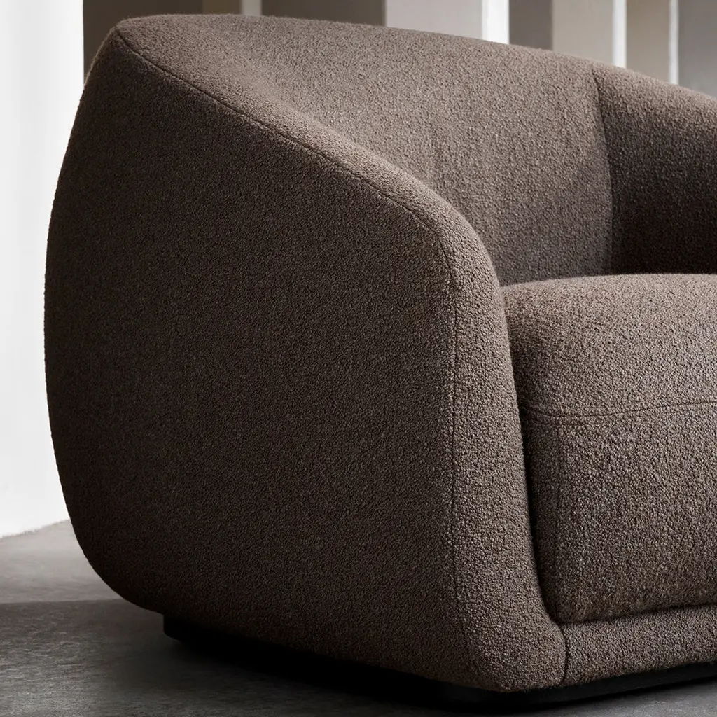 Resting atop a recessed base, the corpus of the Montholon design seemingly soars above ground, prompting a lighter sentiment to the voluminous proportions while awakening the senses with inviting curves and the soothing softness of tactile topography. Chair base is swivel with auto return.