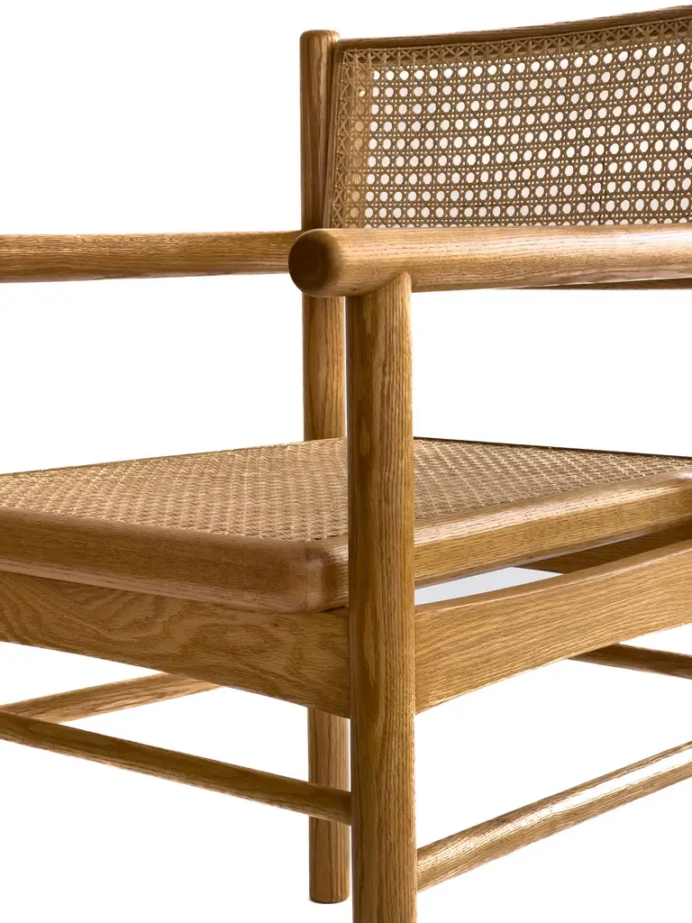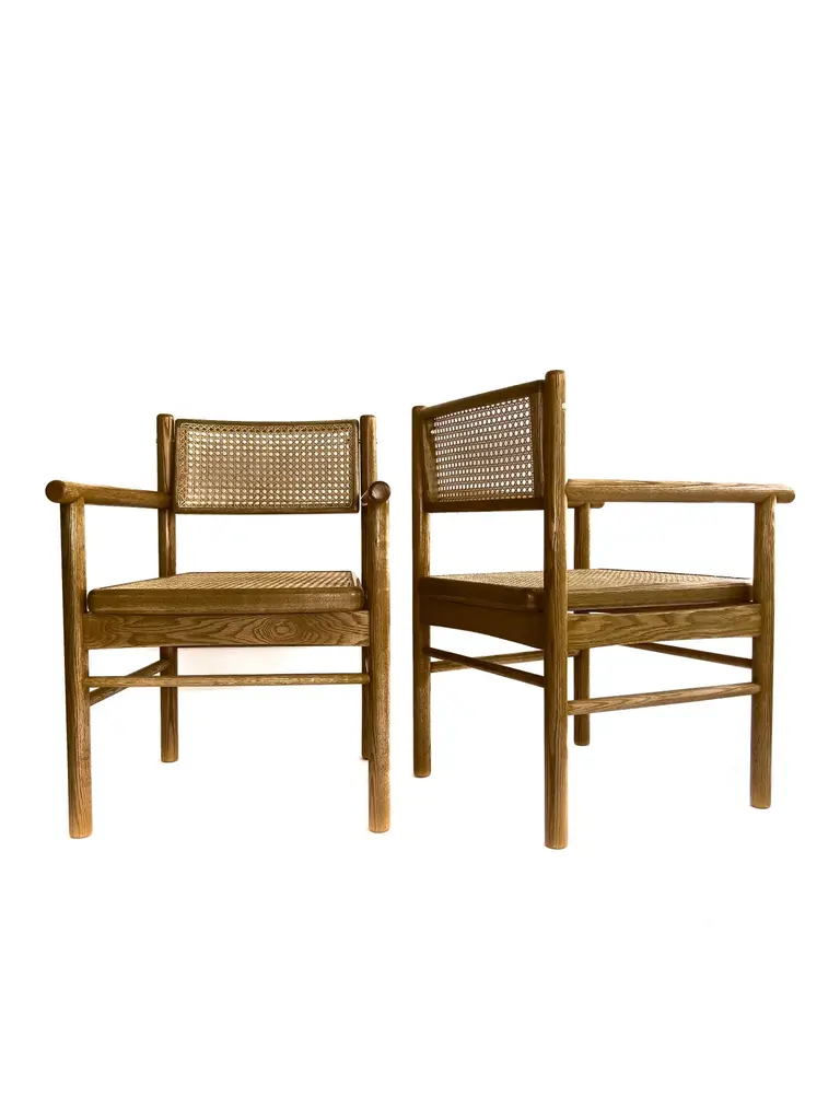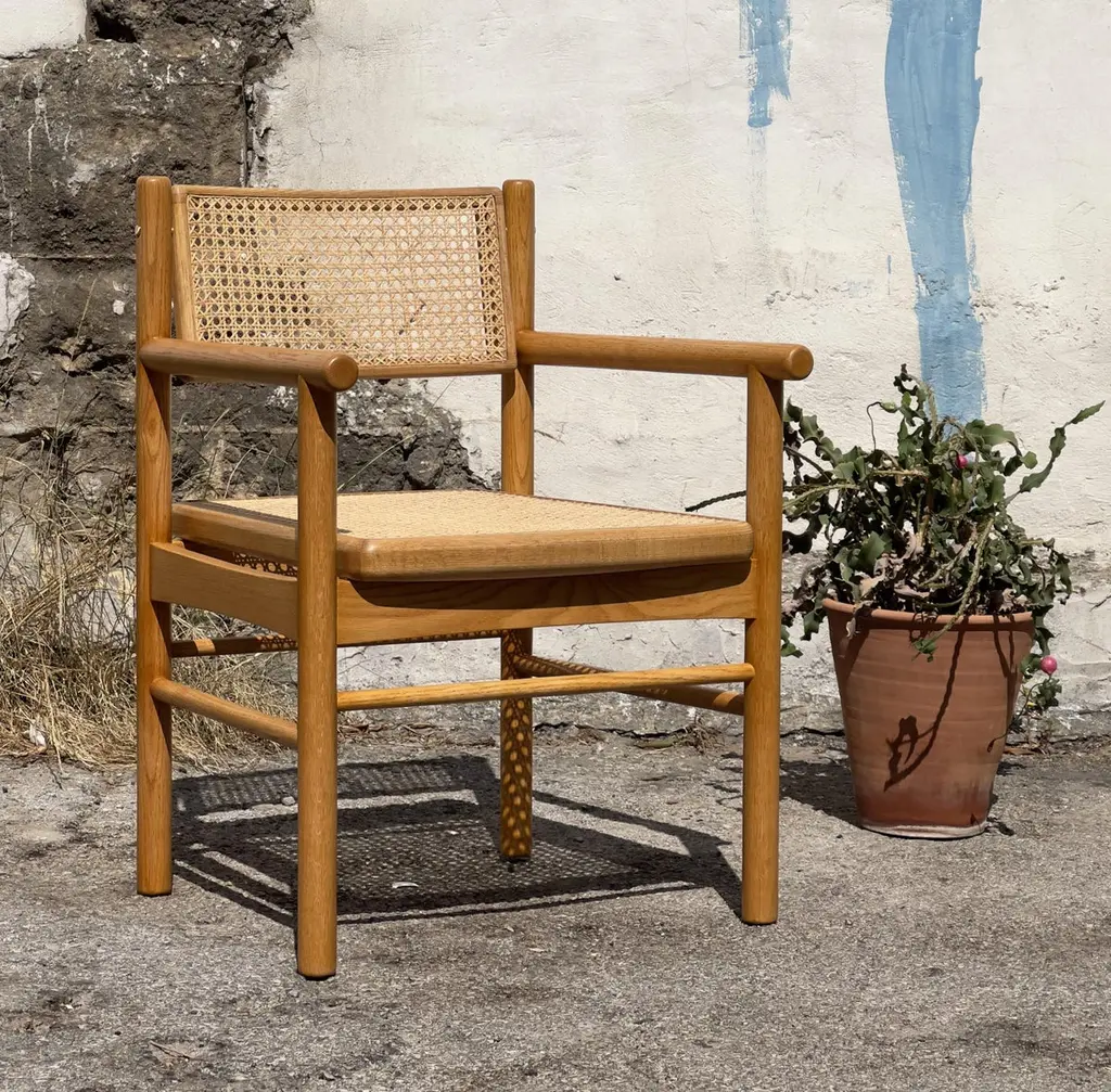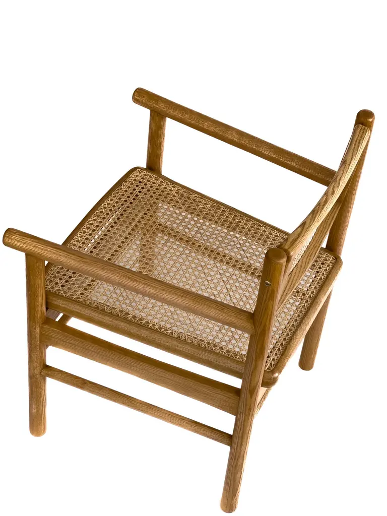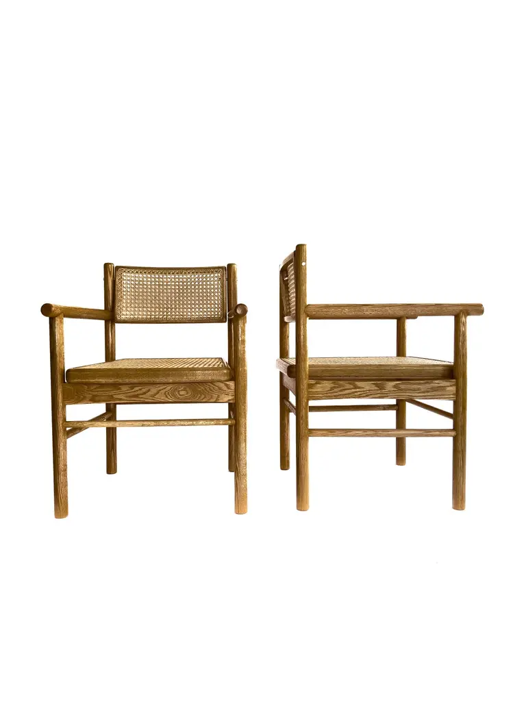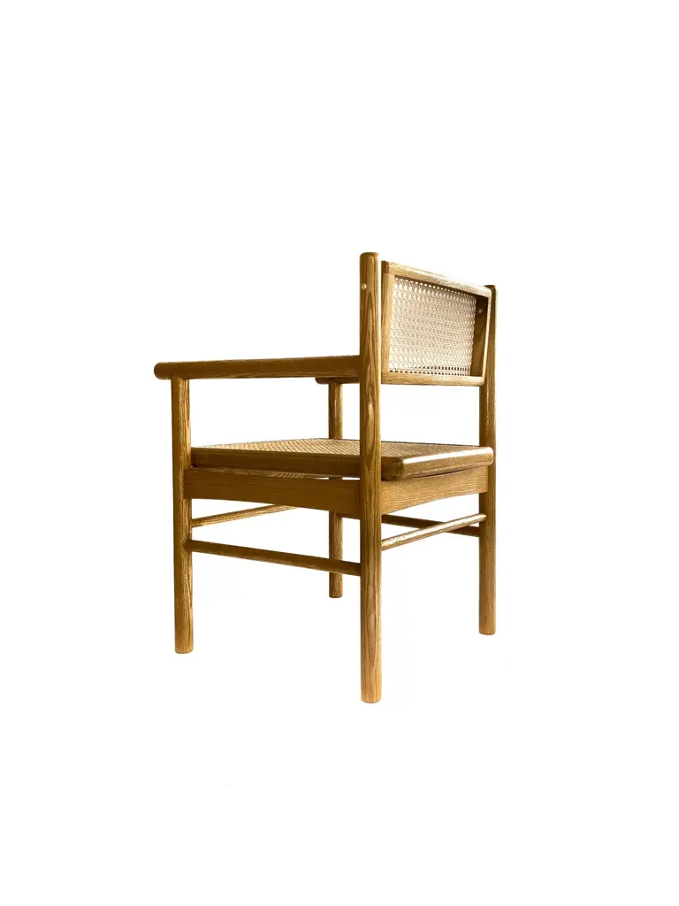 Mr. Cane is an architectural chair that combines versatility, comfort, and craftsmanship. Built in solid wood, it features a traditionally hand-caned seat, a swivel backrest, and sculptural armrests that add presence and support. The back is adjustable through our custom Lebanese sex bolt — a hand-turned brass detail inspired by the Chicago screw and the iconic Bic pen. This bespoke joinery element not only strengthens the chair’s structure by locking the carved wooden legs securely in place, but also becomes a signature design feature. The swivel backrest encourages movement and relieves stress, while the clean lines and thoughtful detailing highlight the beauty of natural wood. Mr. Cane is a timeless piece designed for both daily use and distinctive spaces.