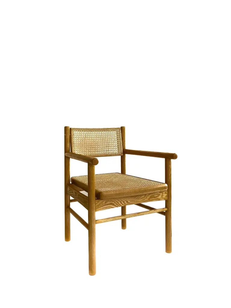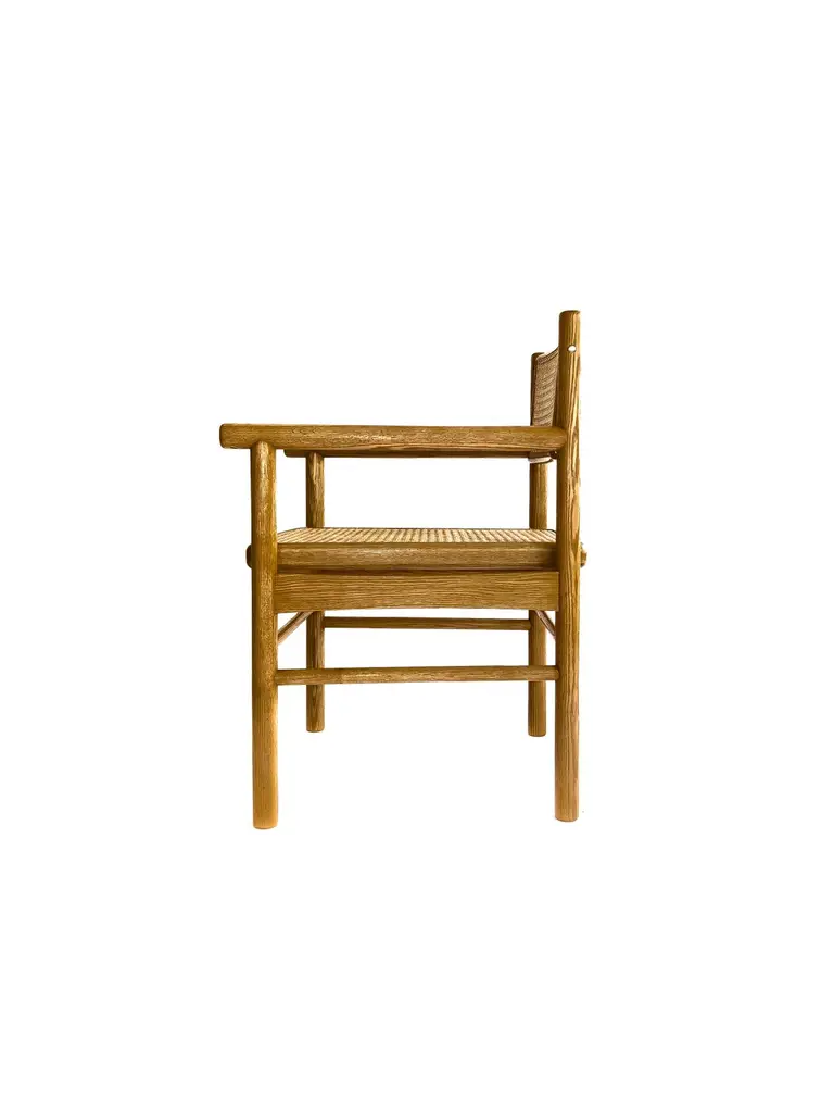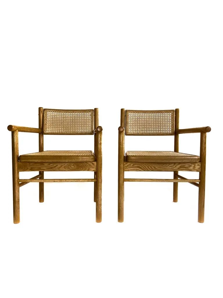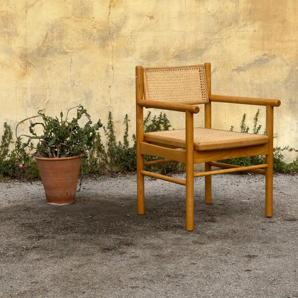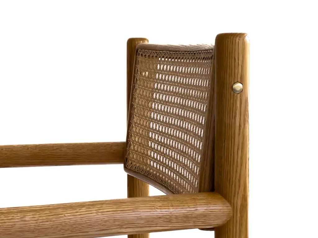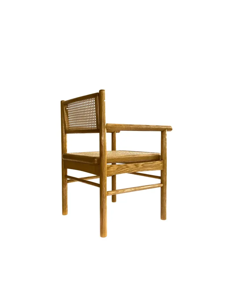 Mr. Cane is an architectural chair that combines versatility, comfort, and craftsmanship. Built in solid wood, it features a traditionally hand-caned seat, a swivel backrest, and sculptural armrests that add presence and support. The back is adjustable through our custom Lebanese sex bolt — a hand-turned brass detail inspired by the Chicago screw and the iconic Bic pen. This bespoke joinery element not only strengthens the chair’s structure by locking the carved wooden legs securely in place, but also becomes a signature design feature. The swivel backrest encourages movement and relieves stress, while the clean lines and thoughtful detailing highlight the beauty of natural wood. Mr. Cane is a timeless piece designed for both daily use and distinctive spaces.