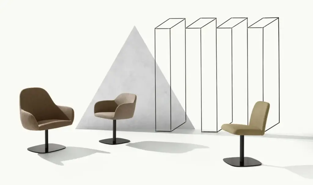Swivel lounge armchair with central steel base. Upholstered seat and back.Optional: -Kick-back device + tilting system (cod. 676-SRB)Et al. presents the new collection of upholstered seats: Myra, designed by Emilio Nanni.Following the company’s spirit, this family of upholstered seats testifies that idea of comfort that the products Et al. ensure. A seat with an especially contemporary volumes layout, in accordance with the international taste that is attentive to design mood, Myra lends itself to instil its reassuring elegance to any environment. ‘The Curve is the subliminal shape that recalling a desire to wrap up as well as the comfort implied by the ancestral idea of trust, protection, and rest represents’ Emilio NanniThe curve is its distinctive feature, along with the extreme attention to detail. The contrasting stitching and the many possible combinations of colours and materials give the product a strong versatility. Myra, with its infinite option and its discreet yet equally strong style, satisfies every specific request of inclusion and attention to comfort, making it a good candidate to become a real long seller. The collection includes all types: side chair, armchair, high and low stool, lounge chair, and it is available in two different frame options: beech wood or steel.