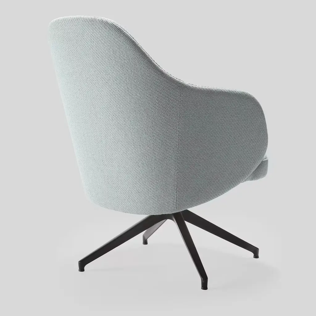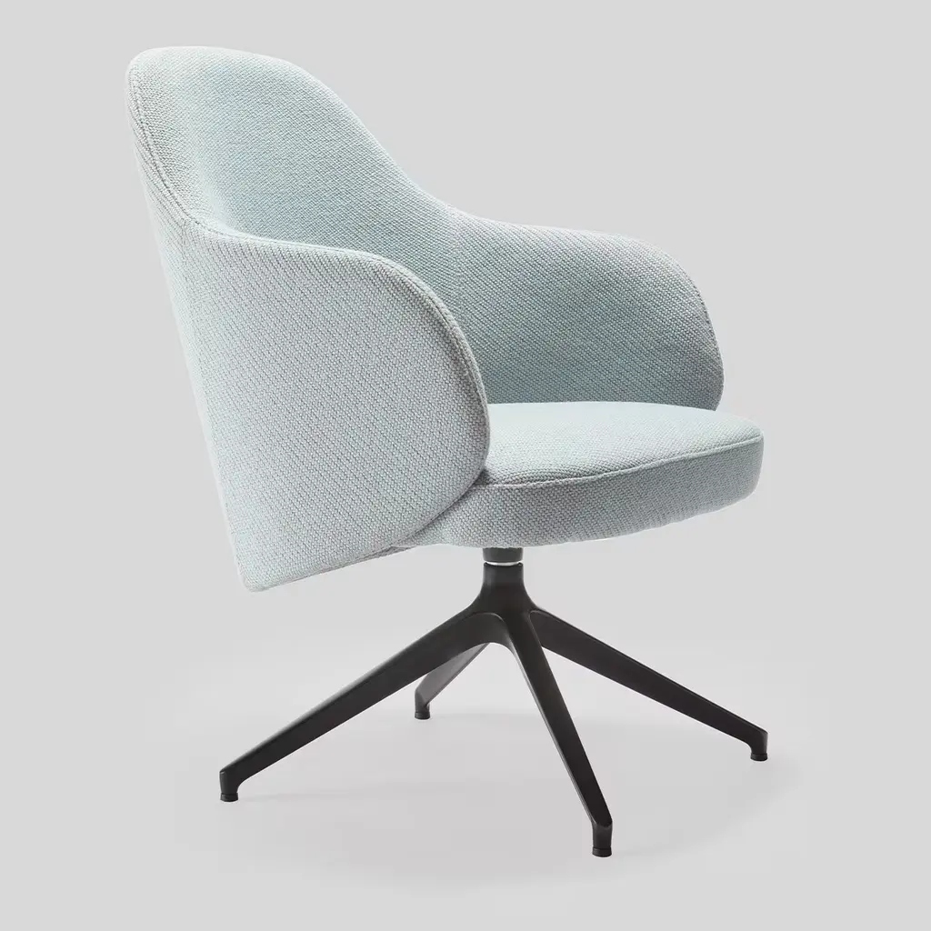 An exceptionally inviting seat solution, this armchair will make a charming and colorful addition to a modern home study or office. Resting on a swivel structure in matte black-finished metal, it features a large and welcoming seat with a tall backrest highlighted by elegant curves, and an exquisitely soft and fine light blue fabric upholstery. Please ask the Concierge for customization options.