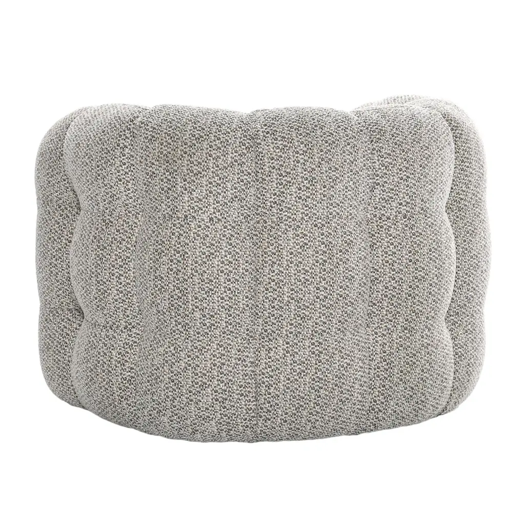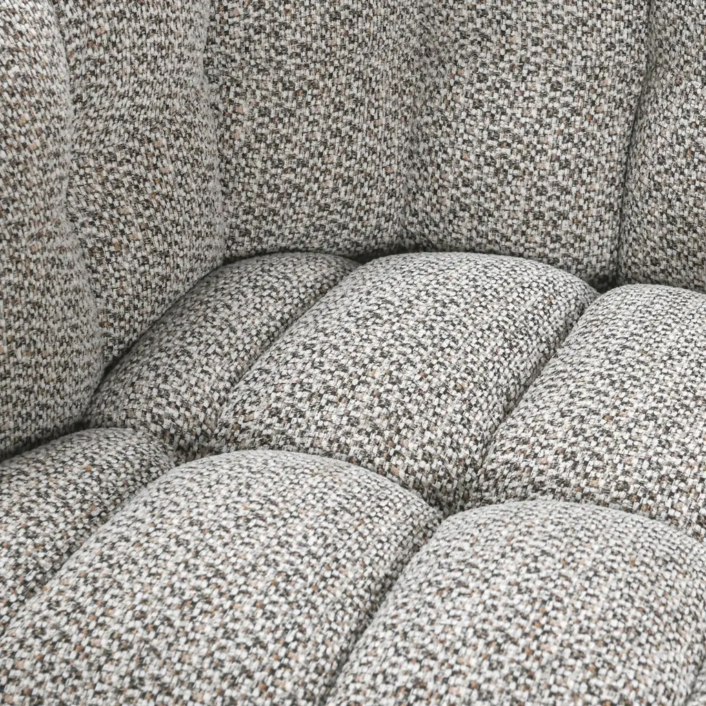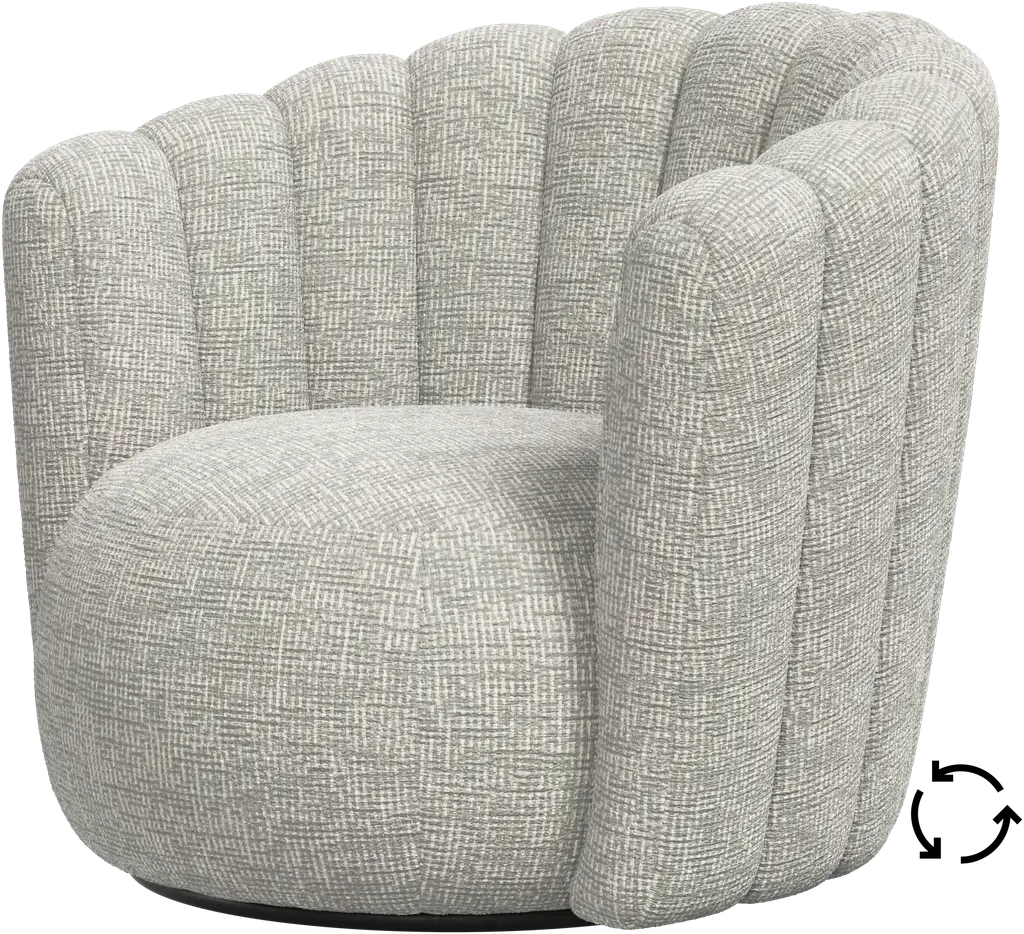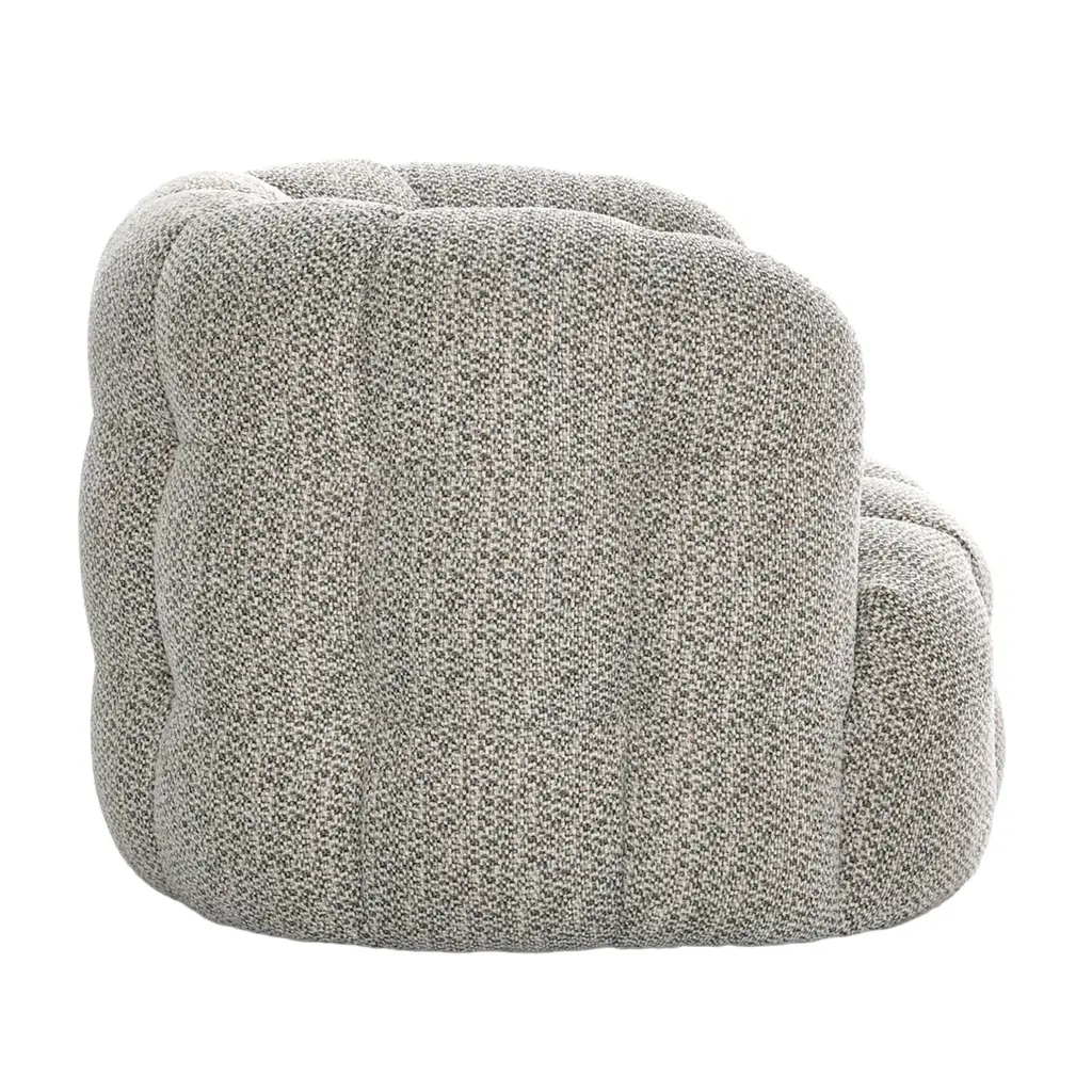 Comfy contemporary heather grey toned upholstered barrel style swivel chair. Round design with tufted detail giving a plush appearance. Soft textured fabric with mixed yarns of greys, tans, and browns. This chair weighs approx. 80 lbs.