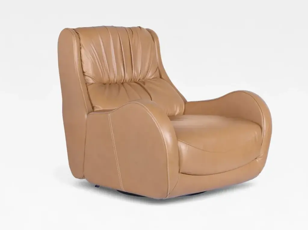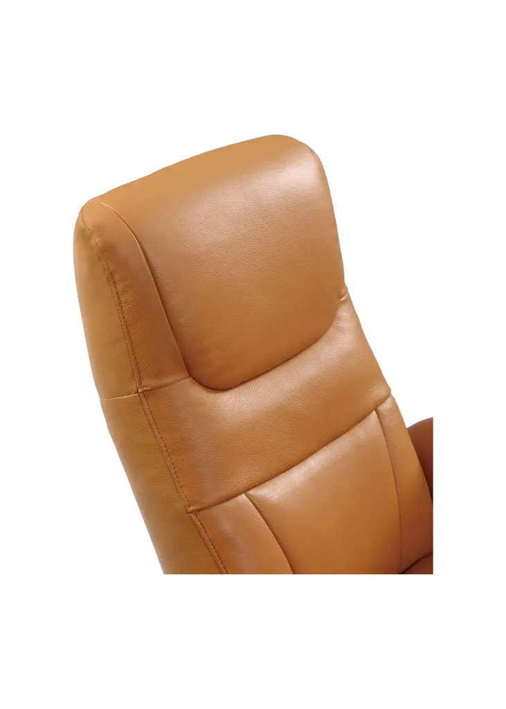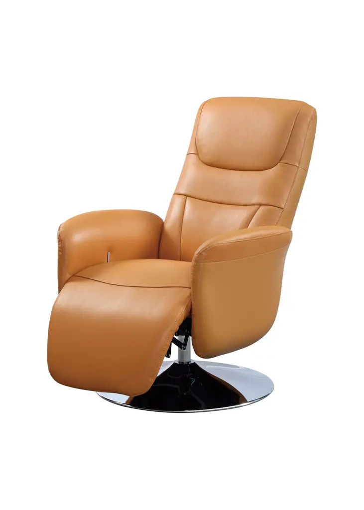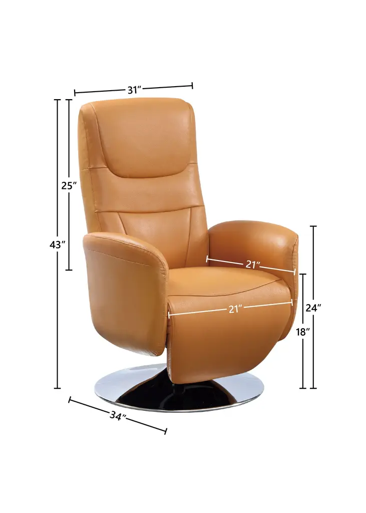 Comfort and style don't have to be mutually exclusive. This modern, elegant seat comes upholstered in top grain leather for a supple cushion, and its small footprint is thanks to the simple stainless steel base. Ergonomically designed for maximum comfort, you can adjust the back and leg rests independently to find your perfect position. This chair comes fully assembled, so no hassle is required - simply plug in and veg out.Features:Top grain leather upholstery seat with matched sidesTwo reclining motors offer separate adjustment for leg and head restsConvenient USB charging port for devicesErgonomically designed for maximum supportStainless steel swivel baseElegant and modern designNo assembly required - just plug in and relax!Available in dusty blue or warm tanDimensions:Assembled Product: 31 inches wide x 34 inches deep x 43 inches highSeat Width: 21 inchesSeat Depth: 21 inchesSeat Height: 18 inchesBack Height: 25 inchesArm Height: 24 inchesWorld Source Design shows that great looks don't have to sacrifice an ounce of style. Combining ergonomic design, top quality materials, and sleek designs, our furniture collection will stand out in any modern home. Relax and recline in a world-class import-World Source Design has your back. Literally.