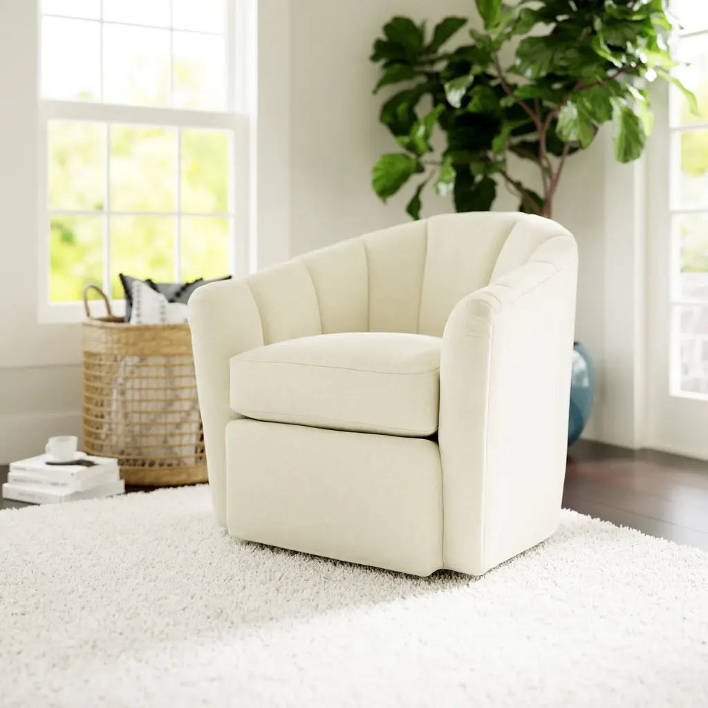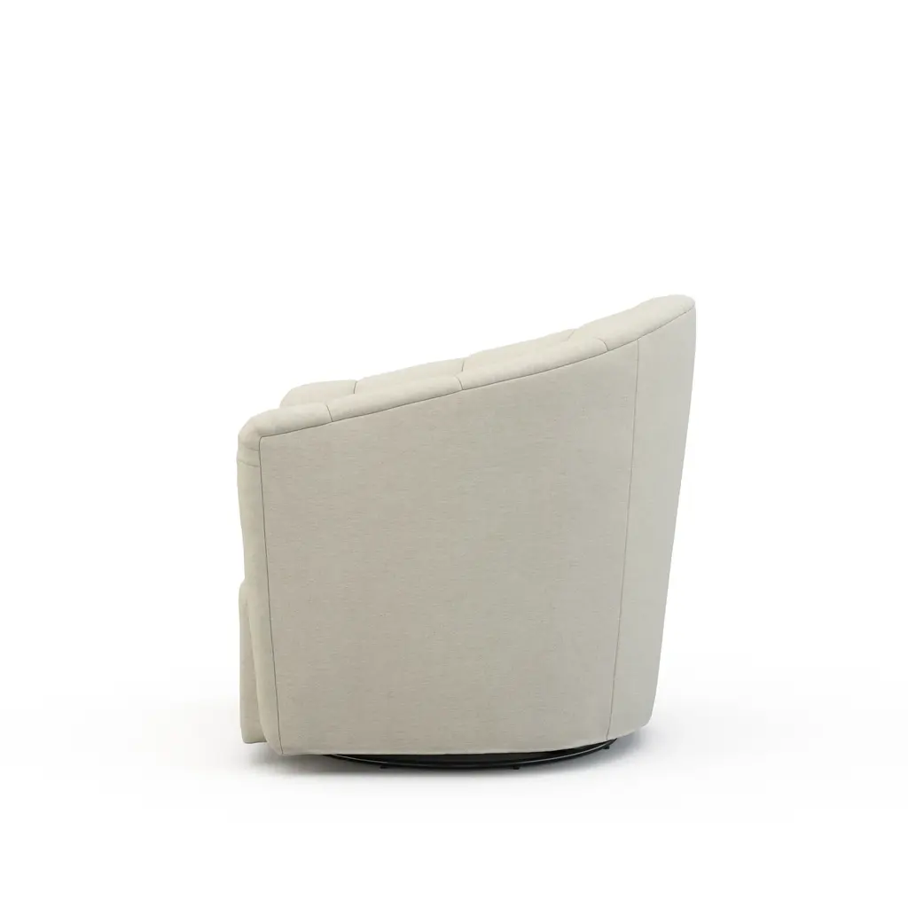 The channel back upholstery of this Noah Swivel Chair pairs with the plush seat cushion to create an altogether luxurious experience, both visually and in terms of comfort. The Ultra Down seat pairs with the round barrel-style frame to whisper promises of chic luxury. Ships In 8-10 Weeks Tight back One loose seat cushion As Shown Fabric: Dundee Natural If you choose to purchase COM, once you have placed your order a customer service rep will contact you regarding where to send your fabric. Please note that current lead time is 8-10 weeks once your fabric arrives at the factory, and if unused fabric is under 1.5 yards, it cannot be sent back to you.This product can be special ordered in additional fabrics, leathers, and cushion fillings. Click here to email us for for additional information about special ordering.This image is for illustrative purposes only. The colors shown are accurate within the constraints of lighting, photography, and the color accuracy of your screen.