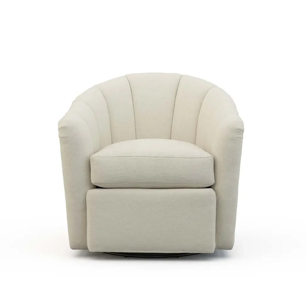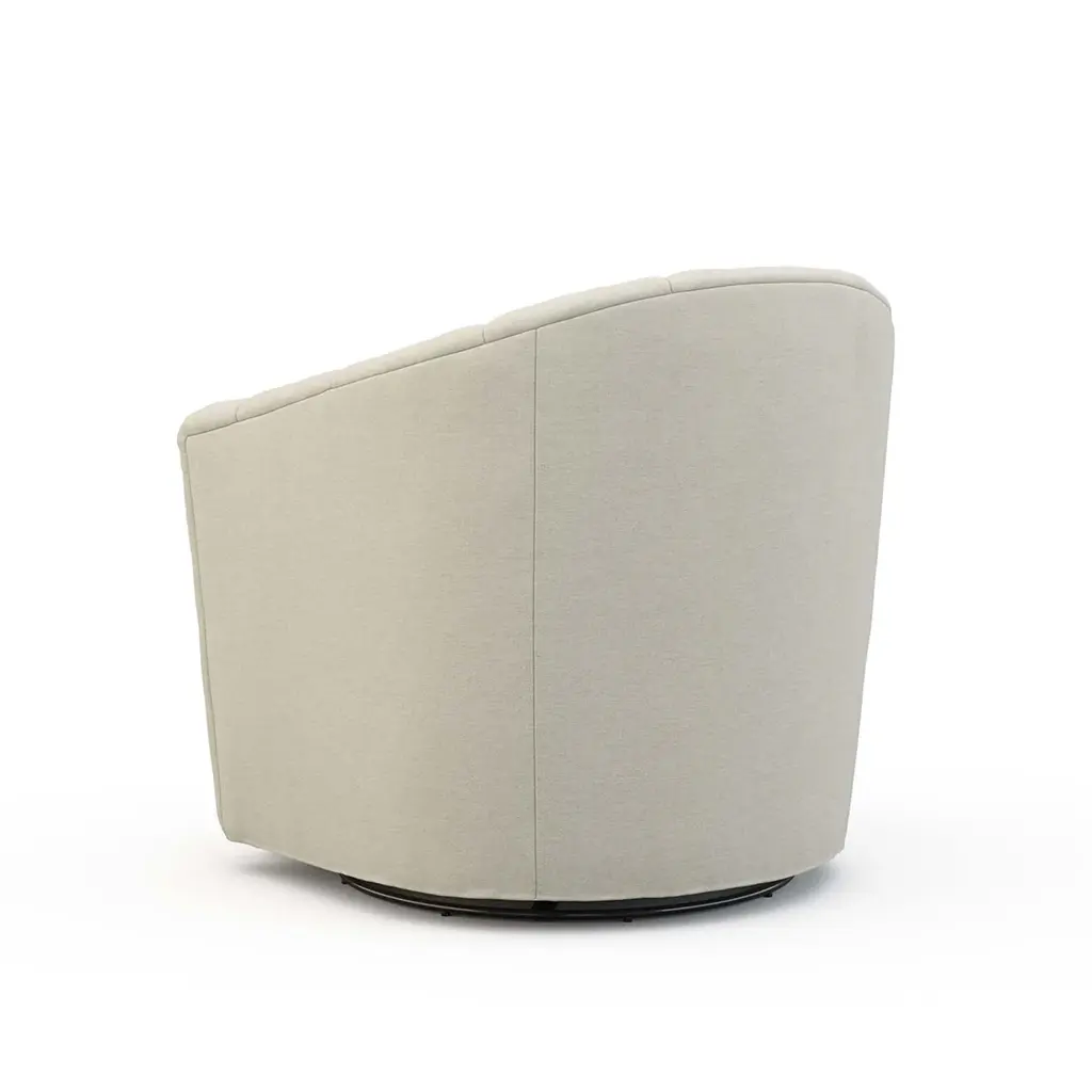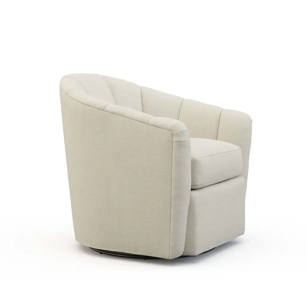 The channel back upholstery of this Noah Swivel Chair pairs with the plush seat cushion to create an altogether luxurious experience, both visually and in terms of comfort. The Ultra Down seat pairs with the round barrel-style frame to whisper promises of chic luxury. Ships In 8-10 Weeks Tight back One loose seat cushion As Shown Fabric: Dundee Natural If you choose to purchase COM, once you have placed your order a customer service rep will contact you regarding where to send your fabric. Please note that current lead time is 8-10 weeks once your fabric arrives at the factory, and if unused fabric is under 1.5 yards, it cannot be sent back to you.This product can be special ordered in additional fabrics, leathers, and cushion fillings. Click here to email us for for additional information about special ordering.This image is for illustrative purposes only. The colors shown are accurate within the constraints of lighting, photography, and the color accuracy of your screen.