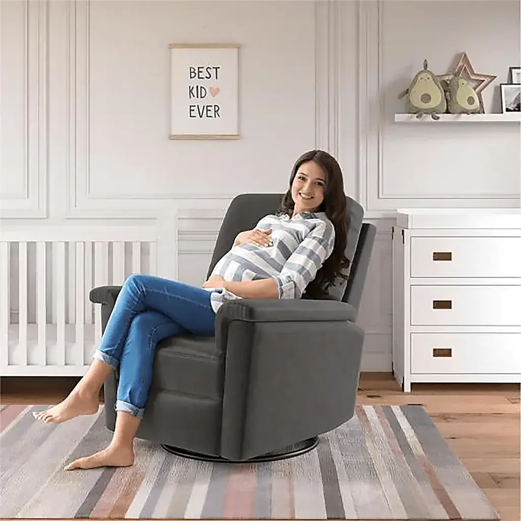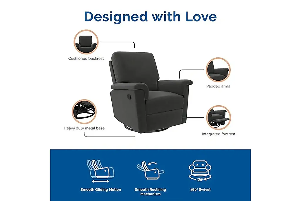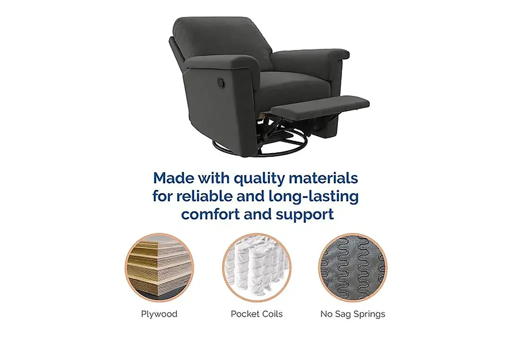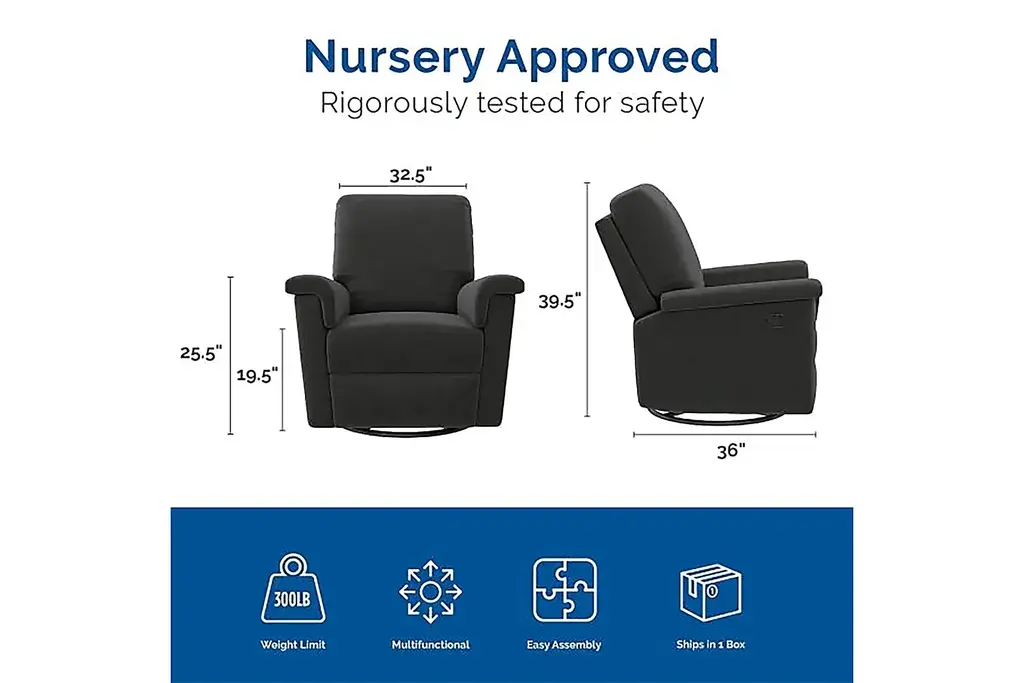 Experience next-level comfort with the Diodi 3-in-1 Gliding Swivel Recliner, designed to exceed your expectations. Unlike typical nursery chairs, the Diodi sleek, modern design fits seamlessly into any living room, bedroom, or den. It features smooth gliding motion, a 360-degree swivel, and a handle-operated reclining functionperfect for soothing your baby or simply relaxing. Plush armrests, a supportive cushioned back, and a high-density foam seat with pocketed coils offer unmatched comfort. Built with a durable plywood frame, steel reclining system, and sag-free spring foundation, it's the perfect addition to your child's room. Customer assembly is required.