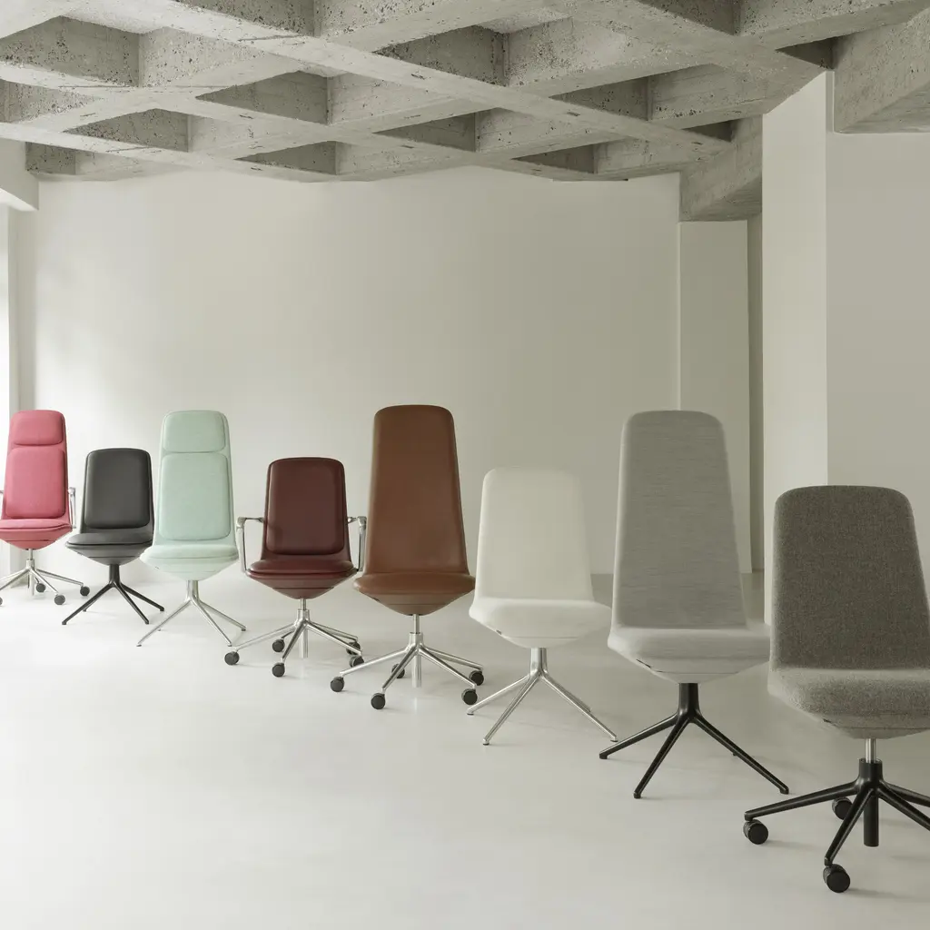 Offering ultimate ergonomic support, Normann Copenhagen’s higher-back version of Off joins the lineup that combines functionality as well as a sleek design that camouflages its inner mechanics. On a 4-star aluminum swivel base, the comfort-inducing chair is constructed from steel-reinforced rigid PU foam and sheathed in custom leather or textile upholstery.