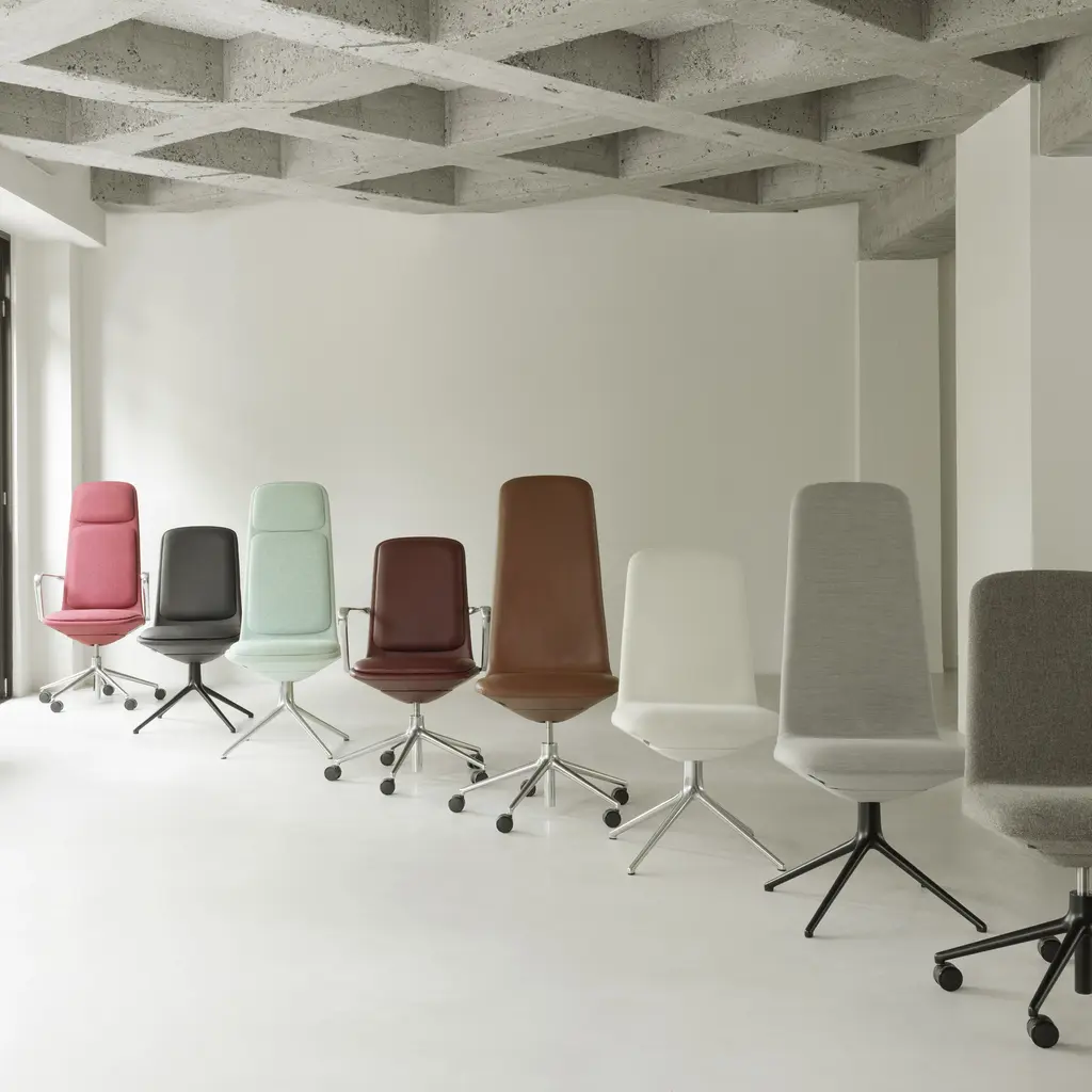 Office chairs were often long on functionality but short on eye-appeal until designer Simon Legald’s Off, with its mechanics smartly sheathed from view. With optimal support for hours at the desk, the High model with an added seat cushion is made from rigid PU foam with an inner steel reinforcement and full upholstery on a sturdy aluminum 4-star swivel base.