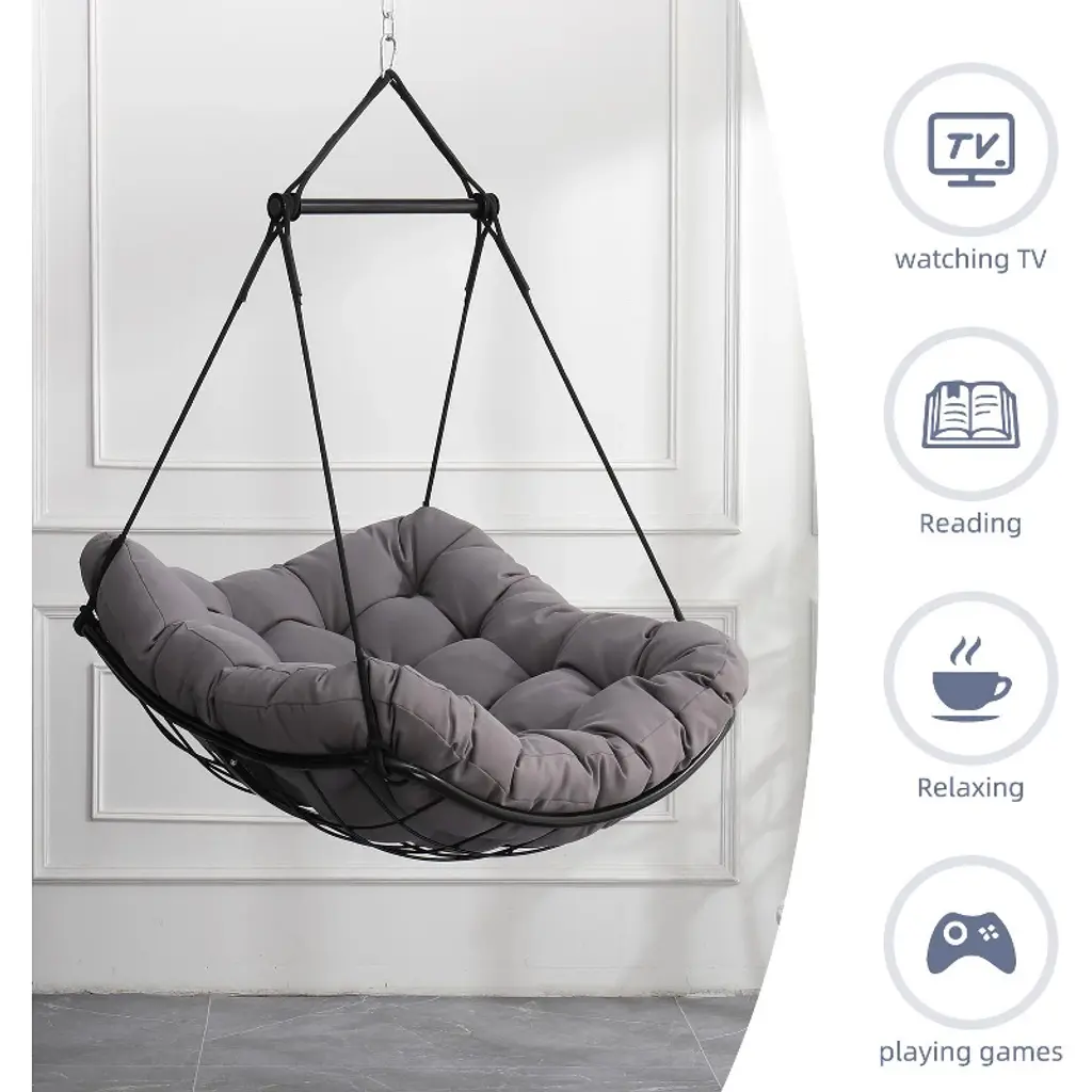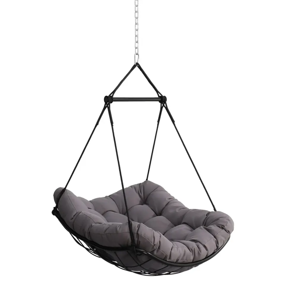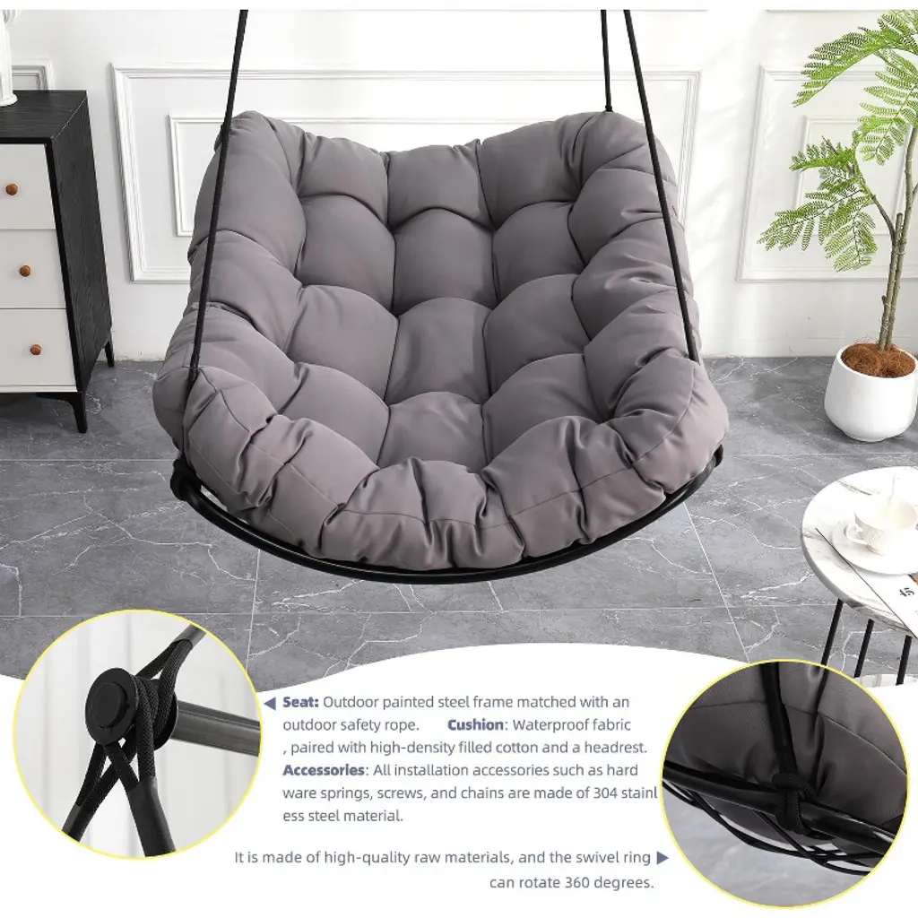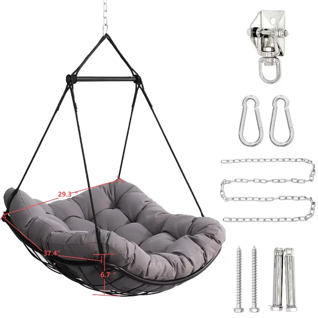 This premium hanging hammock chair features an oversized thick cushion made of breathable cotton-polyester blend for ultimate comfort. The outdoor swing chair comes with a powder-coated steel frame, 1.2m adjustable chains and 360° swivel rings for secure hanging. Perfect for patios, gardens or indoor spaces, this patio hanging chair includes complete installation hardware for easy setup.