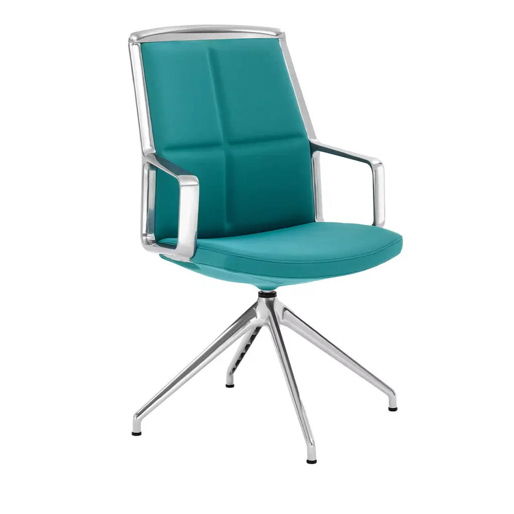 Omega is a family of chairs with linear shapes and a particular texture, characterized by its succession of lines, in a modern, elegant style in the thermoformed seat, or in a lighter mesh version. The Omega seat adds sophisticated decor to every office. Meeting armchair in flame-retardant mesh, swivel, fixed height, fixed armrests in polished aluminum, 4-spoke flat base in polished aluminum, mesh upholstery color white.