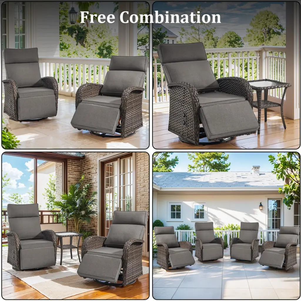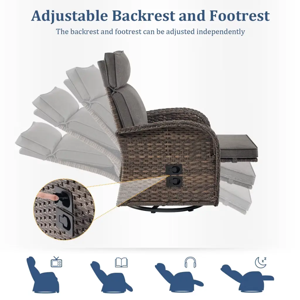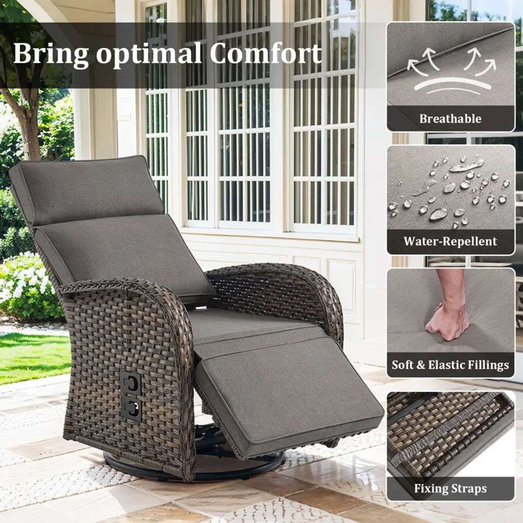 Specification Seat Frame Material:Steel Cushions Included:Yes Cushion Durability:UV Resistant Special Feature:Adjustable Backrest Seat Material Type:Foam Room Type:Poolside, Garden, Porch, Balcony, Patio Garden Weight Capacity:300 lb. Product Care:Removable cushion easy to replace and wash About this item 1. Multi-Angle Reclining Design (108° to 155°): Enjoy ultimate relaxation with patio recliner lounge chair, featuring a smooth pneumatic adjustment system. Effortlessly change the backrest and footrest angles from 108° to 155° by pulling the side lever to find your most comfortable lounging position. Whether you're sitting up to read or fully reclined to nap, this reclining patio recliner lounge chair adjusts to your needs. 2. Ergonomic Comfort & Support: Designed with your comfort in mind, this outdoor recliner chair features a curved backrest, extended footrest, and ergonomic armrests to provide full-body support. The cushioned seat and backrest are extra deep and wide, allowing you to sink in and relax. The reclining patio chair offers excellent lumbar support, making it ideal for long hours of outdoor leisure. 3. All-Weather Durability: Built to last, this outdoor recliner chair is made with a rust-resistant, powder-coated steel frame, and handwoven PE wicker The premium wicker is designed to withstand outdoor elements such as rain, sun, and wind, ensuring long-lasting beauty and performance. This outdoor pool recliner is built for year-round use, from poolside lounging to backyard relaxation. 4. High-Quality Cushions with Easy Maintenance: The outdoor pool recliner comes with high-density foam cushions that provide extra comfort and support. These cushions are covered in fade-resistant, water-resistant fabric that can handle outdoor conditions. They are also removable and easy to clean, so you can keep your outdoor recliner chair looking Firesh and vibrant season after season. Simply unzip the cushion covers and toss them in the wash for easy care. 5. Quick Assembly & Excellent Service: Our patio recliner chair is easy to assemble with clear instructions and all necessary parts included in the package. You can set it up in less than 20 minutes without any hassle. Plus, our dedicated customer service team is always available to answer any questions or address concerns. Buy with confidence knowing you're supported by excellent service and a durable, high-quality product. Features Adjustable Reclining Position - The Gymojoy Patio Reclining Lounge Chair features an adjustable reclining position for maximum comfort. Whether you're reading, sunbathing, or simply relaxing outdoors, you can find the perfect angle that suits your needs. Strong Extendable Metal Frame - Crafted with a strong extendable metal frame, this outdoor chair is designed to withstand the elements and provide long-lasting durability. It's perfect for patios, decks, and outside spaces. Comfortable Cushions - The chair comes with comfortable cushions that add an extra layer of comfort. These cushions are perfect for long hours of sitting, making it an ideal outdoor reading chair. FABULOUS BASE DESIGN- The base of outdoor swivel patio chair features the innovative and comfy swivel design, which means outdoor swivel chairs can swivel 360° Fireely, making it great outdoor lounge chair for unwinding. Packing List 1* Patio Lounge Chair with cushion 1* Side Table 1* All hareware and manual