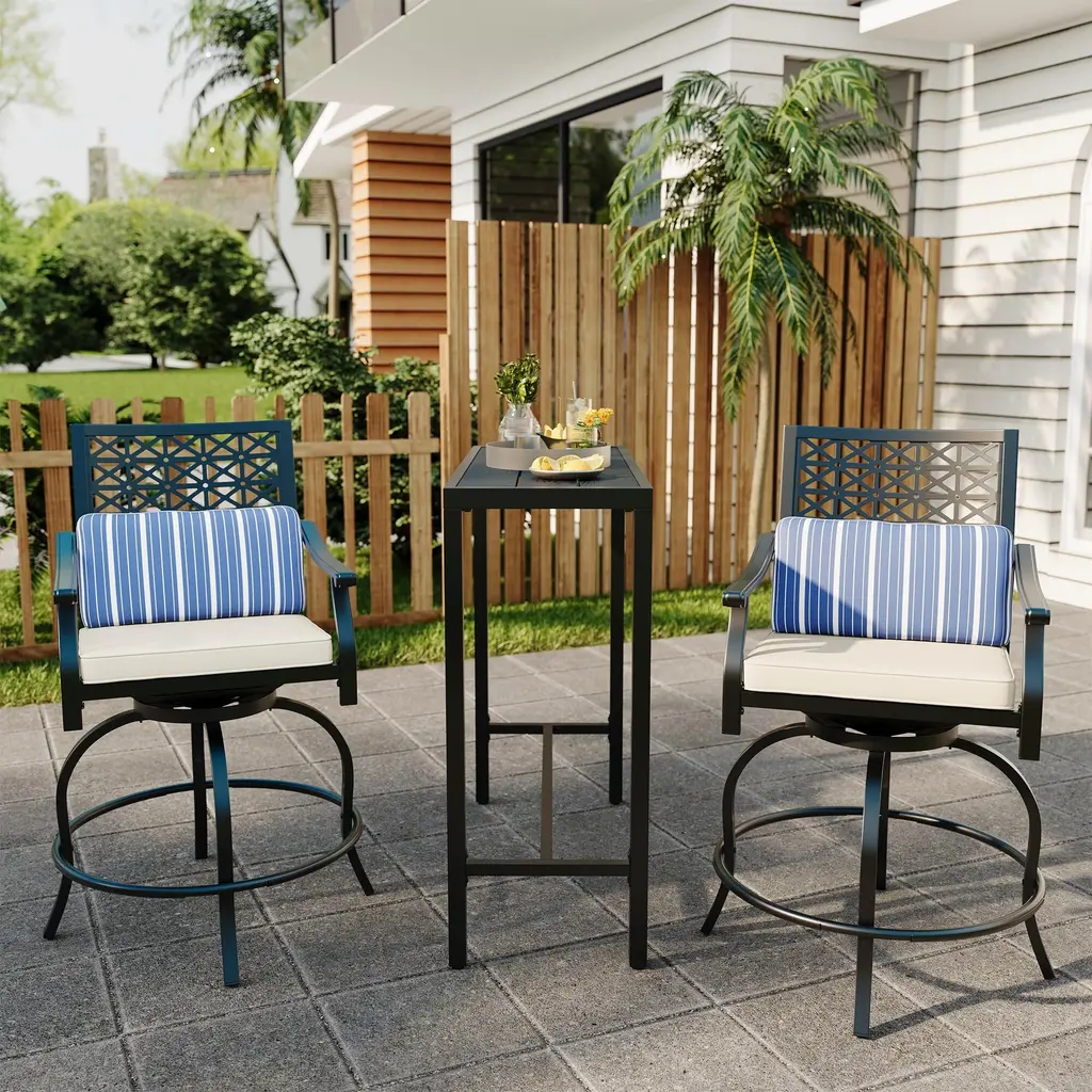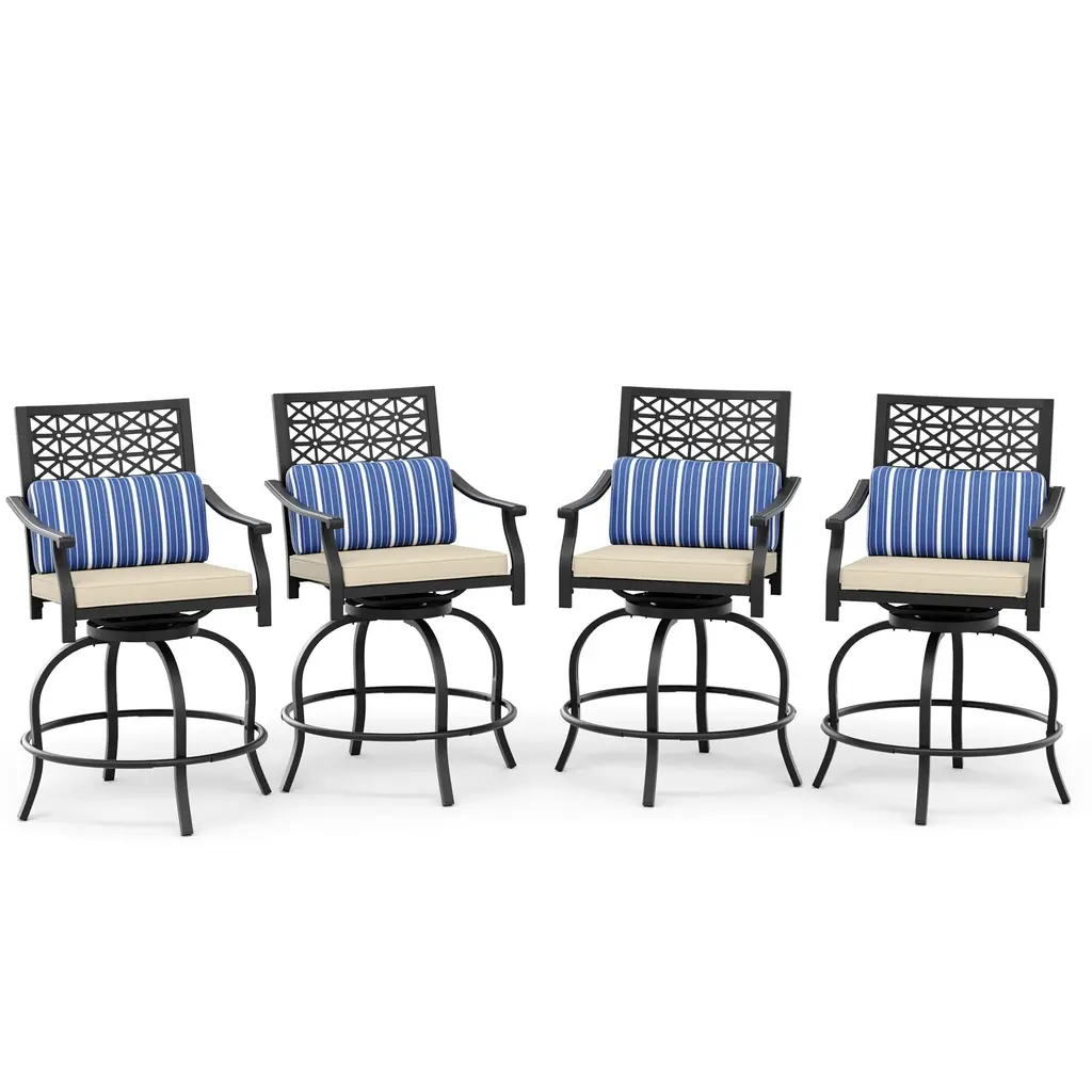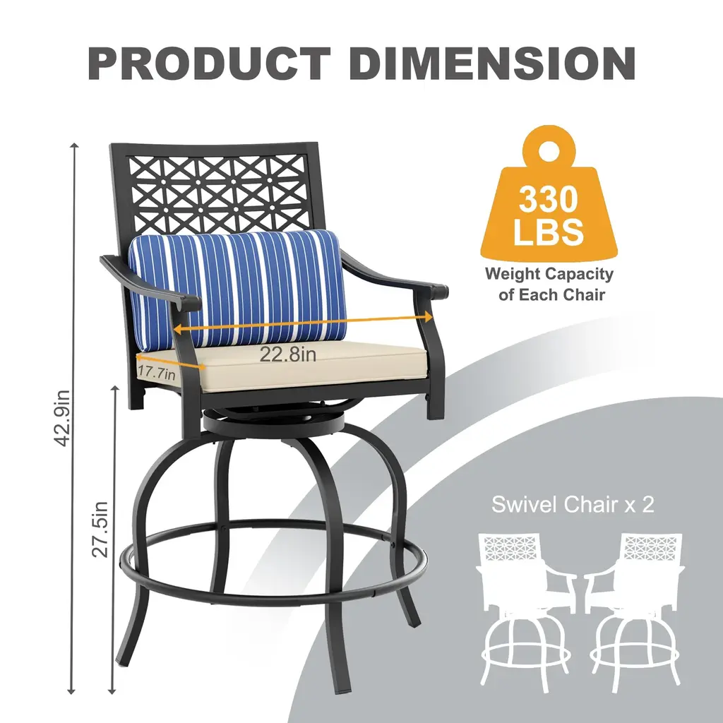 360 DEGREE SWIVEL BAR CHAIRS - 360 degree rotation is a special design about this outdoor bar stool with cushion. The ergonomic design of the seat and backrest brings you comfortable dining and leisure time in any posture. It allows you to talk with others from various directions or enjoy the scenery from different angles, maximizing the enjoyment of your break time DIMENSION(FULLY ASSEMBLED) - Patio swivel bar stools set of 2/4: W 22.8" x L 22.8" x H 42.9", Seat Height: 27.5". Weight Capacity: 330 lbs. 2*Seat Cushion. Two bar stools are included. These chairs are built to be level with most bars and come with a wide seat and armrests for hours of seated relaxation HUMANIZED DESIGN - Boasting curved backrests and ergonomic armrests, these outdoor counter top swivel bar stools deliver a cozy sitting experience to you. Moreover, the comfortable footrest will make you feel more relaxed. The stable base ensures the safety of the chair, and the four outer bowed legs are connected by metal rings SWIVEL PATIO BAR STOOLS WITH CUSHIONS - These outdoor counter height stools come in black metal frame and beige cushions, easily goes with any decoration. This set of two swivel bar stools features a rust-resistant cast aluminum frame with a delicate antique pattern, creating a romantic European-inspired look ideal for outdoor living spaces like gardens, porches, or yards DUTABLE CONSTRUCTION - We pick a classic and attrative back pattern for this bar chair. Metal steel frame with rust-resistant old craft e-coating makes it look retro, traditional and all-weather proof which can last for many rears. The bar height patio chairs are easy to assemble with detailed installation manuals and complete accessories
