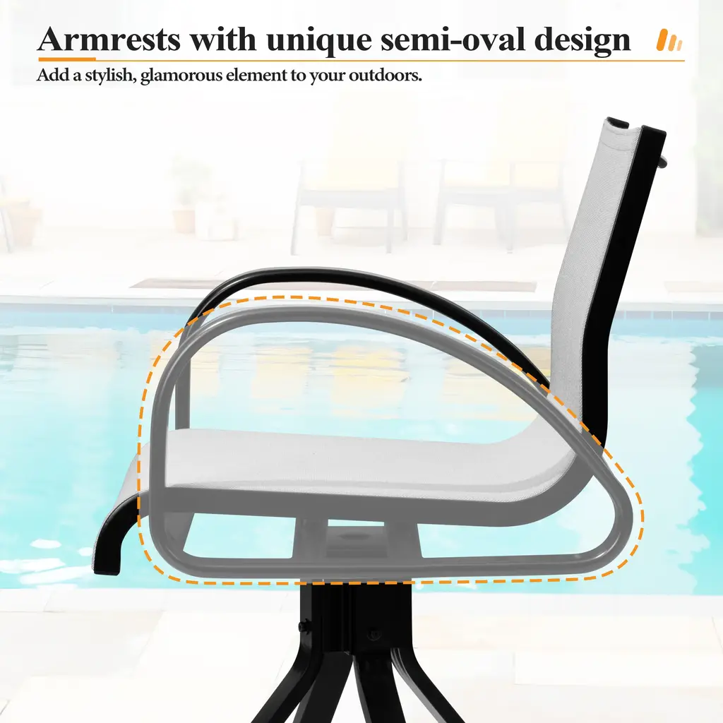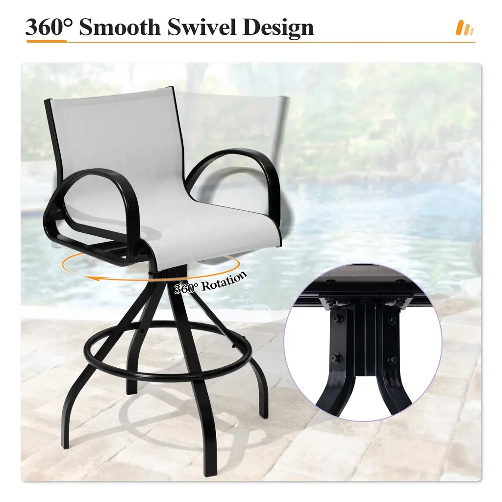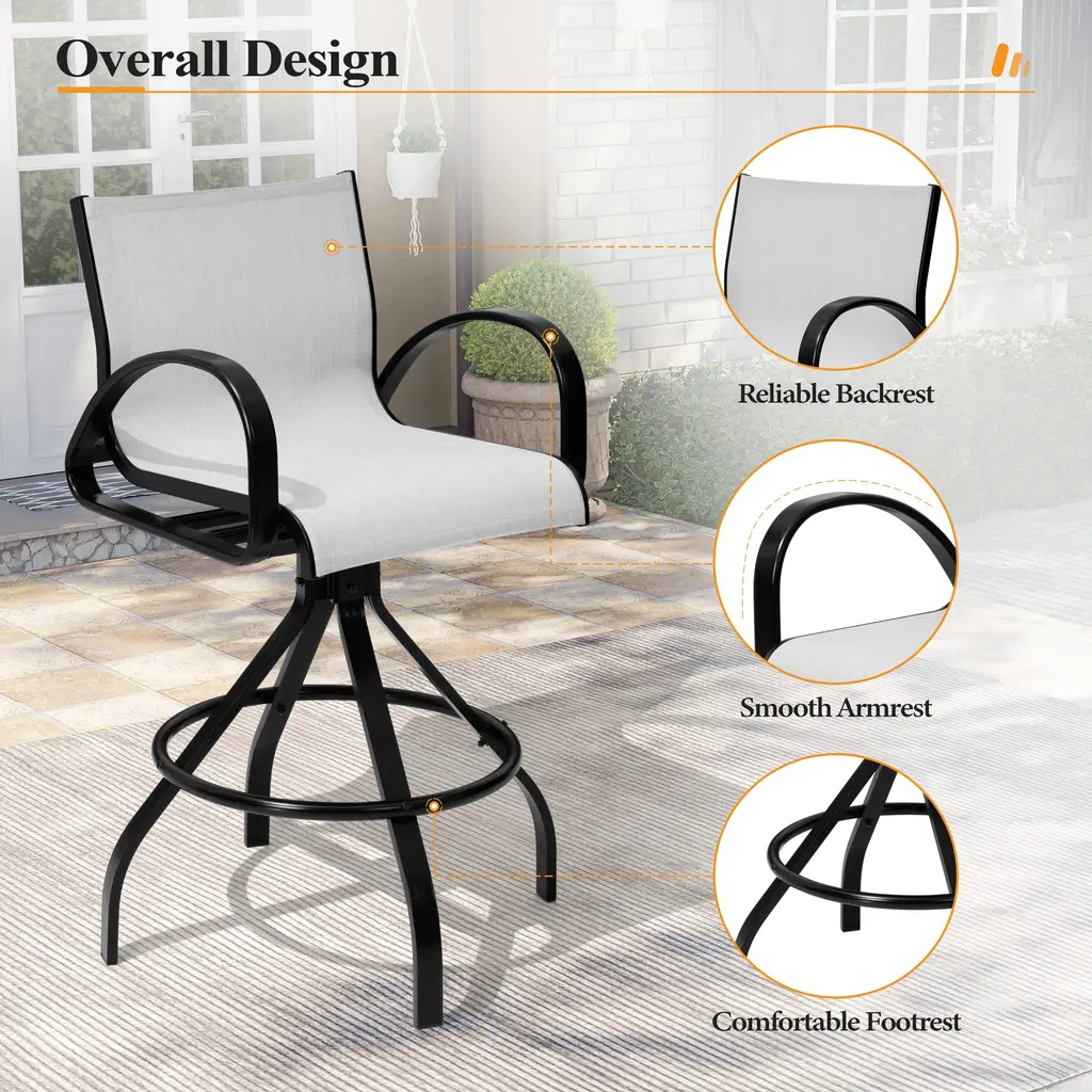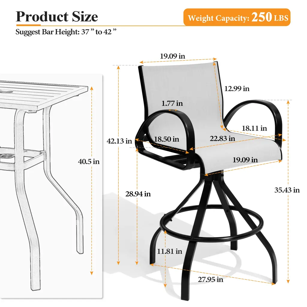 Crestlive Products outdoor patio swivel bar chair sets perfectly create the mood for great conversation and cafe-style dining—the ideal choice for outdoors amusement, such as garden, porch or yard. It features a aluminum frame for durable functionality and breathable sunbrella textilene sling for the outdoor vibe or blends seamlessly with your indoor decor.Features:Dimensions: