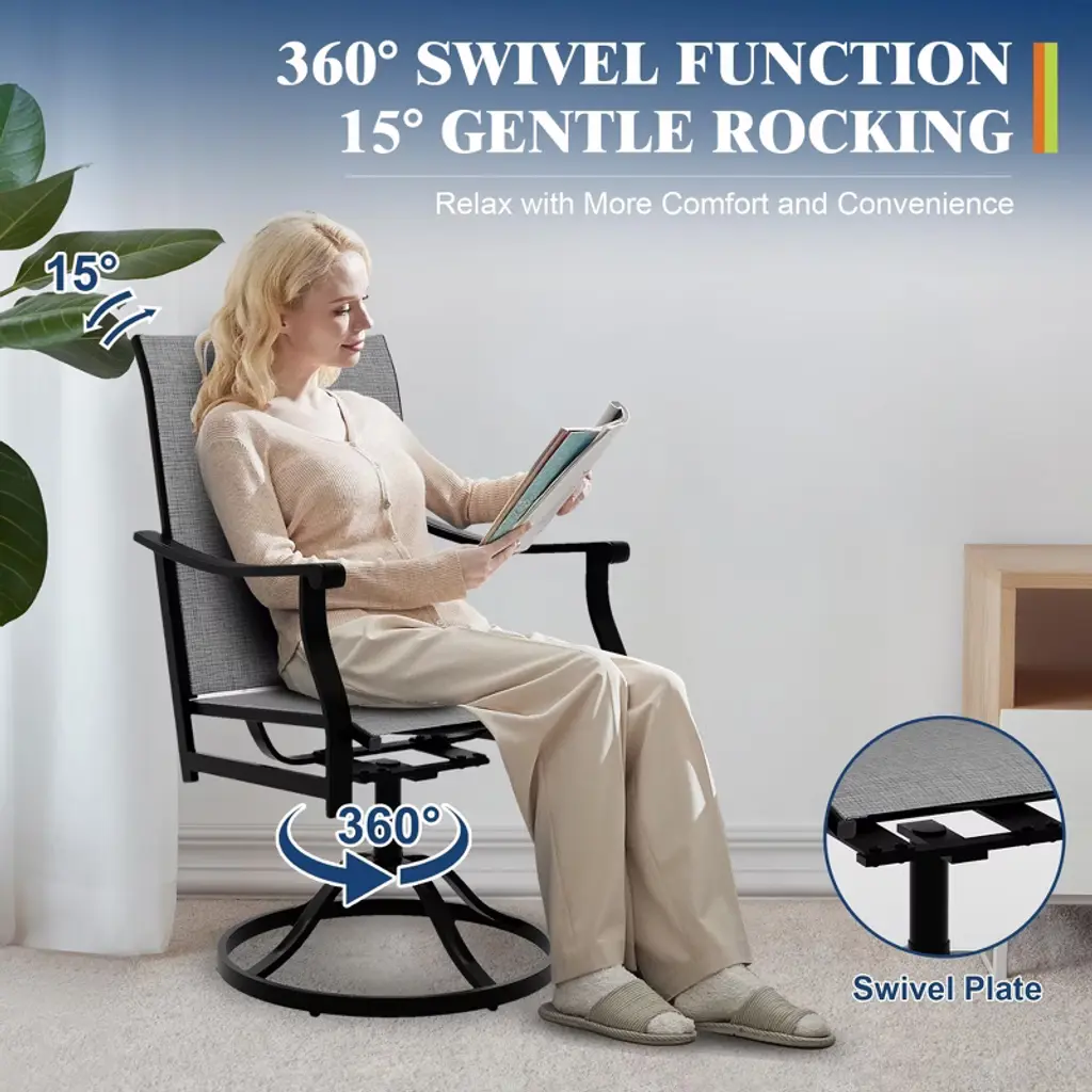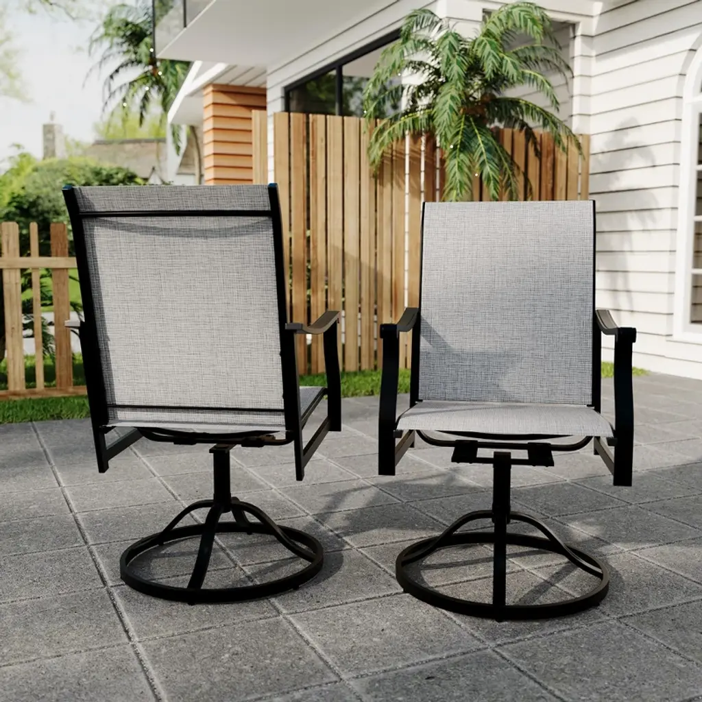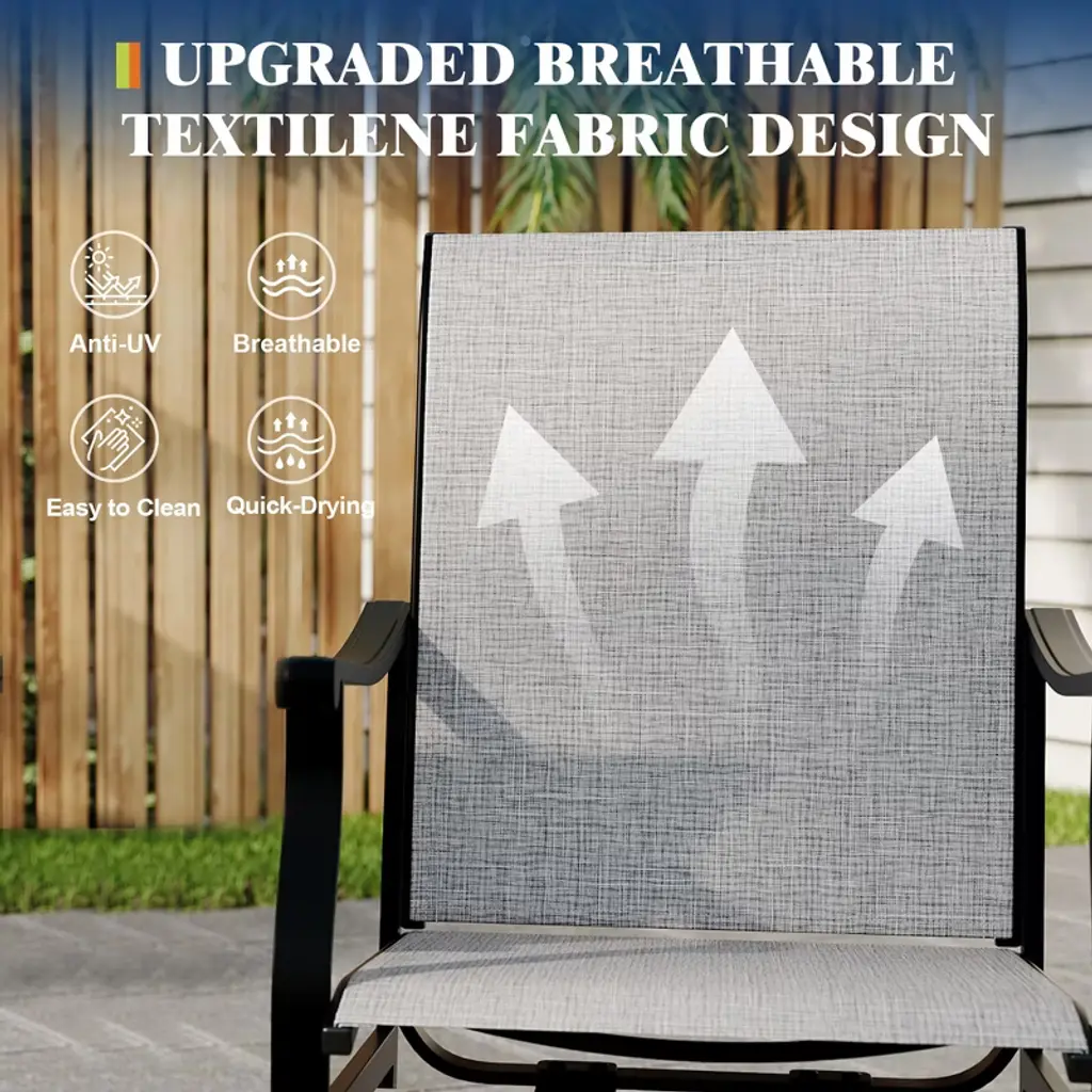 Our outdoor dining chairs swivel are made from a unique textile fabric that ensures vibrant colors that won't fade, offers comfort, and has good breathability. Plus, it’s quick drying, weather resistant, and UV resistant, making it easy to clean and maintain