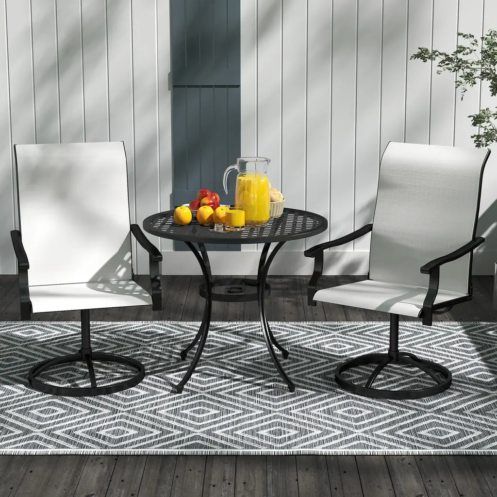Descriptions:Enjoy the blend of style and function with the Outsunny swivel patio chairs! Featuring a 360° swivel for effortless movement and breathable mesh fabric for cool, all-day comfort, the outdoor swivel chairs will be your new outdoor favorite. Weather-resistant and easy to clean, it's built for patios, porches, or poolside lounging. Relax, chat, or soak up the sun—these patio swivel chairs have everything you need for unbeatable outdoor vibes!Features:● Round swivel base enables 360-degree rotation● Breathable mesh fabric ensures cool comfort, durability, and easy maintenance● The ergonomic backrest and curved seat provide comfort, with a wave-shaped high back for added support;● Steel frame with powder-coated finish ensures a solid structure● Assembly requiredSpecification:● Material: Steel, Mesh● Overall Dimension: 24" W x 29.9" D x 42.5" H● Seat Size: 20.5" W x 20.5" D x 17.1" H● Armrest Height: 25.6"● Back Size: 27.2" L x 20.5" W● Weight Capacity: 265 lbs.